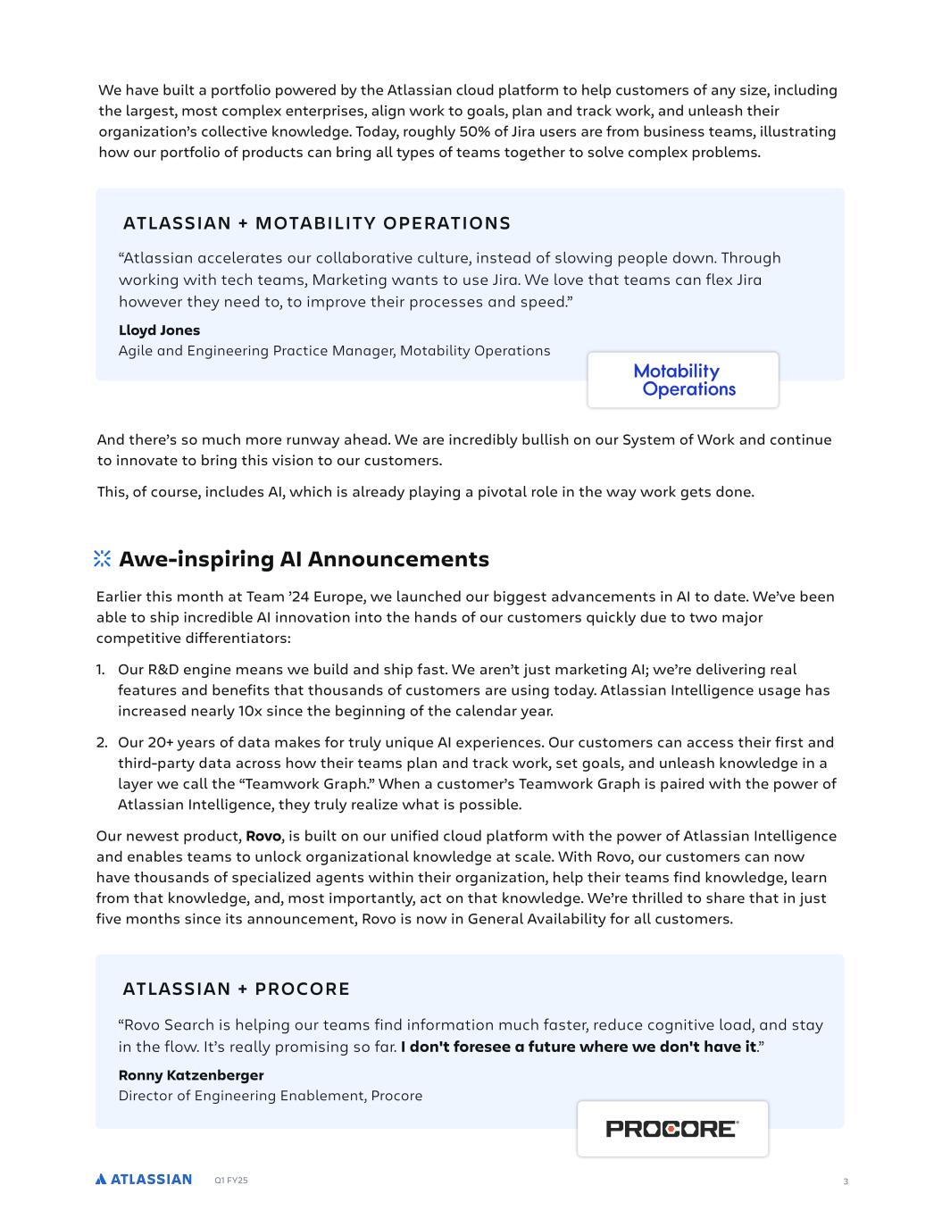 Q1 FY25 We have built a portfolio powered by the Atlassian cloud platform to help customers of any size, including the largest, most complex enterprises, align work to goals, plan and track work, and unleash their organization’s collective knowledge. Today, roughly 50% of Jira users are from business teams, illustrating how our portfolio of products can bring all types of teams together to solve complex problems. 3 Awe-inspiring AI Announcements Earlier this month at Team ’24 Europe, we launched our biggest advancements in AI to date. We’ve been able to ship incredible AI innovation into the hands of our customers quickly due to two major competitive differentiators: 1. Our R&D engine means we build and ship fast. We aren’t just marketing AI; we’re delivering real features and benefits that thousands of customers are using today. Atlassian Intelligence usage has increased nearly 10x since the beginning of the calendar year. 2. Our 20+ years of data makes for truly unique AI experiences. Our customers can access their first and third-party data across how their teams plan and track work, set goals, and unleash knowledge in a layer we call the “Teamwork Graph.” When a customer’s Teamwork Graph is paired with the power of Atlassian Intelligence, they truly realize what is possible. Our newest product, Rovo, is built on our unified cloud platform with the power of Atlassian Intelligence and enables teams to unlock organizational knowledge at scale. With Rovo, our customers can now have thousands of specialized agents within their organization, help their teams find knowledge, learn from that knowledge, and, most importantly, act on that knowledge. We’re thrilled to share that in just five months since its announcement, Rovo is now in General Availability for all customers. ATLASSIAN + PROCORE “Rovo Search is helping our teams find information much faster, reduce cognitive load, and stay in the flow. It’s really promising so far. I don't foresee a future where we don't have it.” Ronny Katzenberger Director of Engineering Enablement, Procore ATLASSIAN + MOTABILITY OPERATIONS “Atlassian accelerates our collaborative culture, instead of slowing people down. Through working with tech teams, Marketing wants to use Jira. We love that teams can flex Jira however they need to, to improve their processes and speed.” Lloyd Jones Agile and Engineering Practice Manager, Motability Operations And there’s so much more runway ahead. We are incredibly bullish on our System of Work and continue to innovate to bring this vision to our customers. This, of course, includes AI, which is already playing a pivotal role in the way work gets done.
