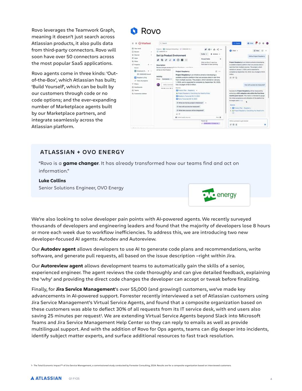 Q1 FY25 4 ATLASSIAN + OVO ENERGY “Rovo is a game changer. It has already transformed how our teams find and act on information.” Luke Collins Senior Solutions Engineer, OVO Energy Rovo leverages the Teamwork Graph, meaning it doesn’t just search across Atlassian products, it also pulls data from third-party connectors. Rovo will soon have over 50 connectors across the most popular SaaS applications. Rovo agents come in three kinds: ‘Out- of-the-Box’, which Atlassian has built; ‘Build Yourself’, which can be built by our customers through code or no code options; and the ever-expanding number of Marketplace agents built by our Marketplace partners, and integrate seamlessly across the Atlassian platform. We’re also looking to solve developer pain points with AI-powered agents. We recently surveyed thousands of developers and engineering leaders and found that the majority of developers lose 8 hours or more each week due to workflow inefficiencies. To address this, we are introducing two new developer-focused AI agents: Autodev and Autoreview. Our Autodev agent allows developers to use AI to generate code plans and recommendations, write software, and generate pull requests, all based on the issue description —right within Jira. Our Autoreview agent allows development teams to automatically gain the skills of a senior, experienced engineer. The agent reviews the code thoroughly and can give detailed feedback, explaining the ‘why’ and providing the direct code changes the developer can accept or tweak before finalizing. Finally, for Jira Service Management’s over 55,000 (and growing!) customers, we’ve made key advancements in AI-powered support. Forrester recently interviewed a set of Atlassian customers using Jira Service Management’s Virtual Service Agents, and found that a composite organization based on these customers was able to deflect 30% of all requests from its IT service desk, with end users also saving 25 minutes per request1. We are extending Virtual Service Agents beyond Slack into Microsoft Teams and Jira Service Management Help Center so they can reply to emails as well as provide multilingual support. And with the addition of Rovo for Ops agents, teams can dig deeper into incidents, identify subject matter experts, and surface additional resources to fast track resolution. 1- The Total Economic Impact™ of Jira Service Management, a commissioned study conducted by Forrester Consulting, 2024. Results are for a composite organization based on interviewed customers.