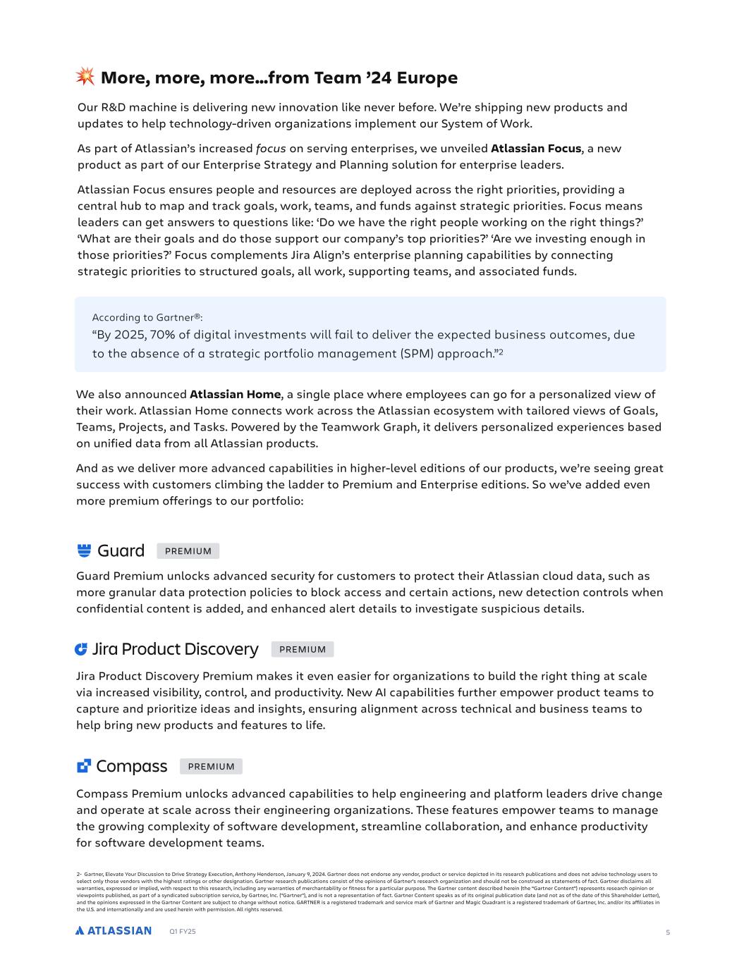 Q1 FY25 More, more, more…from Team ’24 Europe Our R&D machine is delivering new innovation like never before. We’re shipping new products and updates to help technology-driven organizations implement our System of Work. As part of Atlassian’s increased focus on serving enterprises, we unveiled Atlassian Focus, a new product as part of our Enterprise Strategy and Planning solution for enterprise leaders. Atlassian Focus ensures people and resources are deployed across the right priorities, providing a central hub to map and track goals, work, teams, and funds against strategic priorities. Focus means leaders can get answers to questions like: ‘Do we have the right people working on the right things?’ ‘What are their goals and do those support our company’s top priorities?’ ‘Are we investing enough in those priorities?’ Focus complements Jira Align’s enterprise planning capabilities by connecting strategic priorities to structured goals, all work, supporting teams, and associated funds. 5 💥 According to Gartner®: “By 2025, 70% of digital investments will fail to deliver the expected business outcomes, due to the absence of a strategic portfolio management (SPM) approach.”2 PREMIUM Guard Premium unlocks advanced security for customers to protect their Atlassian cloud data, such as more granular data protection policies to block access and certain actions, new detection controls when confidential content is added, and enhanced alert details to investigate suspicious details. We also announced Atlassian Home, a single place where employees can go for a personalized view of their work. Atlassian Home connects work across the Atlassian ecosystem with tailored views of Goals, Teams, Projects, and Tasks. Powered by the Teamwork Graph, it delivers personalized experiences based on unified data from all Atlassian products. And as we deliver more advanced capabilities in higher-level editions of our products, we’re seeing great success with customers climbing the ladder to Premium and Enterprise editions. So we’ve added even more premium offerings to our portfolio: PREMIUM Jira Product Discovery Premium makes it even easier for organizations to build the right thing at scale via increased visibility, control, and productivity. New AI capabilities further empower product teams to capture and prioritize ideas and insights, ensuring alignment across technical and business teams to help bring new products and features to life. PREMIUM Compass Premium unlocks advanced capabilities to help engineering and platform leaders drive change and operate at scale across their engineering organizations. These features empower teams to manage the growing complexity of software development, streamline collaboration, and enhance productivity for software development teams. 2- Gartner, Elevate Your Discussion to Drive Strategy Execution, Anthony Henderson, January 9, 2024. Gartner does not endorse any vendor, product or service depicted in its research publications and does not advise technology users to select only those vendors with the highest ratings or other designation. Gartner research publications consist of the opinions of Gartner’s research organization and should not be construed as statements of fact. Gartner disclaims all warranties, expressed or implied, with respect to this research, including any warranties of merchantability or fitness for a particular purpose. The Gartner content described herein (the “Gartner Content”) represents research opinion or viewpoints published, as part of a syndicated subscription service, by Gartner, Inc. ("Gartner"), and is not a representation of fact. Gartner Content speaks as of its original publication date (and not as of the date of this Shareholder Letter), and the opinions expressed in the Gartner Content are subject to change without notice. GARTNER is a registered trademark and service mark of Gartner and Magic Quadrant is a registered trademark of Gartner, Inc. and/or its affiliates in the U.S. and internationally and are used herein with permission. All rights reserved.