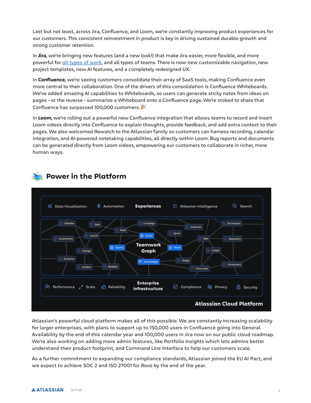 Q1 FY25 Last but not least, across Jira, Confluence, and Loom, we’re constantly improving product experiences for our customers. This consistent reinvestment in product is key in driving sustained durable growth and strong customer retention. In Jira, we’re bringing new features (and a new look!) that make Jira easier, more flexible, and more powerful for all types of work, and all types of teams. There is now new customizable navigation, new project templates, new AI features, and a completely redesigned UX. In Confluence, we’re seeing customers consolidate their array of SaaS tools, making Confluence even more central to their collaboration. One of the drivers of this consolidation is Confluence Whiteboards. We’ve added amazing AI capabilities to Whiteboards, so users can generate sticky notes from ideas on pages - or the reverse - summarize a Whiteboard onto a Confluence page. We’re stoked to share that Confluence has surpassed 100,000 customers. 🎉 In Loom, we’re rolling out a powerful new Confluence integration that allows teams to record and insert Loom videos directly into Confluence to explain thoughts, provide feedback, and add extra context to their pages. We also welcomed Rewatch to the Atlassian family so customers can harness recording, calendar integration, and AI-powered notetaking capabilities, all directly within Loom. Bug reports and documents can be generated directly from Loom videos, empowering our customers to collaborate in richer, more human ways. Power in the Platform 6 Atlassian Cloud Platform Experiences Atlassian IntelligenceData Visualization Automation Search Enterprise Infrastructure SecurityPrivacyComplianceReliabilityScalePerformance Teamwork Graph Atlassian’s powerful cloud platform makes all of this possible. We are constantly increasing scalability for larger enterprises, with plans to support up to 150,000 users in Confluence going into General Availability by the end of this calendar year and 100,000 users in Jira now on our public cloud roadmap. We’re also working on adding more admin features, like Portfolio Insights which lets admins better understand their product footprint, and Command Line Interface to help our customers scale. As a further commitment to expanding our compliance standards, Atlassian joined the EU AI Pact, and we expect to achieve SOC 2 and ISO 27001 for Rovo by the end of the year.