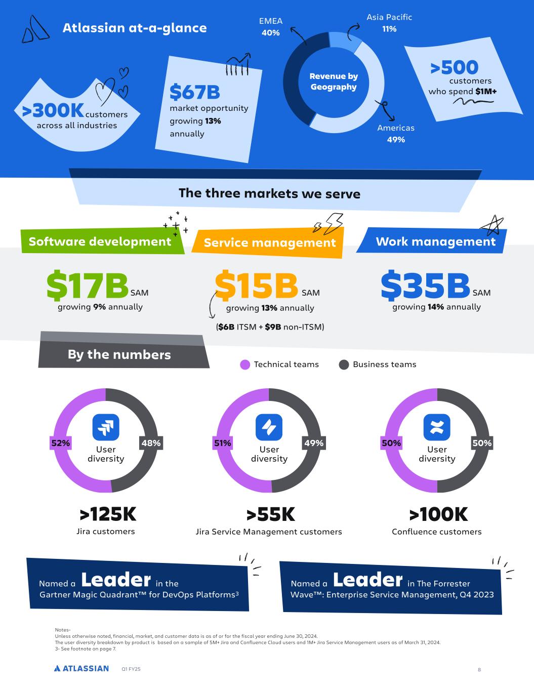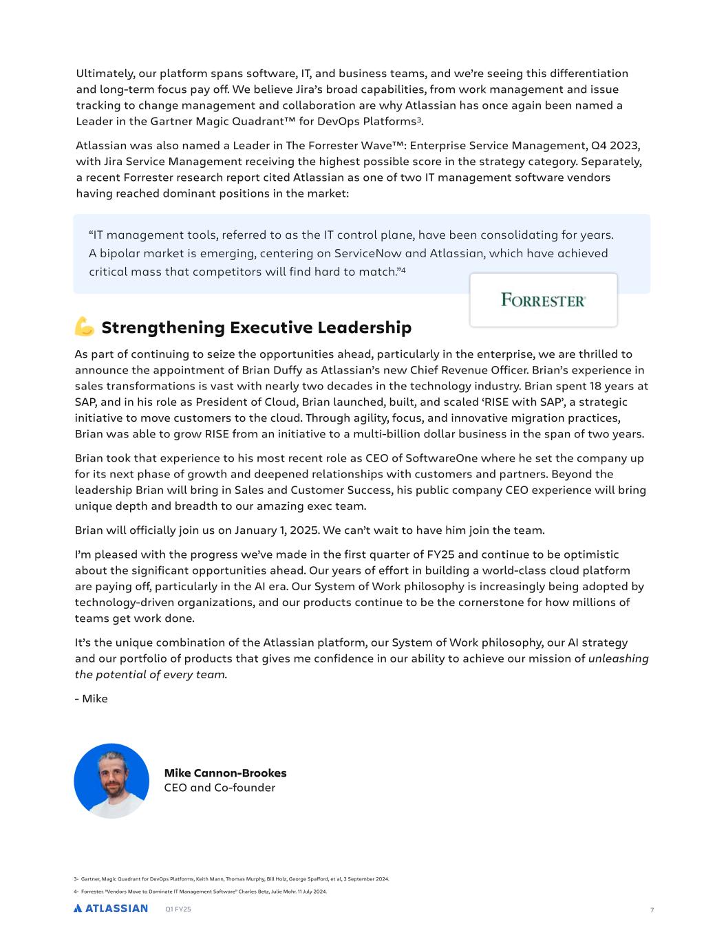 Q1 FY25 Strengthening Executive Leadership As part of continuing to seize the opportunities ahead, particularly in the enterprise, we are thrilled to announce the appointment of Brian Duffy as Atlassian’s new Chief Revenue Officer. Brian’s experience in sales transformations is vast with nearly two decades in the technology industry. Brian spent 18 years at SAP, and in his role as President of Cloud, Brian launched, built, and scaled ‘RISE with SAP’, a strategic initiative to move customers to the cloud. Through agility, focus, and innovative migration practices, Brian was able to grow RISE from an initiative to a multi-billion dollar business in the span of two years. Brian took that experience to his most recent role as CEO of SoftwareOne where he set the company up for its next phase of growth and deepened relationships with customers and partners. Beyond the leadership Brian will bring in Sales and Customer Success, his public company CEO experience will bring unique depth and breadth to our amazing exec team. Brian will officially join us on January 1, 2025. We can’t wait to have him join the team. I’m pleased with the progress we’ve made in the first quarter of FY25 and continue to be optimistic about the significant opportunities ahead. Our years of effort in building a world-class cloud platform are paying off, particularly in the AI era. Our System of Work philosophy is increasingly being adopted by technology-driven organizations, and our products continue to be the cornerstone for how millions of teams get work done. It’s the unique combination of the Atlassian platform, our System of Work philosophy, our AI strategy and our portfolio of products that gives me confidence in our ability to achieve our mission of unleashing the potential of every team. - Mike Ultimately, our platform spans software, IT, and business teams, and we’re seeing this differentiation and long-term focus pay off. We believe Jira’s broad capabilities, from work management and issue tracking to change management and collaboration are why Atlassian has once again been named a Leader in the Gartner Magic Quadrant™ for DevOps Platforms3. Atlassian was also named a Leader in The Forrester Wave™: Enterprise Service Management, Q4 2023, with Jira Service Management receiving the highest possible score in the strategy category. Separately, a recent Forrester research report cited Atlassian as one of two IT management software vendors having reached dominant positions in the market: 7 “IT management tools, referred to as the IT control plane, have been consolidating for years. A bipolar market is emerging, centering on ServiceNow and Atlassian, which have achieved critical mass that competitors will find hard to match.”4 Mike Cannon-Brookes CEO and Co-founder 3- Gartner, Magic Quadrant for DevOps Platforms, Keith Mann, Thomas Murphy, Bill Holz, George Spafford, et al, 3 September 2024. 4- Forrester. “Vendors Move to Dominate IT Management Software” Charles Betz, Julie Mohr. 11 July 2024.