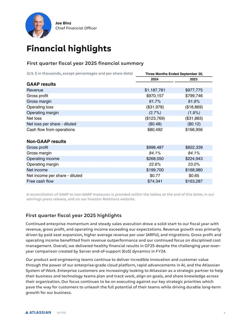 Q1 FY25 9 First quarter fiscal year 2025 financial summary (U.S. $ in thousands, except percentages and per share data) A reconciliation of GAAP to non-GAAP measures is provided within the tables at the end of this letter, in our earnings press release, and on our Investor Relations website. Joe Binz Chief Financial Officer Financial highlights 4 ST R CS GS COF H TECM )'), H OCOE CM T NNCS U T a M P $ QdOQ Q TM Q PM M M P Q OQ MSQ SGG PO T 3OFGF GQ GNDGS '$ )') )') 5// SGT M T FQbQ aQ )$)0/$/0) 1//$//- ; RU 1/($)-/ /11$/,. ; YM SU . %- . %. C Q M U S )$1/0 )0$0.1 C Q M U S YM SU (%- % BQ ) $/.1 )$00 BQ Q TM Q % PU a QP (&,0 (&) 7M T R c R Y Q M U 0($,1 )..$1-. :PO%5// SGT M T ; RU 110$,0/ 0 $ 1 ; YM SU . % . % C Q M U S U O YQ .0$(-( ,$1, C Q M U S YM SU ((%, ()% BQ U O YQ )11$/(( ).0$10( BQ U O YQ Q TM Q % PU a QP (&// (&.- : QQ OM T R c /,$ ,) ). $ 0/ ( First quarter fiscal year 2025 highlights Continued enterprise momentum and steady sales execution drove a solid start to our fiscal year with revenue, gross profit, and operating income exceeding our expectations. Revenue growth was primarily driven by paid seat expansion, higher average revenue per user (ARPU), and migrations. Gross profit and operating income benefitted from revenue outperformance and our continued focus on disciplined cost management. Overall, we delivered healthy financial results in Q1’25 despite the challenging year-over- year comparison created by Server end-of-support (EoS) dynamics in FY24. Our product and engineering teams continue to deliver incredible innovation and customer value through the power of our enterprise-grade cloud platform, rapid advancements in AI, and the Atlassian System of Work. Enterprise customers are increasingly looking to Atlassian as a strategic partner to help their business and technology teams plan and track work, align on goals, and share knowledge across their organization. Our focus continues to be on executing against our key strategic priorities which pave the way for customers to unleash the full potential of their teams while driving durable long-term growth for our business.