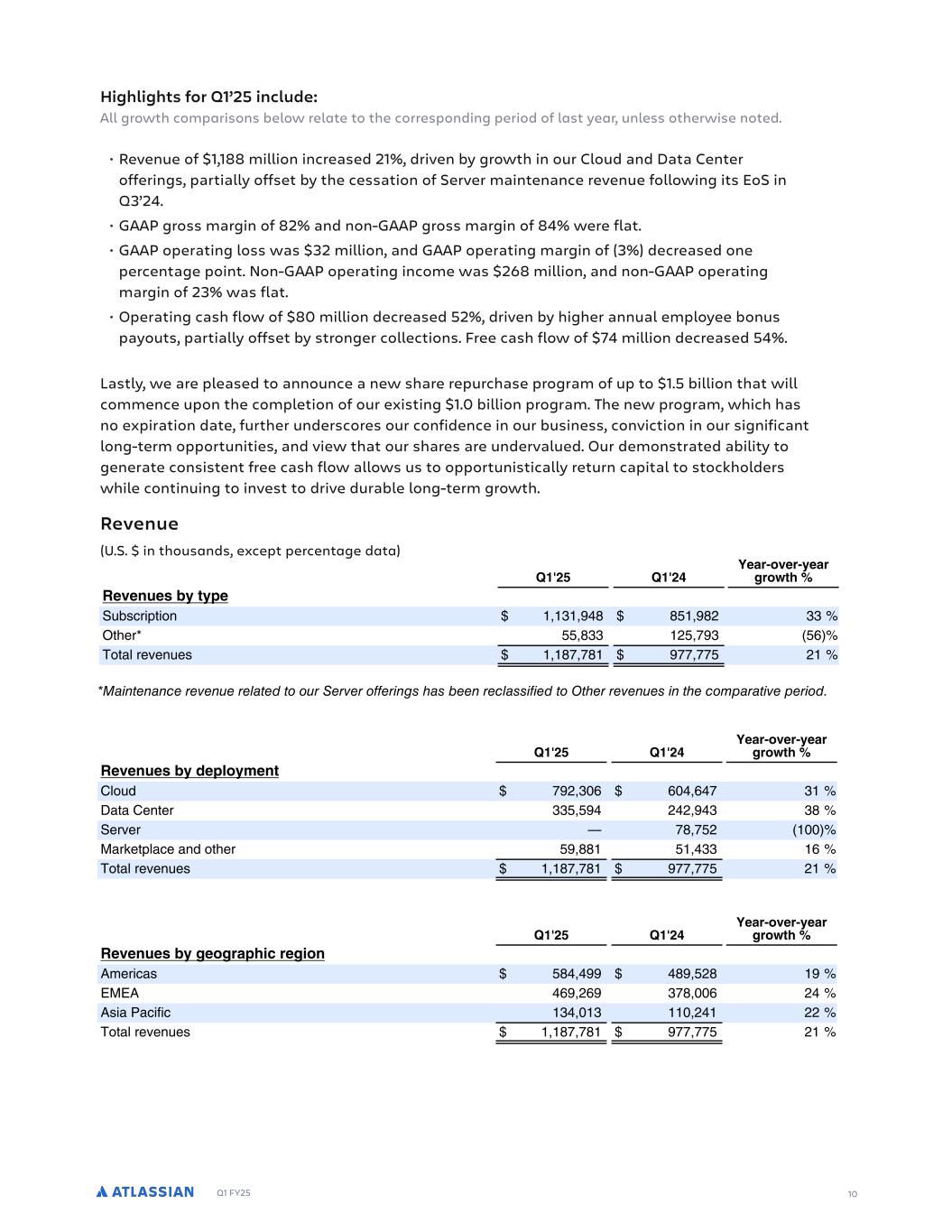 Q1 FY25 Highlights for Q1’25 include: All growth comparisons below relate to the corresponding period of last year, unless otherwise noted. • Revenue of $1,188 million increased 21%, driven by growth in our Cloud and Data Center offerings, partially offset by the cessation of Server maintenance revenue following its EoS in Q3’24. • GAAP gross margin of 82% and non-GAAP gross margin of 84% were flat. • GAAP operating loss was $32 million, and GAAP operating margin of (3%) decreased one percentage point. Non-GAAP operating income was $268 million, and non-GAAP operating margin of 23% was flat. • Operating cash flow of $80 million decreased 52%, driven by higher annual employee bonus payouts, partially offset by stronger collections. Free cash flow of $74 million decreased 54%. Lastly, we are pleased to announce a new share repurchase program of up to $1.5 billion that will commence upon the completion of our existing $1.0 billion program. The new program, which has no expiration date, further underscores our confidence in our business, conviction in our significant long-term opportunities, and view that our shares are undervalued. Our demonstrated ability to generate consistent free cash flow allows us to opportunistically return capital to stockholders while continuing to invest to drive durable long-term growth. Revenue (U.S. $ in thousands, except percentage data) -AI I I F A C % % I M E I C L GMRP LCP$ D DN NDO DL FD Q 4 % 4 %' I FM I P I IFN 5 M E P PG RAP O N ML ($(*($0 ,($0 ) ** GDO ,,$ ** (),$.0* ,- M ODSDLRDP ($( .$. ( 0..$.., )( .19 5 1 35 5 5 5 5 1 54 05 5 665 9 7 81 255 53 1 96954 85 5 5 5 9 85 3 1 1 9 5 5 9 4 4 % 4 %' I FM I P I IFN 5 M E P GCFPD E 3 MRC .0)$* - - $- . *( 4 3DL DO **,$,0 ) )$0 * * DOSDO . $.,) ( 9 O D N D LC M GDO ,0$ ( ,($ ** (- M ODSDLRDP ($( .$. ( 0..$.., )( 4 % 4 %' I FM I P I IFN 5 M E P F I G A I AFE 2 DO P , $ 00 0$,) (0 5952 -0$)-0 *. $ - ) 2P E (* $ (* (( $) ( )) M ODSDLRDP ($( .$. ( 0..$.., )(  10