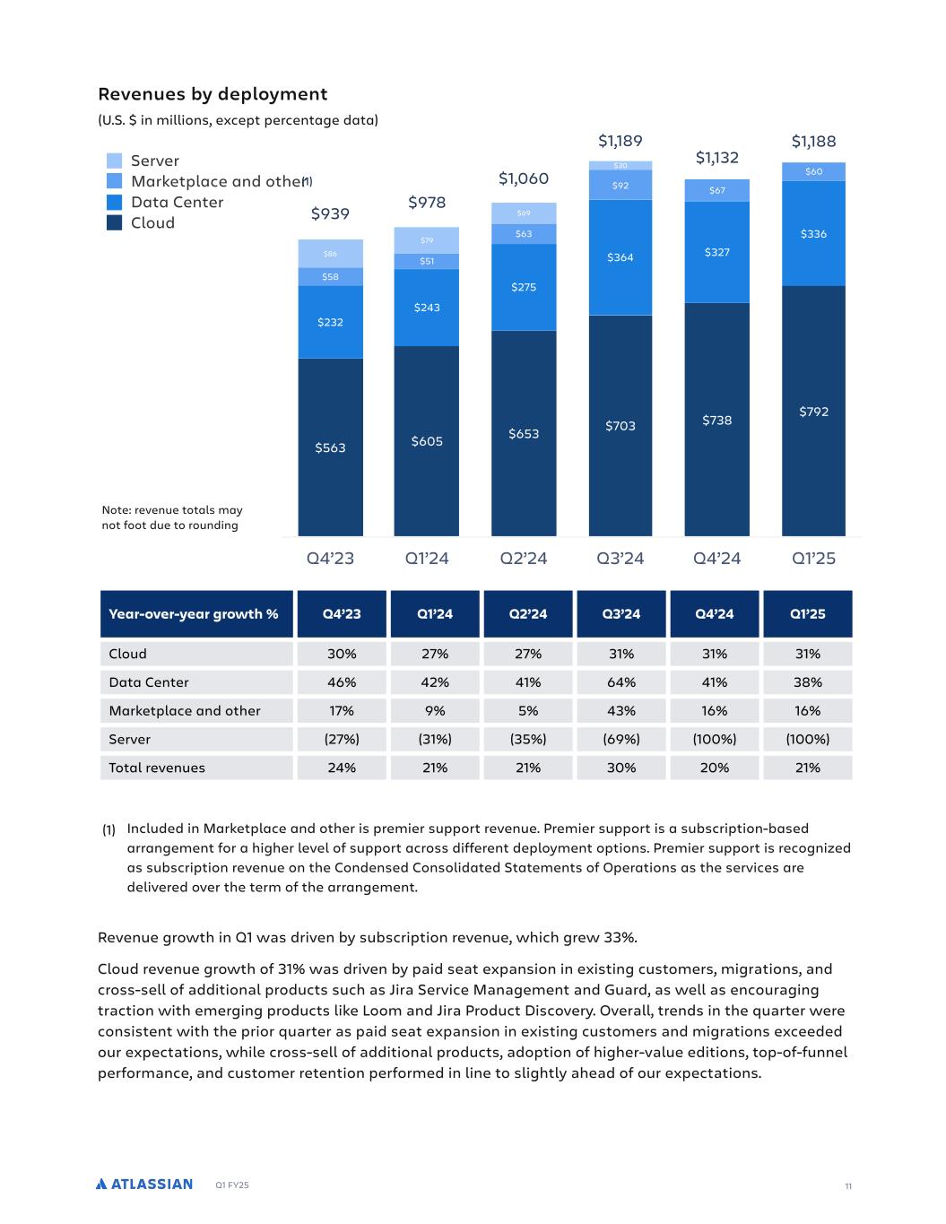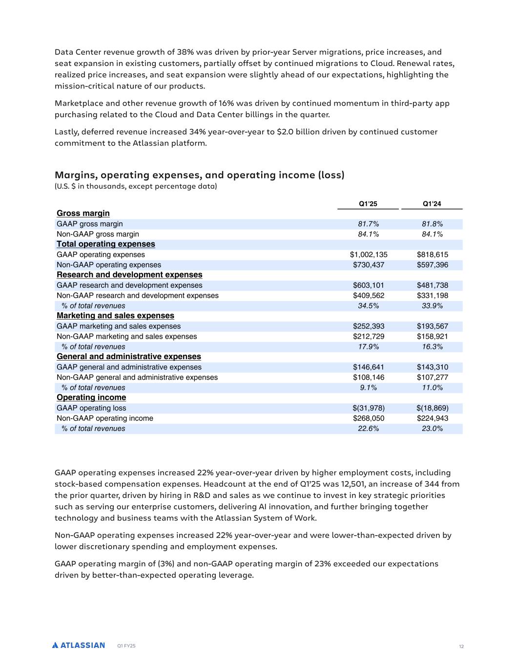 Q1 FY25 12 Data Center revenue growth of 38% was driven by prior-year Server migrations, price increases, and seat expansion in existing customers, partially offset by continued migrations to Cloud. Renewal rates, realized price increases, and seat expansion were slightly ahead of our expectations, highlighting the mission-critical nature of our products. Marketplace and other revenue growth of 16% was driven by continued momentum in third-party app purchasing related to the Cloud and Data Center billings in the quarter. Lastly, deferred revenue increased 34% year-over-year to $2.0 billion driven by continued customer commitment to the Atlassian platform. Margins, operating expenses, and operating income (loss) (U.S. $ in thousands, except percentage data) GAAP operating expenses increased 22% year-over-year driven by higher employment costs, including stock-based compensation expenses. Headcount at the end of Q1’25 was 12,501, an increase of 344 from the prior quarter, driven by hiring in R&D and sales as we continue to invest in key strategic priorities such as serving our enterprise customers, delivering AI innovation, and further bringing together technology and business teams with the Atlassian System of Work. Non-GAAP operating expenses increased 22% year-over-year and were lower-than-expected driven by lower discretionary spending and employment expenses. GAAP operating margin of (3%) and non-GAAP operating margin of 23% exceeded our expectations driven by better-than-expected operating leverage. 4 ST R CS GS PH H TECM )'), NCSI OT COF PQGSC OI GYQGOTG T NNCS U T a M P $ QdOQ Q TM Q PM M M P Q OQ MSQ ( ), ( ) 5SPTT NCSI O g g ;55D S YM SU . %- . %. B %;55D S YM SU . % . % P CM PQGSC OI GYQGOTGT ;55D Q M U S Qd Q Q )$(( $) - 0)0$.)- B %;55D Q M U S Qd Q Q / ($, / -1/$ 1. >GTGCSE COF FGWGMPQNGO GYQGOTGT ;55D Q QM OT M P PQbQ YQ Qd Q Q .( $)() ,0)$/ 0 B %;55D Q QM OT M P PQbQ YQ Qd Q Q ,(1$-. )$)10 8A F C G ) % ))% CSLG OI COF TCMGT GYQGOTGT ;55D YM WQ U S M P M Q Qd Q Q - $ 1 )1 $-./ B %;55D YM WQ U S M P M Q Qd Q Q ) $/ 1 )-0$1 ) 8A F C G -% ,%) 5GOGSCM COF CFN O T SC WG GYQGOTGT ;55D SQ Q M M P MPYU U M UbQ Qd Q Q ),.$.,) ), $ )( B %;55D SQ Q M M P MPYU U M UbQ Qd Q Q )(0$),. )(/$ // 8A F C G % % QGSC OI OEPNG ;55D Q M U S )$1/0 )0$0.1 B %;55D Q M U S U O YQ .0$(-( ,$1, 8A F C G ((%, ()% )