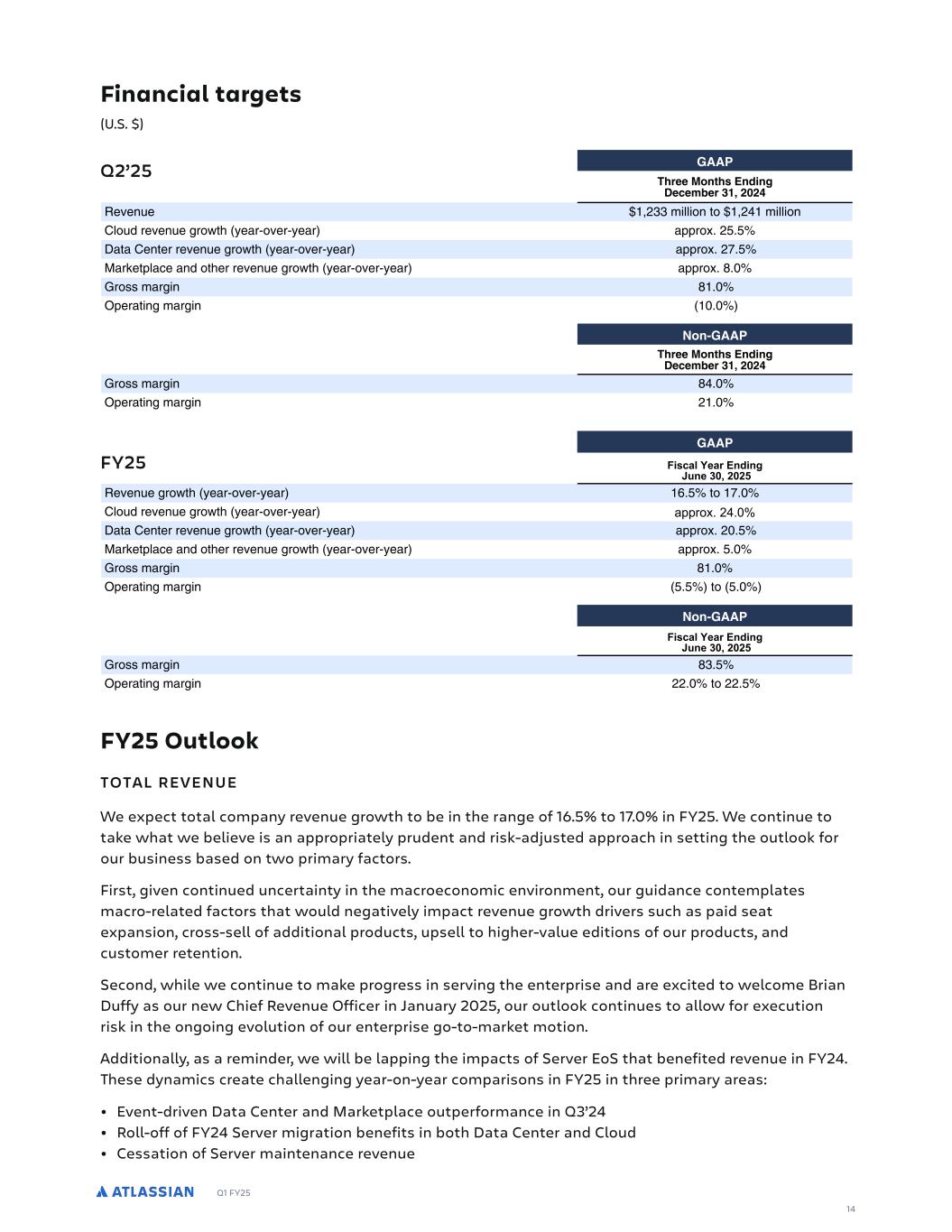 Q1 FY25 Financial targets (U.S. $) Q2’25 FY25 FY25 Outlook TOTAL REVENUE We expect total company revenue growth to be in the range of 16.5% to 17.0% in FY25. We continue to take what we believe is an appropriately prudent and risk-adjusted approach in setting the outlook for our business based on two primary factors. First, given continued uncertainty in the macroeconomic environment, our guidance contemplates macro-related factors that would negatively impact revenue growth drivers such as paid seat expansion, cross-sell of additional products, upsell to higher-value editions of our products, and customer retention. Second, while we continue to make progress in serving the enterprise and are excited to welcome Brian Duffy as our new Chief Revenue Officer in January 2025, our outlook continues to allow for execution risk in the ongoing evolution of our enterprise go-to-market motion. Additionally, as a reminder, we will be lapping the impacts of Server EoS that benefited revenue in FY24. These dynamics create challenging year-on-year comparisons in FY25 in three primary areas: • Event-driven Data Center and Marketplace outperformance in Q3’24 • Roll-off of FY24 Server migration benefits in both Data Center and Cloud • Cessation of Server maintenance revenue -AE E A C I  3 Q I 0FE ,E AE D I % %' CRC C ()) G GL PL ( G GL 2 L NCRC C ENLSPF C N$LRCN$ C N MMNLT% ( % 3 P 2C PCN NCRC C ENLSPF C N$LRCN$ C N MMNLT% (-% 8 N CPM AC LPFCN NCRC C ENLSPF C N$LRCN$ C N MMNLT% .% 6NLOO NEG . % :MCN PG E NEG % 1FE 3 Q I 0FE ,E AE D I % %' 6NLOO NEG . % :MCN PG E NEG ( %  3 Q 0 , 2 CRC C ENLSPF C N$LRCN$ C N ,% PL -% 2 L NCRC C ENLSPF C N$LRCN$ C N % 3 P 2C PCN NCRC C ENLSPF C N$LRCN$ C N MMNLT% ( % 8 N CPM AC LPFCN NCRC C ENLSPF C N$LRCN$ C N MMNLT% % 6NLOO NEG . % :MCN PG E NEG % PL % 1FE 3 0 , 2 6NLOO NEG .)% :MCN PG E NEG ((% PL ((% -AE E A C I  3 Q I 0FE ,E AE D I % %' CRC C ()) G GL PL ( G GL 2 L NCRC C ENLSPF C N$LRCN$ C N MMNLT% ( % 3 P 2C PCN NCRC C ENLSPF C N$LRCN$ C N MMNLT% (-% 8 N CPM AC LPFCN NCRC C ENLSPF C N$LRCN$ C N MMNLT% .% 6NLOO NEG . % :MCN PG E NEG % 1FE 3 Q I 0FE ,E AE D I % %' 6NLOO NEG . % :MCN PG E NEG ( %  3 Q 0 , 2 CRC C ENLSPF C N$LRCN$ C N ,% PL -% 2 L NCRC C ENLSPF C N$LRCN$ C N % 3 P 2C PCN NCRC C ENLSPF C N$LRCN$ C N MMNLT% ( % 8 N CPM AC LPFCN NCRC C ENLSPF C N$LRCN$ C N MMNLT% % 6NLOO NEG . % :MCN PG E NEG % PL % 1FE 3 0 , 2 6NLOO NEG .)% :MCN PG E NEG ((% PL ((% 14