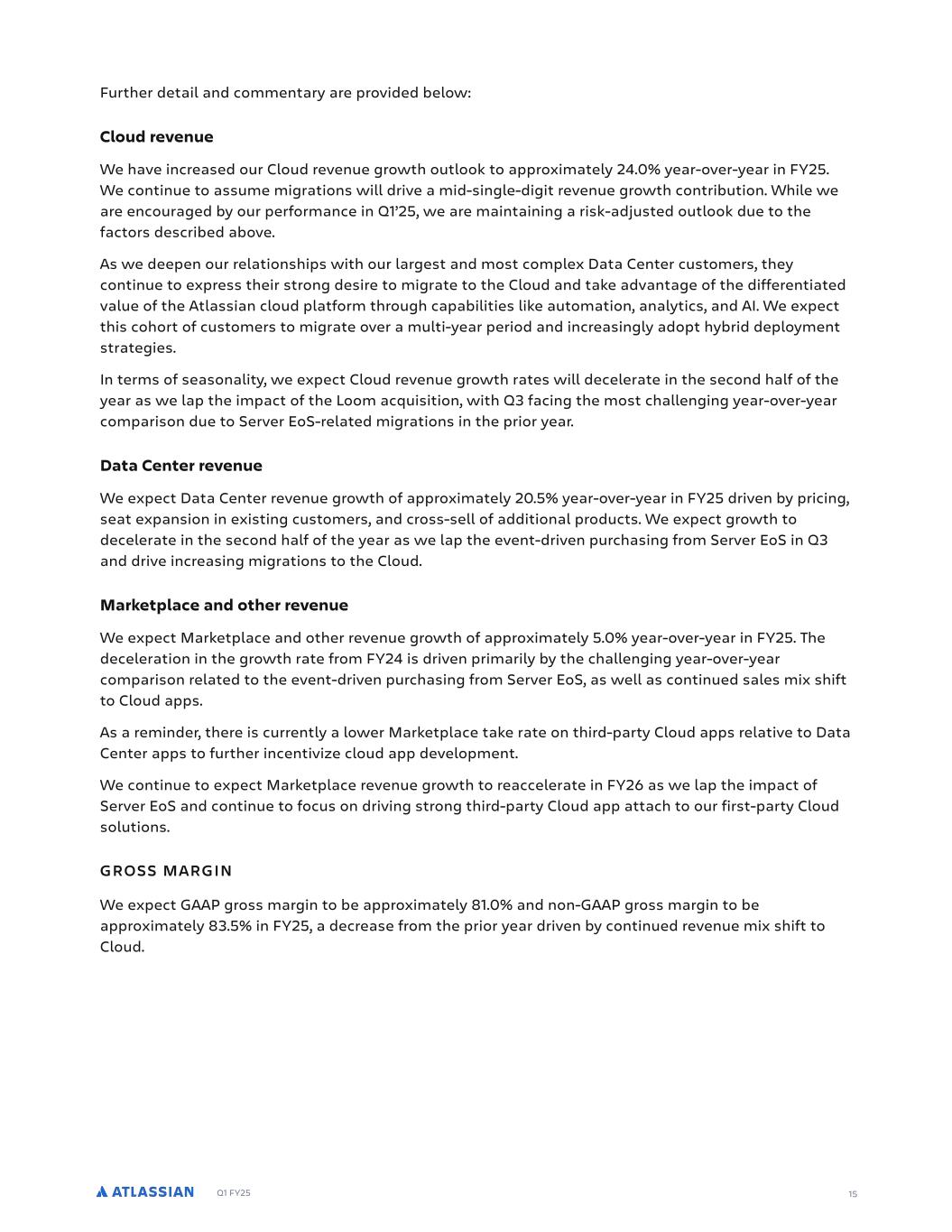 Q1 FY25 15 Further detail and commentary are provided below: Cloud revenue We have increased our Cloud revenue growth outlook to approximately 24.0% year-over-year in FY25. We continue to assume migrations will drive a mid-single-digit revenue growth contribution. While we are encouraged by our performance in Q1’25, we are maintaining a risk-adjusted outlook due to the factors described above. As we deepen our relationships with our largest and most complex Data Center customers, they continue to express their strong desire to migrate to the Cloud and take advantage of the differentiated value of the Atlassian cloud platform through capabilities like automation, analytics, and AI. We expect this cohort of customers to migrate over a multi-year period and increasingly adopt hybrid deployment strategies. In terms of seasonality, we expect Cloud revenue growth rates will decelerate in the second half of the year as we lap the impact of the Loom acquisition, with Q3 facing the most challenging year-over-year comparison due to Server EoS-related migrations in the prior year. Data Center revenue We expect Data Center revenue growth of approximately 20.5% year-over-year in FY25 driven by pricing, seat expansion in existing customers, and cross-sell of additional products. We expect growth to decelerate in the second half of the year as we lap the event-driven purchasing from Server EoS in Q3 and drive increasing migrations to the Cloud. Marketplace and other revenue We expect Marketplace and other revenue growth of approximately 5.0% year-over-year in FY25. The deceleration in the growth rate from FY24 is driven primarily by the challenging year-over-year comparison related to the event-driven purchasing from Server EoS, as well as continued sales mix shift to Cloud apps. As a reminder, there is currently a lower Marketplace take rate on third-party Cloud apps relative to Data Center apps to further incentivize cloud app development. We continue to expect Marketplace revenue growth to reaccelerate in FY26 as we lap the impact of Server EoS and continue to focus on driving strong third-party Cloud app attach to our first-party Cloud solutions. GROSS MARGIN We expect GAAP gross margin to be approximately 81.0% and non-GAAP gross margin to be approximately 83.5% in FY25, a decrease from the prior year driven by continued revenue mix shift to Cloud.