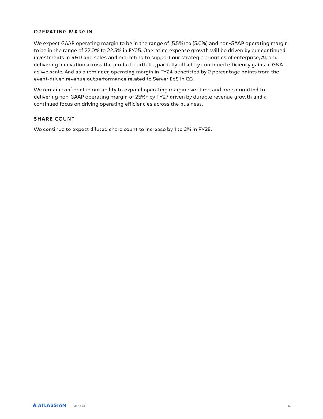 Q1 FY25 16 OPERATING MARGIN We expect GAAP operating margin to be in the range of (5.5%) to (5.0%) and non-GAAP operating margin to be in the range of 22.0% to 22.5% in FY25. Operating expense growth will be driven by our continued investments in R&D and sales and marketing to support our strategic priorities of enterprise, AI, and delivering innovation across the product portfolio, partially offset by continued efficiency gains in G&A as we scale. And as a reminder, operating margin in FY24 benefitted by 2 percentage points from the event-driven revenue outperformance related to Server EoS in Q3. We remain confident in our ability to expand operating margin over time and are committed to delivering non-GAAP operating margin of 25%+ by FY27 driven by durable revenue growth and a continued focus on driving operating efficiencies across the business. SHARE COUNT We continue to expect diluted share count to increase by 1 to 2% in FY25.