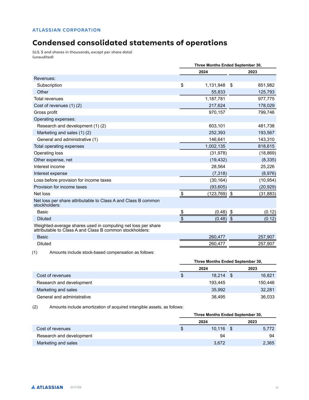 Q1 FY25 17 ATLASSIAN CORPORATION Condensed consolidated statements of operations (U.S. $ and shares in thousands, except per share data) (unaudited) .S ARR AM 0N ON AS NM 0NMDEMRED 0NMRN DASED SASELEMSR NF OE AS NMR % % AMD R A ER M S NTRAMDR EWCEOS OE R A E DASA TMATD SED  EE NMS R 2MDED EOSELBE ) ( ( ( () FWFO FT0 CTDS PO ) . . .( IFS .)) ( - ) P BM SFWFO FT .- -. -- -- 3PT PG SFWFO FT ( ( - ,( -. ( 7SPTT SPG - - - - , FSB O F FOTFT0 FTFBSDI BOE EFWFMP NFO ( , ) . -). :BSLF O BOE TBMFT ( ( ( ) ) ) ,- 7FOFSBM BOE BEN O T SB WF , , ) ) P BM P FSB O F FOTFT ( ) . . , FSB O MPTT ) -. . ., IFS F FOTF OF )( . )) 8O FSFT ODPNF (. , ( ((, 8O FSFT F FOTF - ) . . -, 9PTT CFGPSF SPW T PO GPS ODPNF B FT ) , SPW T PO GPS ODPNF B FT ) , ( ( F MPTT () -, ) ..) F MPTT FS TIBSF B S C BCMF P 3MBTT 1 BOE 3MBTT 2 DPNNPO T PDLIPMEFST0 2BT D % . % ( 4 M FE % . % ( AF I FE$BWFSB F TIBSFT TFE O DPN O OF MPTT FS TIBSF B S C BCMF P 3MBTT 1 BOE 3MBTT 2 DPNNPO T PDLIPMEFST0 2BT D (, -- ( - - 4 M FE (, -- ( - - 1NP O T ODM EF T PDL$CBTFE DPN FOTB PO BT GPMMP T0 EE NMS R 2MDED EOSELBE ) ( ( ( () 3PT PG SFWFO FT . ( , .( FTFBSDI BOE EFWFMP NFO ) , :BSLF O BOE TBMFT ) ( )( (. 7FOFSBM BOE BEN O T SB WF ). ), )) ( 1NP O T ODM EF BNPS B PO PG BDR SFE O BO CMF BTTF T BT GPMMP T0 EE NMS R 2MDED EOSELBE ) ( ( ( () 3PT PG SFWFO FT , --( FTFBSDI BOE EFWFMP NFO :BSLF O BOE TBMFT ) ,-( ( ), ,