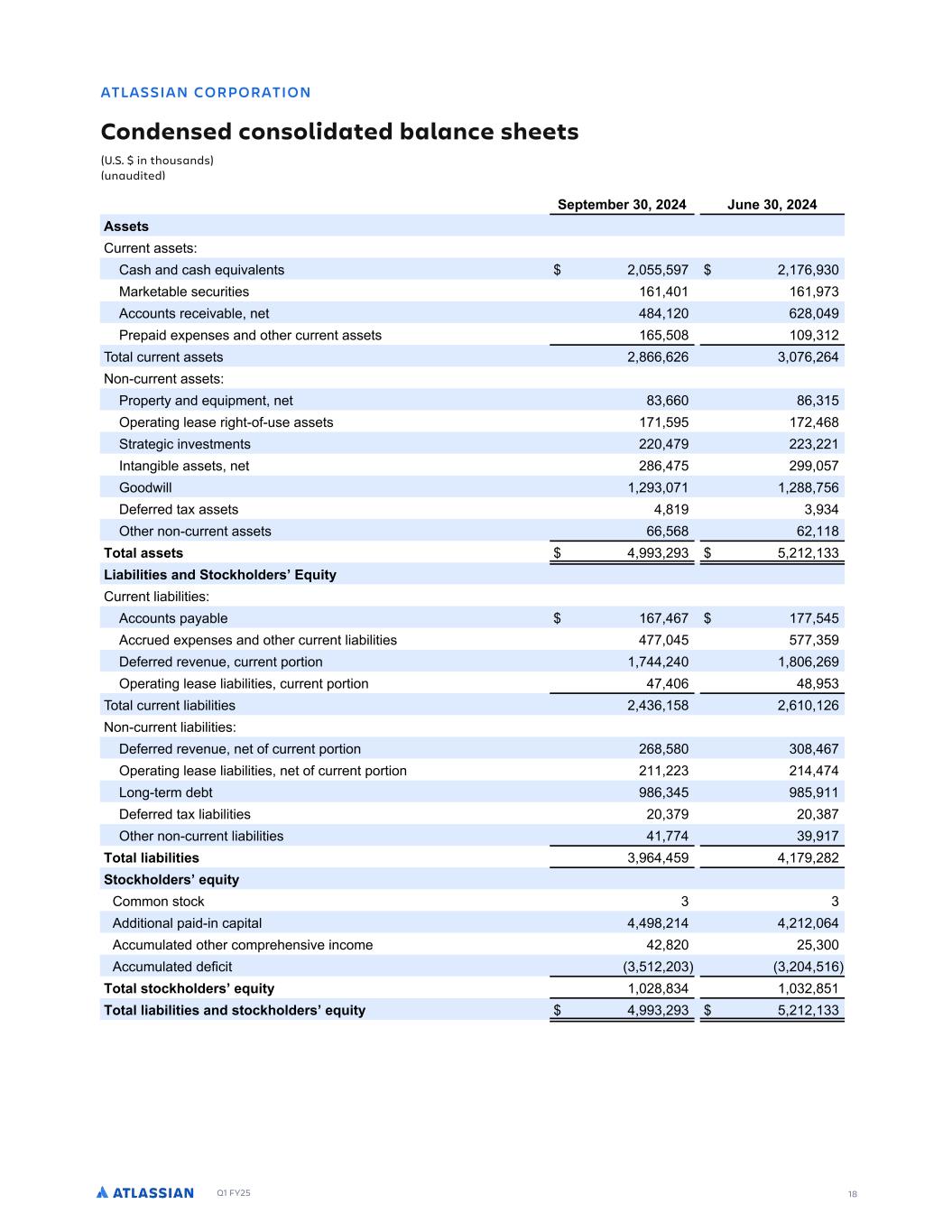 Q1 FY25 18 .S ARR AM 0N ON AS NM 0NMDEMRED 0NMRN DASED A AMCE EESR % % M S NTRAMDR TMATD SED EOSELBE ) ( ( 5TME ) ( ( .RRESR 3 SSFO BTTF T0 3BTI BOE DBTI FR WBMFO T ( - ( -, ) :BSLF BCMF TFD S FT , , -) 1DDP O T SFDF WBCMF OF . ( ,(. SF B E F FOTFT BOE P IFS D SSFO BTTF T , . ) ( P BM D SSFO BTTF T ( .,, ,(, ) -, (, PO$D SSFO BTTF T0 SP FS BOE FR NFO OF .) ,, ., ) FSB O MFBTF S I $PG$ TF BTTF T - -( ,. SB F D OWFT NFO T (( - (() (( 8O BO CMF BTTF T OF (., - ( - 7PPE MM ( ) - (.. - , 4FGFSSFE B BTTF T . ) ) IFS OPO$D SSFO BTTF T ,, ,. ,( . NSA ARRESR ) ( ) ( ( )) AB S ER AMD SNCJ N DE RY 2PT S 3 SSFO M BC M FT0 1DDP O T B BCMF ,- ,- -- 1DDS FE F FOTFT BOE P IFS D SSFO M BC M FT -- -- ) 4FGFSSFE SFWFO F D SSFO PS PO - ( . , (, FSB O MFBTF M BC M FT D SSFO PS PO - , . ) P BM D SSFO M BC M FT ( ), . ( , (, PO$D SSFO M BC M FT0 4FGFSSFE SFWFO F OF PG D SSFO PS PO (,. . ) . ,- FSB O MFBTF M BC M FT OF PG D SSFO PS PO ( (() ( - 9PO $ FSN EFC ., ) . 4FGFSSFE B M BC M FT ( )- ( ).- IFS OPO$D SSFO M BC M FT -- ) - NSA AB S ER ) , - (.( SNCJ N DE RY EPT S 3PNNPO T PDL ) ) 1EE POBM B E$ O DB BM . ( ( ( , 1DD N MB FE P IFS DPN SFIFOT WF ODPNF ( .( ( ) 1DD N MB FE EFG D ) ( ( ) ) ( , NSA RSNCJ N DE RY EPT S (. .) )( . NSA AB S ER AMD RSNCJ N DE RY EPT S ) ( ) ( ( )) - ATLASSIAN CORPORATION Condensed consolidated balance sheets (U.S. $ in thousands) (unaudited)