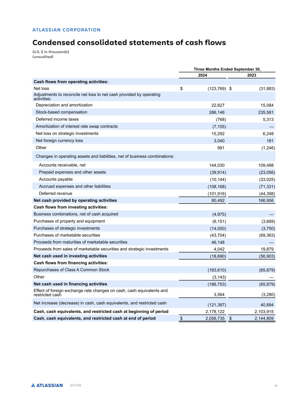 Q1 FY25 19 .S ARR AM 0N ON AS NM 0NMDEMRED 0NMRN DASED SASELEMSR NF 0AR 3 N R % % M S NTRAMDR TMATD SED          EE NMS R 2MDED EOSELBE ) ( ( ( () 0AR F N R F NL NOE AS MG ACS U S ER- F MPTT () -, ) ..) 1E T NFO T P SFDPOD MF OF MPTT P OF DBTI SPW EFE C P FSB O BD W FT0 4F SFD B PO BOE BNPS B PO (( .(- . PDL$CBTFE DPN FOTB PO (., , () . 4FGFSSFE ODPNF B FT -,. ) ) 1NPS B PO PG O FSFT SB F T B DPO SBD T - F MPTT PO T SB F D OWFT NFO T ( ( , ( . F GPSF O D SSFOD MPTT ) . IFS ( , 3IBO FT O P FSB O BTTF T BOE M BC M FT OF PG C T OFTT DPNC OB POT0 1DDP O T SFDF WBCMF OF ) .. SF B E F FOTFT BOE P IFS BTTF T ) () , 1DDP O T B BCMF )) ( 1DDS FE F FOTFT BOE P IFS M BC M FT . ,. - )) 4FGFSSFE SFWFO F , ) . 8ES CAR O NU DED B NOE AS MG ACS U S ER . ( ,, , 0AR F N R F NL MUERS MG ACS U S ER- 2 T OFTT DPNC OB POT OF PG DBTI BDR SFE - SDIBTFT PG SP FS BOE FR NFO , ) ,, SDIBTFT PG T SB F D OWFT NFO T ) - SDIBTFT PG NBSLF BCMF TFD S FT ) - , ),) SPDFFET GSPN NB S FT PG NBSLF BCMF TFD S FT , . SPDFFET GSPN TBMFT PG NBSLF BCMF TFD S FT BOE T SB F D OWFT NFO T ( .- 8ES CAR TRED M MUERS MG ACS U S ER . , , ) 0AR F N R F NL F MAMC MG ACS U S ER- F SDIBTFT PG 3MBTT 1 3PNNPO PDL .) , , .- IFS ) ) 8ES CAR TRED M F MAMC MG ACS U S ER ., - ) , .- 5GGFD PG GPSF O F DIBO F SB F DIBO FT PO DBTI DBTI FR WBMFO T BOE SFT S D FE DBTI ) , ) (. F ODSFBTF EFDSFBTF O DBTI DBTI FR WBMFO T BOE SFT S D FE DBTI ( ).- . 0AR CAR EPT UA EMSR AMD ERS CSED CAR AS BEG MM MG NF OE ND ( -. (( ( ) 0AR CAR EPT UA EMSR AMD ERS CSED CAR AS EMD NF OE ND ( , -) ( . . ATLASSIAN CORPORATION Condensed consolidated statements of cash flows (U.S. $ in thousands) (unaudited)
