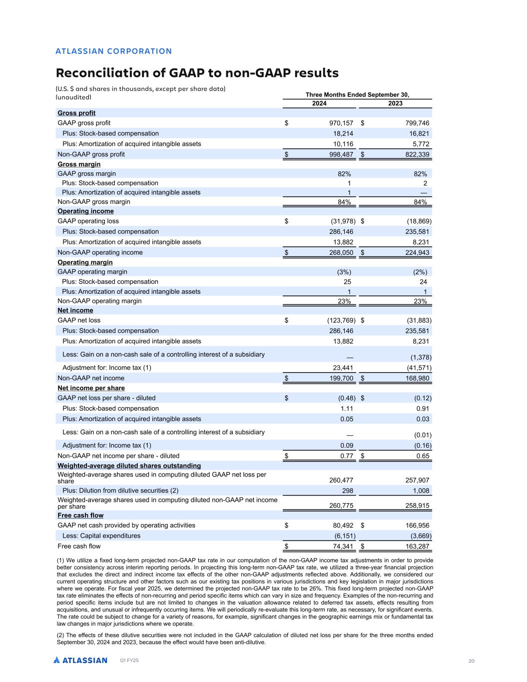 Q1 FY25 20 .S ARR AM 0N ON AS NM ECNMC AS NM NF 4..: SN 8NM$4..: ERT SR % % AMD R A ER M S NTRAMDR EWCEOS OE CEMSAGE AMD OE R A E DASA TMATD SED EE NMS R 2MDED EOSELBE ) ( ( ( () 4 NRR O NF S 711 SPTT SPG - - - - , M T0 PDL$CBTFE DPN FOTB PO . ( , .( M T0 1NPS B PO PG BDR SFE O BO CMF BTTF T , --( PO$711 SPTT SPG . .- .(( )) 4 NRR LA G M 711 SPTT NBS O .( .( M T0 PDL$CBTFE DPN FOTB PO ( M T0 1NPS B PO PG BDR SFE O BO CMF BTTF T PO$711 SPTT NBS O . . OE AS MG MCNLE 711 P FSB O MPTT ) -. . ., M T0 PDL$CBTFE DPN FOTB PO (., , () . M T0 1NPS B PO PG BDR SFE O BO CMF BTTF T ) ..( . () PO$711 P FSB O ODPNF (,. (( ) OE AS MG LA G M 711 P FSB O NBS O ) ( M T0 PDL$CBTFE DPN FOTB PO ( ( M T0 1NPS B PO PG BDR SFE O BO CMF BTTF T PO$711 P FSB O NBS O () () 8ES MCNLE 711 OF MPTT () -, ) ..) M T0 PDL$CBTFE DPN FOTB PO (., , () . M T0 1NPS B PO PG BDR SFE O BO CMF BTTF T ) ..( . () 9FTT0 7B O PO B OPO$DBTI TBMF PG B DPO SPMM O O FSFT PG B T CT E BS )-. 1E T NFO GPS0 8ODPNF B () - PO$711 OF ODPNF - ,. . 8ES MCNLE OE R A E 711 OF MPTT FS TIBSF $ E M FE % . % ( M T0 PDL$CBTFE DPN FOTB PO % % M T0 1NPS B PO PG BDR SFE O BO CMF BTTF T % % ) 9FTT0 7B O PO B OPO$DBTI TBMF PG B DPO SPMM O O FSFT PG B T CT E BS % 1E T NFO GPS0 8ODPNF B % % , PO$711 OF ODPNF FS TIBSF $ E M FE %-- %, E G SED$AUE AGE D TSED R A ER NTSRSAMD MG AF I FE$BWFSB F TIBSFT TFE O DPN O E M FE 711 OF MPTT FS TIBSF (, -- ( - - M T0 4 M PO GSPN E M WF TFD S FT ( ( . . AF I FE$BWFSB F TIBSFT TFE O DPN O E M FE OPO$711 OF ODPNF FS TIBSF (, -- ( . 3 EE CAR F N 711 OF DBTI SPW EFE C P FSB O BD W FT . ( ,, , 9FTT0 3B BM F FOE SFT , ) ,, 6SFF DBTI GMP - ) ,) (.- AF M F B G FE MPO $ FSN SP FD FE OPO$711 B SB F O P S DPN B PO PG IF OPO$711 ODPNF B BE T NFO T O PSEFS P SPW EF CF FS DPOT T FOD BDSPTT O FS N SF PS O FS PET% 8O SP FD O I T MPO $ FSN OPO$711 B SB F F M FE B ISFF$ FBS G OBOD BM SP FD PO IB F DM EFT IF E SFD BOE OE SFD ODPNF B FGGFD T PG IF P IFS OPO$711 BE T NFO T SFGMFD FE BCPWF% 1EE POBMM F DPOT EFSFE P S D SSFO P FSB O T S D SF BOE P IFS GBD PST T DI BT P S F T O B PT POT O WBS P T S TE D POT BOE LF MF TMB PO O NB PS S TE D POT IFSF F P FSB F% 6PS G TDBM FBS ( ( F EF FSN OFE IF SP FD FE OPO$711 B SB F P CF (, % I T G FE MPO $ FSN SP FD FE OPO$711 B SB F FM N OB FT IF FGGFD T PG OPO$SFD SS O BOE FS PE T FD G D FNT I DI DBO WBS O T F BOE GSFR FOD % 5 BN MFT PG IF OPO$SFD SS O BOE FS PE T FD G D FNT ODM EF C BSF OP M N FE P DIBO FT O IF WBM B PO BMMP BODF SFMB FE P EFGFSSFE B BTTF T FGGFD T SFT M O GSPN BDR T POT BOE O T BM PS OGSFR FO M PDD SS O FNT% AF MM FS PE DBMM SF$FWBM B F I T MPO $ FSN SB F BT OFDFTTBS GPS T O G DBO FWFO T% IF SB F DP ME CF T C FD P DIBO F GPS B WBS F PG SFBTPOT GPS F BN MF T O G DBO DIBO FT O IF FP SB I D FBSO O T N PS G OEBNFO BM B MB DIBO FT O NB PS S TE D POT IFSF F P FSB F% ( IF FGGFD T PG IFTF E M WF TFD S FT FSF OP ODM EFE O IF 711 DBMD MB PO PG E M FE OF MPTT FS TIBSF GPS IF ISFF NPO IT FOEFE F FNCFS ) ( ( BOE ( () CFDB TF IF FGGFD P ME IBWF CFFO BO $E M WF% ATLASSIAN CORPORATION Reconciliation of GAAP to non-GAAP results (U.S. $ and shares in thousands, except per share data) (unaudited) S S S F S $ S % % S S S S S S S F S S S G M T0 $ M T0 S G S M $ S S G S S M T0 $ M T0 S G S M $ S S S S M M T0 $ M T0 S G S M $ S S S S M T0 $ M T0 S G S M $ S S S M M T0 $ M T0 S G S M TT0 $ M G S MM S G S G S0 8 $ S M S S $ M % % M T0 $ % % M T0 S G S M % % TT0 $ M G S MM S G S % G S0 8 % % $ S S $ M % % S $ S S S $ S S M M S T S M T0 M GS M S $ S S M $ S T S F S S TT0 M S S D GM F M G M $ S S D $ S S G $ S CF FS DPOT T D DS TT S S S S % 8 S M $ S $ S M S $ S G M IB F DM E T S D S D D GG G S $ S GM % MM D SSFO P FS T S D S S G D S S S S M M IFSF F P S % S G TD M S S S $ S % G M $ S S B SB F FM T G D T G $S D SS S G S GS % M G FS PE T FD G D T DM S M M MM S M G SS GG M G BDR T POT T M S GS M SS % M S MM S $ M M $ S S S G S G % IF SB F DP M T D D G S S G S G S M G S S S G M MB DIBO FT S S T D T S S % ( IF F G D T G T M W T D S S M M M G M M S S G S S F F CFS D T GG M $ M %