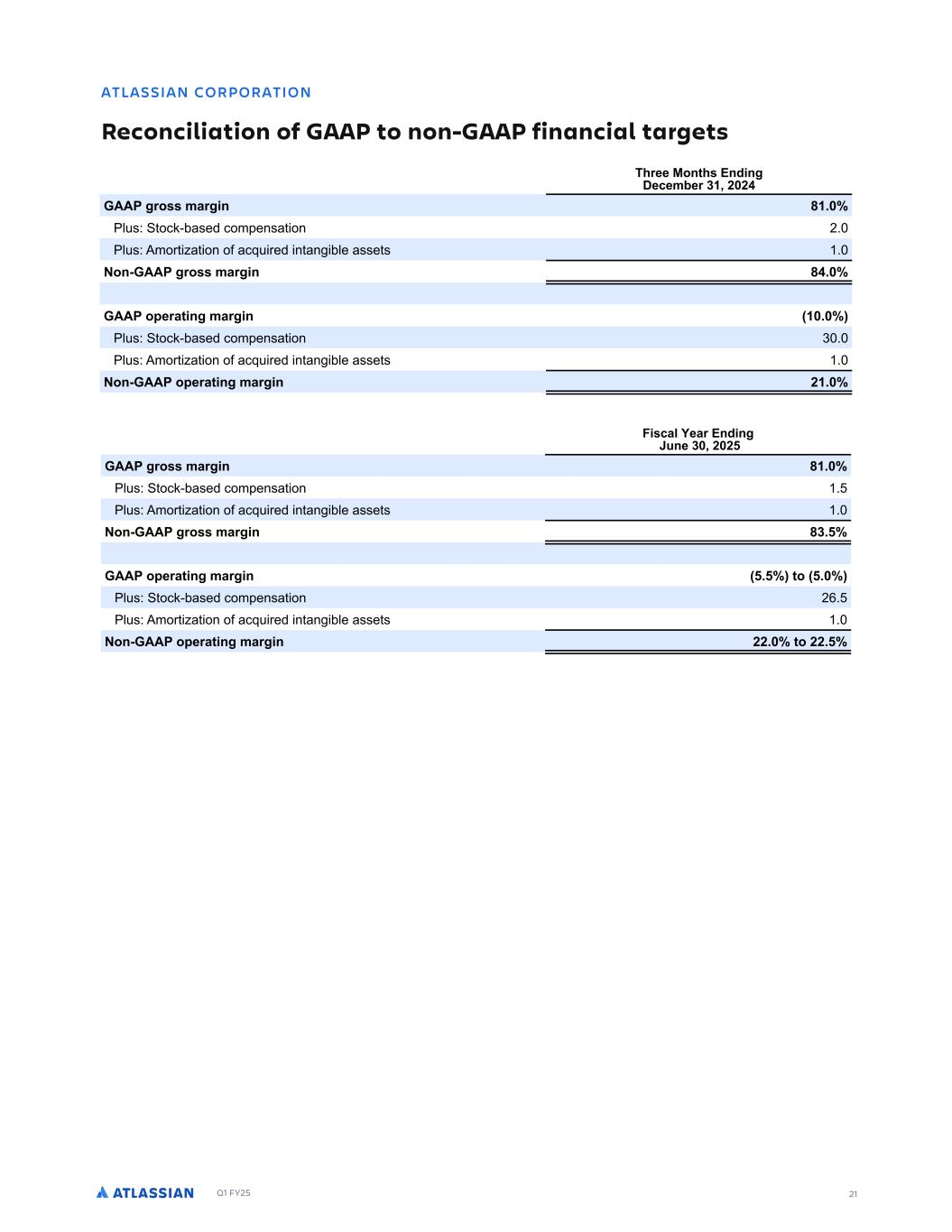 Q1 FY25 21 ATLASSIAN CORPORATION Reconciliation of GAAP to non-GAAP financial targets , A D -EGFEG AED ED A A AED E 1,,5 E 4ED 1,,5 0AD D A G G 3ED D AD . C G ( % ) 1,,5 GE C G AD % -3 . - 5 6 2 6 5 : 2 2 6 0 - 2: . 26 612 4ED 1,,5 GE C G AD ) % 1,,5 EF G AD C G AD % % -3 . - 5 6 2 6 5 : 2 2 6 0 - 2: . 26 612 4ED 1,,5 EF G AD C G AD %  0A 8 G D AD 2JD (% % 1,,5 GE C G AD % -3 . - 5 6 2 6 5 : 2 2 6 0 - 2: . 26 612 4ED 1,,5 GE C G AD ( 1,,5 EF G AD C G AD E % -3 . - 5 6 2 6 5 : 2 2 6 0 - 2: . 26 612 4ED 1,,5 EF G AD C G AD % E , A D -EGFEG AED ED A A AED E 1,,5 E 4ED 1,,5 0AD D A G G 3ED D AD . C G ( % ) 1,,5 GE C G AD % -3 . - 5 6 2 6 5 : 2 2 6 0 - 2: . 26 612 4ED 1,,5 GE C G AD ) % 1,,5 EF G AD C G AD % % -3 . - 5 6 2 6 5 : 2 2 6 0 - 2: . 26 612 4ED 1,,5 EF G AD C G AD %  0A 8 G D AD 2JD (% % 1,,5 GE C G AD % -3 . - 5 6 2 6 5 : 2 2 6 0 - 2: . 26 612 4ED 1,,5 GE C G AD ( 1,,5 EF G AD C G AD E % -3 . - 5 6 2 6 5 : 2 2 6 0 - 2: . 26 612 4ED 1,,5 EF G AD C G AD % E