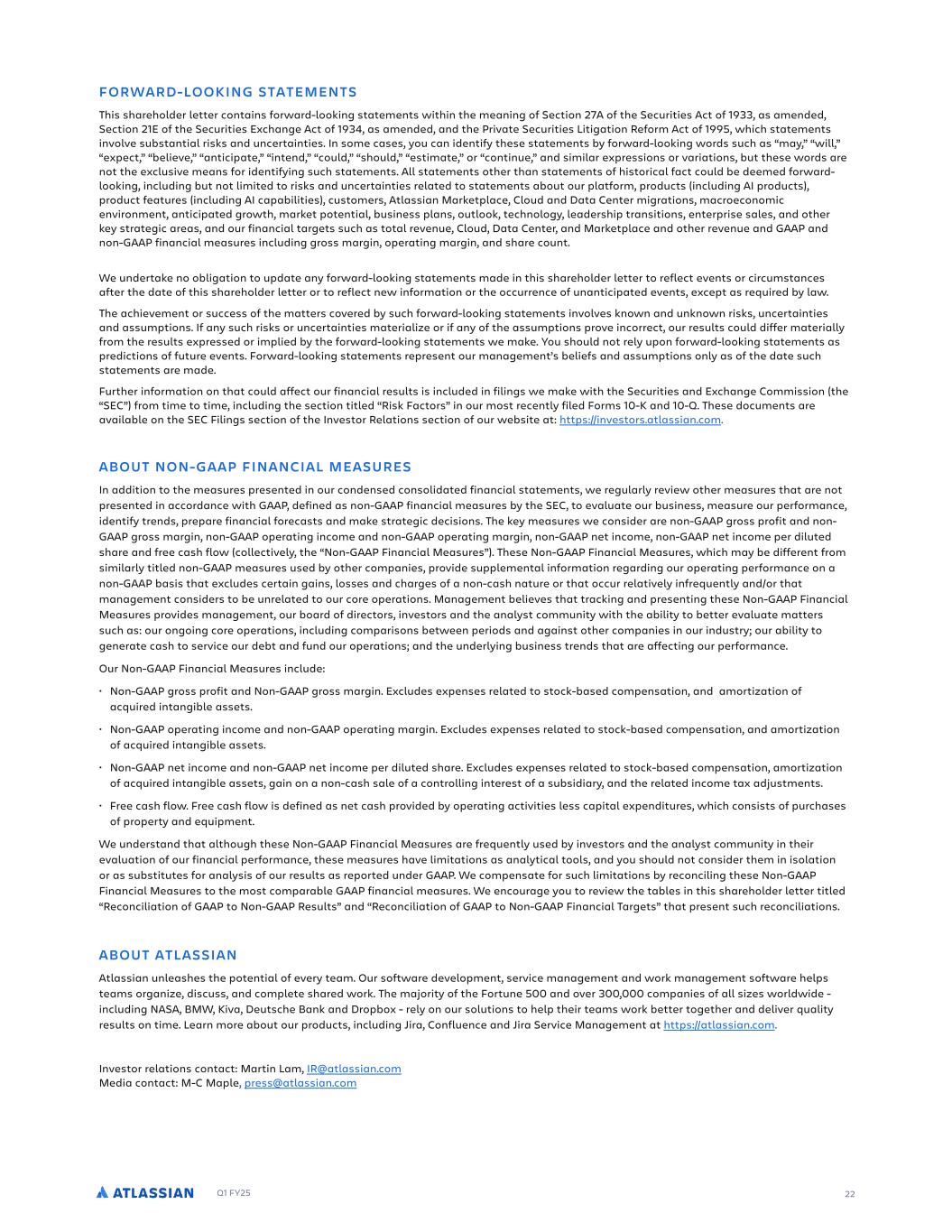 Q1 FY25 22 FORWARD-LOOKING STATEMENTS This shareholder letter contains forward-looking statements within the meaning of Section 27A of the Securities Act of 1933, as amended, Section 21E of the Securities Exchange Act of 1934, as amended, and the Private Securities Litigation Reform Act of 1995, which statements involve substantial risks and uncertainties. In some cases, you can identify these statements by forward-looking words such as “may,” “will,” “expect,” “believe,” “anticipate,” “intend,” “could,” “should,” “estimate,” or “continue,” and similar expressions or variations, but these words are not the exclusive means for identifying such statements. All statements other than statements of historical fact could be deemed forward- looking, including but not limited to risks and uncertainties related to statements about our platform, products (including AI products), product features (including AI capabilities), customers, Atlassian Marketplace, Cloud and Data Center migrations, macroeconomic environment, anticipated growth, market potential, business plans, outlook, technology, leadership transitions, enterprise sales, and other key strategic areas, and our financial targets such as total revenue, Cloud, Data Center, and Marketplace and other revenue and GAAP and non-GAAP financial measures including gross margin, operating margin, and share count. We undertake no obligation to update any forward-looking statements made in this shareholder letter to reflect events or circumstances after the date of this shareholder letter or to reflect new information or the occurrence of unanticipated events, except as required by law. The achievement or success of the matters covered by such forward-looking statements involves known and unknown risks, uncertainties and assumptions. If any such risks or uncertainties materialize or if any of the assumptions prove incorrect, our results could differ materially from the results expressed or implied by the forward-looking statements we make. You should not rely upon forward-looking statements as predictions of future events. Forward-looking statements represent our management’s beliefs and assumptions only as of the date such statements are made. Further information on that could affect our financial results is included in filings we make with the Securities and Exchange Commission (the “SEC”) from time to time, including the section titled “Risk Factors” in our most recently filed Forms 10-K and 10-Q. These documents are available on the SEC Filings section of the Investor Relations section of our website at: https://investors.atlassian.com. ABOUT NON-GAAP FINANCIAL MEASURES In addition to the measures presented in our condensed consolidated financial statements, we regularly review other measures that are not presented in accordance with GAAP, defined as non-GAAP financial measures by the SEC, to evaluate our business, measure our performance, identify trends, prepare financial forecasts and make strategic decisions. The key measures we consider are non-GAAP gross profit and non- GAAP gross margin, non-GAAP operating income and non-GAAP operating margin, non-GAAP net income, non-GAAP net income per diluted share and free cash flow (collectively, the “Non-GAAP Financial Measures”). These Non-GAAP Financial Measures, which may be different from similarly titled non-GAAP measures used by other companies, provide supplemental information regarding our operating performance on a non-GAAP basis that excludes certain gains, losses and charges of a non-cash nature or that occur relatively infrequently and/or that management considers to be unrelated to our core operations. Management believes that tracking and presenting these Non-GAAP Financial Measures provides management, our board of directors, investors and the analyst community with the ability to better evaluate matters such as: our ongoing core operations, including comparisons between periods and against other companies in our industry; our ability to generate cash to service our debt and fund our operations; and the underlying business trends that are affecting our performance. Our Non-GAAP Financial Measures include: • Non-GAAP gross profit and Non-GAAP gross margin. Excludes expenses related to stock-based compensation, and amortization of acquired intangible assets. • Non-GAAP operating income and non-GAAP operating margin. Excludes expenses related to stock-based compensation, and amortization of acquired intangible assets. • Non-GAAP net income and non-GAAP net income per diluted share. Excludes expenses related to stock-based compensation, amortization of acquired intangible assets, gain on a non-cash sale of a controlling interest of a subsidiary, and the related income tax adjustments. • Free cash flow. Free cash flow is defined as net cash provided by operating activities less capital expenditures, which consists of purchases of property and equipment. We understand that although these Non-GAAP Financial Measures are frequently used by investors and the analyst community in their evaluation of our financial performance, these measures have limitations as analytical tools, and you should not consider them in isolation or as substitutes for analysis of our results as reported under GAAP. We compensate for such limitations by reconciling these Non-GAAP Financial Measures to the most comparable GAAP financial measures. We encourage you to review the tables in this shareholder letter titled “Reconciliation of GAAP to Non-GAAP Results” and “Reconciliation of GAAP to Non-GAAP Financial Targets” that present such reconciliations. ABOUT ATLASSIAN Atlassian unleashes the potential of every team. Our software development, service management and work management software helps teams organize, discuss, and complete shared work. The majority of the Fortune 500 and over 300,000 companies of all sizes worldwide - including NASA, BMW, Kiva