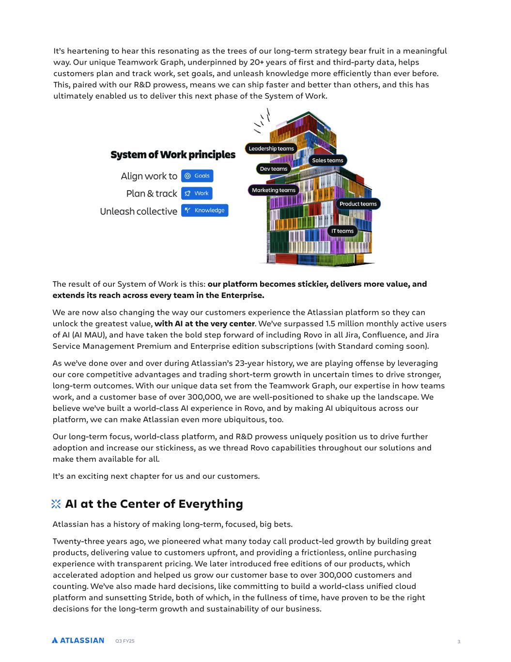 Q3 FY25 Unleash collective Align work to Plan & track 3 It’s heartening to hear this resonating as the trees of our long-term strategy bear fruit in a meaningful way. Our unique Teamwork Graph, underpinned by 20+ years of first and third-party data, helps customers plan and track work, set goals, and unleash knowledge more efficiently than ever before. This, paired with our R&D prowess, means we can ship faster and better than others, and this has ultimately enabled us to deliver this next phase of the System of Work. The result of our System of Work is this: our platform becomes stickier, delivers more value, and extends its reach across every team in the Enterprise. We are now also changing the way our customers experience the Atlassian platform so they can unlock the greatest value, with AI at the very center. We’ve surpassed 1.5 million monthly active users of AI (AI MAU), and have taken the bold step forward of including Rovo in all Jira, Confluence, and Jira Service Management Premium and Enterprise edition subscriptions (with Standard coming soon). As we’ve done over and over during Atlassian’s 23-year history, we are playing offense by leveraging our core competitive advantages and trading short-term growth in uncertain times to drive stronger, long-term outcomes. With our unique data set from the Teamwork Graph, our expertise in how teams work, and a customer base of over 300,000, we are well-positioned to shake up the landscape. We believe we’ve built a world-class AI experience in Rovo, and by making AI ubiquitous across our platform, we can make Atlassian even more ubiquitous, too. Our long-term focus, world-class platform, and R&D prowess uniquely position us to drive further adoption and increase our stickiness, as we thread Rovo capabilities throughout our solutions and make them available for all. It’s an exciting next chapter for us and our customers. AI at the Center of Everything Atlassian has a history of making long-term, focused, big bets. Twenty-three years ago, we pioneered what many today call product-led growth by building great products, delivering value to customers upfront, and providing a frictionless, online purchasing experience with transparent pricing. We later introduced free editions of our products, which accelerated adoption and helped us grow our customer base to over 300,000 customers and counting. We’ve also made hard decisions, like committing to build a world-class unified cloud platform and sunsetting Stride, both of which, in the fullness of time, have proven to be the right decisions for the long-term growth and sustainability of our business.