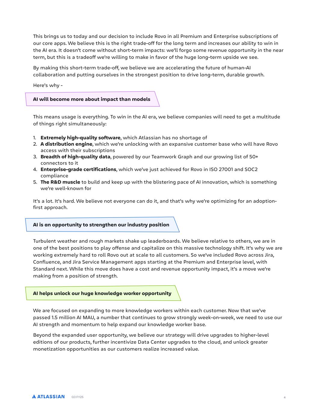 Q3 FY25 4 This brings us to today and our decision to include Rovo in all Premium and Enterprise subscriptions of our core apps. We believe this is the right trade-off for the long term and increases our ability to win in the AI era. It doesn’t come without short-term impacts: we’ll forgo some revenue opportunity in the near term, but this is a tradeoff we’re willing to make in favor of the huge long-term upside we see. By making this short-term trade-off, we believe we are accelerating the future of human-AI collaboration and putting ourselves in the strongest position to drive long-term, durable growth. Here’s why - AI will become more about impact than models This means usage is everything. To win in the AI era, we believe companies will need to get a multitude of things right simultaneously: 1. Extremely high-quality software, which Atlassian has no shortage of 2. A distribution engine, which we’re unlocking with an expansive customer base who will have Rovo access with their subscriptions 3. Breadth of high-quality data, powered by our Teamwork Graph and our growing list of 50+ connectors to it 4. Enterprise-grade certifications, which we’ve just achieved for Rovo in ISO 27001 and SOC2 compliance 5. The R&D muscle to build and keep up with the blistering pace of AI innovation, which is something we’re well-known for It’s a lot. It’s hard. We believe not everyone can do it, and that’s why we’re optimizing for an adoption- first approach. AI is an opportunity to strengthen our industry position Turbulent weather and rough markets shake up leaderboards. We believe relative to others, we are in one of the best positions to play offense and capitalize on this massive technology shift. It’s why we are working extremely hard to roll Rovo out at scale to all customers. So we’ve included Rovo across Jira, Confluence, and Jira Service Management apps starting at the Premium and Enterprise level, with Standard next. While this move does have a cost and revenue opportunity impact, it’s a move we’re making from a position of strength. AI helps unlock our huge knowledge worker opportunity We are focused on expanding to more knowledge workers within each customer. Now that we’ve passed 1.5 million AI MAU, a number that continues to grow strongly week-on-week, we need to use our AI strength and momentum to help expand our knowledge worker base. Beyond the expanded user opportunity, we believe our strategy will drive upgrades to higher-level editions of our products, further incentivize Data Center upgrades to the cloud, and unlock greater monetization opportunities as our customers realize increased value.