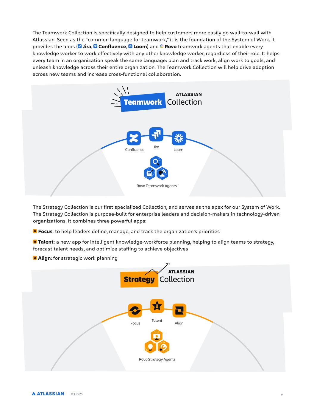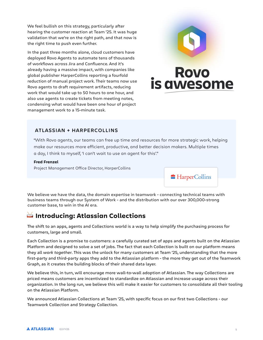 Q3 FY25 5 We feel bullish on this strategy, particularly after hearing the customer reaction at Team ’25. It was huge validation that we’re on the right path, and that now is the right time to push even further. In the past three months alone, cloud customers have deployed Rovo Agents to automate tens of thousands of workflows across Jira and Confluence. And it’s already having a massive impact, with companies like global publisher HarperCollins reporting a fourfold reduction of manual project work. Their teams now use Rovo agents to draft requirement artifacts, reducing work that would take up to 50 hours to one hour, and also use agents to create tickets from meeting notes, condensing what would have been one hour of project management work to a 15-minute task. “With Rovo agents, our teams can free up time and resources for more strategic work, helping make our resources more efficient, productive, and better decision makers. Multiple times a day, I think to myself, ‘I can’t wait to use an agent for this’.” Fred Frenzel Project Management Office Director, HarperCollins ATLASSIAN + HARPERCOLLINS We believe we have the data, the domain expertise in teamwork - connecting technical teams with business teams through our System of Work - and the distribution with our over 300,000-strong customer base, to win in the AI era. Rovo is awesome Introducing: Atlassian Collections The shift to an apps, agents and Collections world is a way to help simplify the purchasing process for customers, large and small. Each Collection is a promise to customers: a carefully curated set of apps and agents built on the Atlassian Platform and designed to solve a set of jobs. The fact that each Collection is built on our platform means they all work together. This was the unlock for many customers at Team ’25, understanding that the more first-party and third-party apps they add to the Atlassian platform - the more they get out of the Teamwork Graph, as it creates the building blocks of their shared data layer. We believe this, in turn, will encourage more wall-to-wall adoption of Atlassian. The way Collections are priced means customers are incentivized to standardize on Atlassian and increase usage across their organization. In the long run, we believe this will make it easier for customers to consolidate all their tooling on the Atlassian Platform. We announced Atlassian Collections at Team ’25, with specific focus on our first two Collections - our Teamwork Collection and Strategy Collection. 🥁