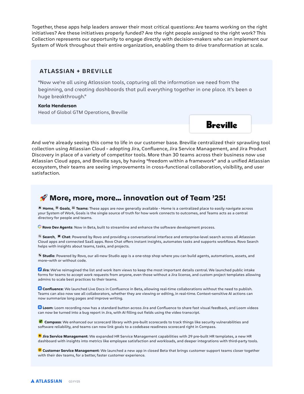Q3 FY25 Home, Goals, Teams: These apps are now generally available - Home is a centralized place to easily navigate across your System of Work, Goals is the single source of truth for how work connects to outcomes, and Teams acts as a central directory for people and teams. Rovo Dev Agents: Now in Beta, built to streamline and enhance the software development process. Search, Chat: Powered by Rovo and providing a conversational interface and enterprise-level search across all Atlassian Cloud apps and connected SaaS apps. Rovo Chat offers instant insights, automates tasks and supports workflows. Rovo Search helps with insights about teams, tasks, and projects. Studio: Powered by Rovo, our all-new Studio app is a one-stop shop where you can build agents, automations, assets, and more—with or without code. Jira: We’ve reimagined the list and work item views to keep the most important details central. We launched public intake forms for teams to accept work requests from anyone, even those without a Jira license, and custom project templates allowing admins to scale best practices to their teams. Confluence: We launched Live Docs in Confluence in Beta, allowing real-time collaborations without the need to publish. Teams can also now see all collaborators, whether they are viewing or editing, in real-time. Context-sensitive AI actions can now summarize long pages and improve writing. Loom: Loom recording now has a standard button across Jira and Confluence to share fast visual feedback, and Loom videos can now be turned into a bug report in Jira, with AI filling out fields using the video transcript. Compass: We enhanced our scorecard library with pre-built scorecards to track things like security vulnerabilities and software reliability, and teams can now link goals to a codebase readiness scorecard right in Compass. Jira Service Management: We expanded HR Service Management capabilities with 29 pre-built HR templates, a new HR dashboard with insights into metrics like employee satisfaction and workloads, and deeper integrations with third-party tools. Customer Service Management: We launched a new app in closed Beta that brings customer support teams closer together with their dev teams, for a better, faster customer experience. Together, these apps help leaders answer their most critical questions: Are teams working on the right initiatives? Are these initiatives properly funded? Are the right people assigned to the right work? This Collection represents our opportunity to engage directly with decision-makers who can implement our System of Work throughout their entire organization, enabling them to drive transformation at scale. And we’re already seeing this come to life in our customer base. Breville centralized their sprawling tool collection using Atlassian Cloud - adopting Jira, Confluence, Jira Service Management, and Jira Product Discovery in place of a variety of competitor tools. More than 30 teams across their business now use Atlassian Cloud apps, and Breville says, by having “freedom within a framework” and a unified Atlassian ecosystem, their teams are seeing improvements in cross-functional collaboration, visibility, and user satisfaction. “Now we’re all using Atlassian tools, capturing all the information we need from the beginning, and creating dashboards that pull everything together in one place. It’s been a huge breakthrough.” Karla Henderson Head of Global GTM Operations, Breville ATLASSIAN + BREVILLE 🚀 More, more, more… innovation out of Team ’25!