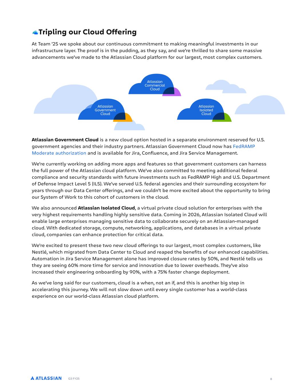 Q3 FY25 8 Tripling our Cloud Offering At Team ’25 we spoke about our continuous commitment to making meaningful investments in our infrastructure layer. The proof is in the pudding, as they say, and we’re thrilled to share some massive advancements we’ve made to the Atlassian Cloud platform for our largest, most complex customers. Atlassian Government Cloud Atlassian Isolated Cloud Atlassian Commercial Cloud Atlassian Government Cloud is a new cloud option hosted in a separate environment reserved for U.S. government agencies and their industry partners. Atlassian Government Cloud now has FedRAMP Moderate authorization and is available for Jira, Confluence, and Jira Service Management. We’re currently working on adding more apps and features so that government customers can harness the full power of the Atlassian cloud platform. We’ve also committed to meeting additional federal compliance and security standards with future investments such as FedRAMP High and U.S. Department of Defense Impact Level 5 (IL5). We’ve served U.S. federal agencies and their surrounding ecosystem for years through our Data Center offerings, and we couldn’t be more excited about the opportunity to bring our System of Work to this cohort of customers in the cloud. We also announced Atlassian Isolated Cloud, a virtual private cloud solution for enterprises with the very highest requirements handling highly sensitive data. Coming in 2026, Atlassian Isolated Cloud will enable large enterprises managing sensitive data to collaborate securely on an Atlassian-managed cloud. With dedicated storage, compute, networking, applications, and databases in a virtual private cloud, companies can enhance protection for critical data. We’re excited to present these two new cloud offerings to our largest, most complex customers, like Nestlé, which migrated from Data Center to Cloud and reaped the benefits of our enhanced capabilities. Automation in Jira Service Management alone has improved closure rates by 50%, and Nestlé tells us they are seeing 60% more time for service and innovation due to lower overheads. They’ve also increased their engineering onboarding by 90%, with a 75% faster change deployment. As we’ve long said for our customers, cloud is a when, not an if, and this is another big step in accelerating this journey. We will not slow down until every single customer has a world-class experience on our world-class Atlassian cloud platform.