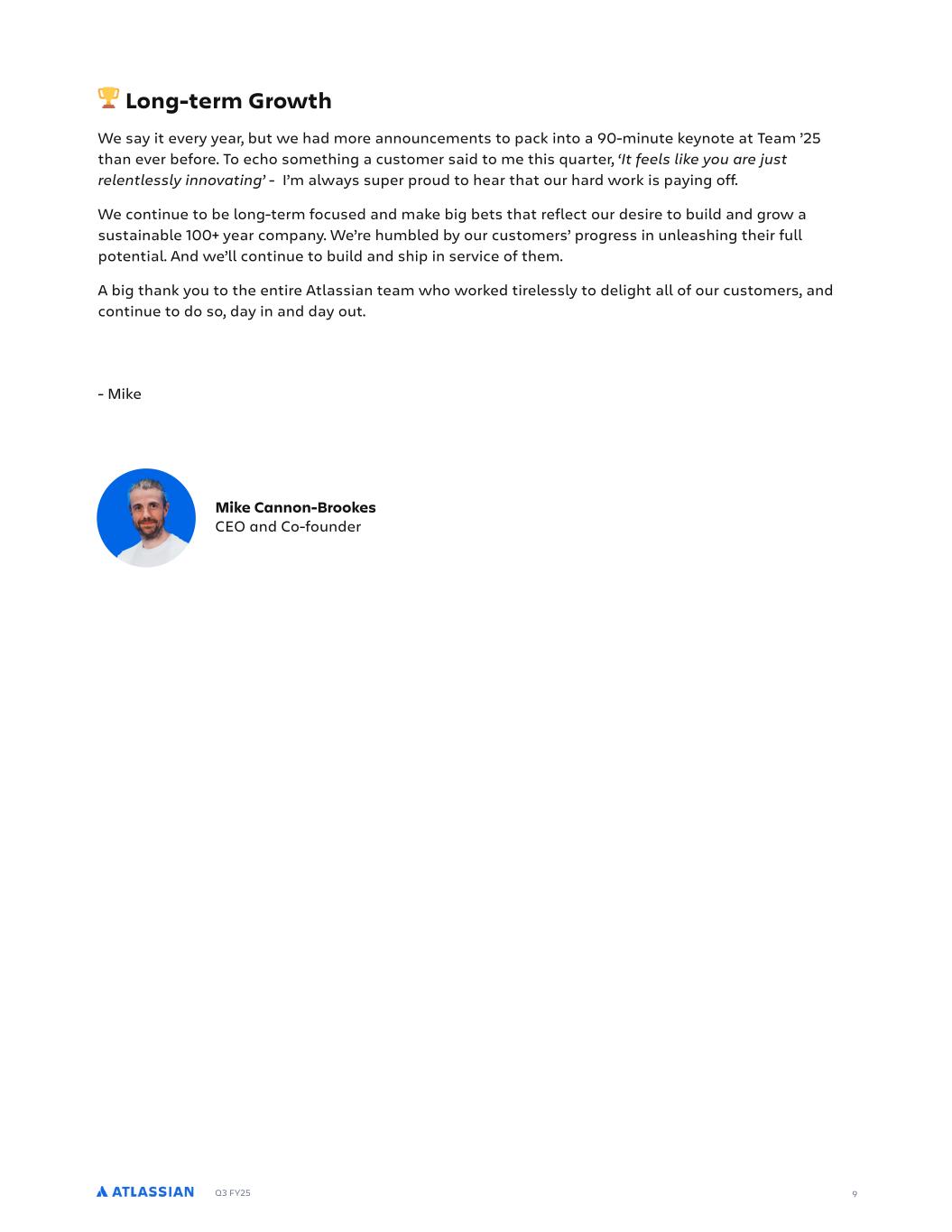 Q3 FY25 9 Long-term Growth We say it every year, but we had more announcements to pack into a 90-minute keynote at Team ’25 than ever before. To echo something a customer said to me this quarter, ‘It feels like you are just relentlessly innovating’ - I’m always super proud to hear that our hard work is paying off. We continue to be long-term focused and make big bets that reflect our desire to build and grow a sustainable 100+ year company. We’re humbled by our customers’ progress in unleashing their full potential. And we’ll continue to build and ship in service of them. A big thank you to the entire Atlassian team who worked tirelessly to delight all of our customers, and continue to do so, day in and day out. - Mike Mike Cannon-Brookes CEO and Co-founder