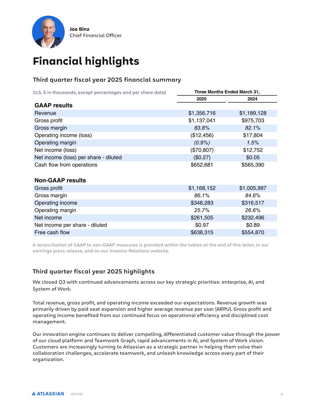 Q3 FY25 11 Third quarter fiscal year 2025 financial summary (U.S. $ in thousands, except percentages and per share data) A reconciliation of GAAP to non-GAAP measures is provided within the tables at the end of this letter, in our earnings press release, and on our Investor Relations website. Joe Binz Chief Financial Officer Financial highlights ALMUH T EUWIU RJ JM GEO IEU )'), JMQEQGMEO PPEU V aU b N Q % RePR a R UN R QNaN N Q R PR aNTR ALUII :RQWL 3QHIH :EUGL ($ )'), )') 5// UI OW GRcR bR *%,./%0*/ *%*12%*+1 SVa *%*,0%)-* 20.%0), N TV * ) ( D R NaV T V P R Y *+%-./ *0%1)- D R NaV T N TV 0 ( , CRa V P R Y 0)%1)0 *+%0.+ CRa V P R Y R UN R QVYbaRQ ) +0 ) ). 8N U SY d S R NaV /.+%/1* ./.%,2) RQ%5// UI OW SVa *%*/1%*.+ *%)).%220 N TV - ( - D R NaV T V P R ,-1%+1, ,*/%.*0 D R NaV T N TV ), . )- - CRa V P R +/*%.). +,+%-2/ CRa V P R R UN R QVYbaRQ ) 20 ) 12 ; RR PN U SY d /,1%,*. ..-%10) Third quarter fiscal year 2025 highlights We closed Q3 with continued advancements across our key strategic priorities: enterprise, AI, and System of Work. Total revenue, gross profit, and operating income exceeded our expectations. Revenue growth was primarily driven by paid seat expansion and higher average revenue per user (ARPU). Gross profit and operating income benefited from our continued focus on operational efficiency and disciplined cost management. Our innovation engine continues to deliver compelling, differentiated customer value through the power of our cloud platform and Teamwork Graph, rapid advancements in AI, and System of Work vision. Customers are increasingly turning to Atlassian as a strategic partner in helping them solve their collaboration challenges, accelerate teamwork, and unleash knowledge across every part of their organization.