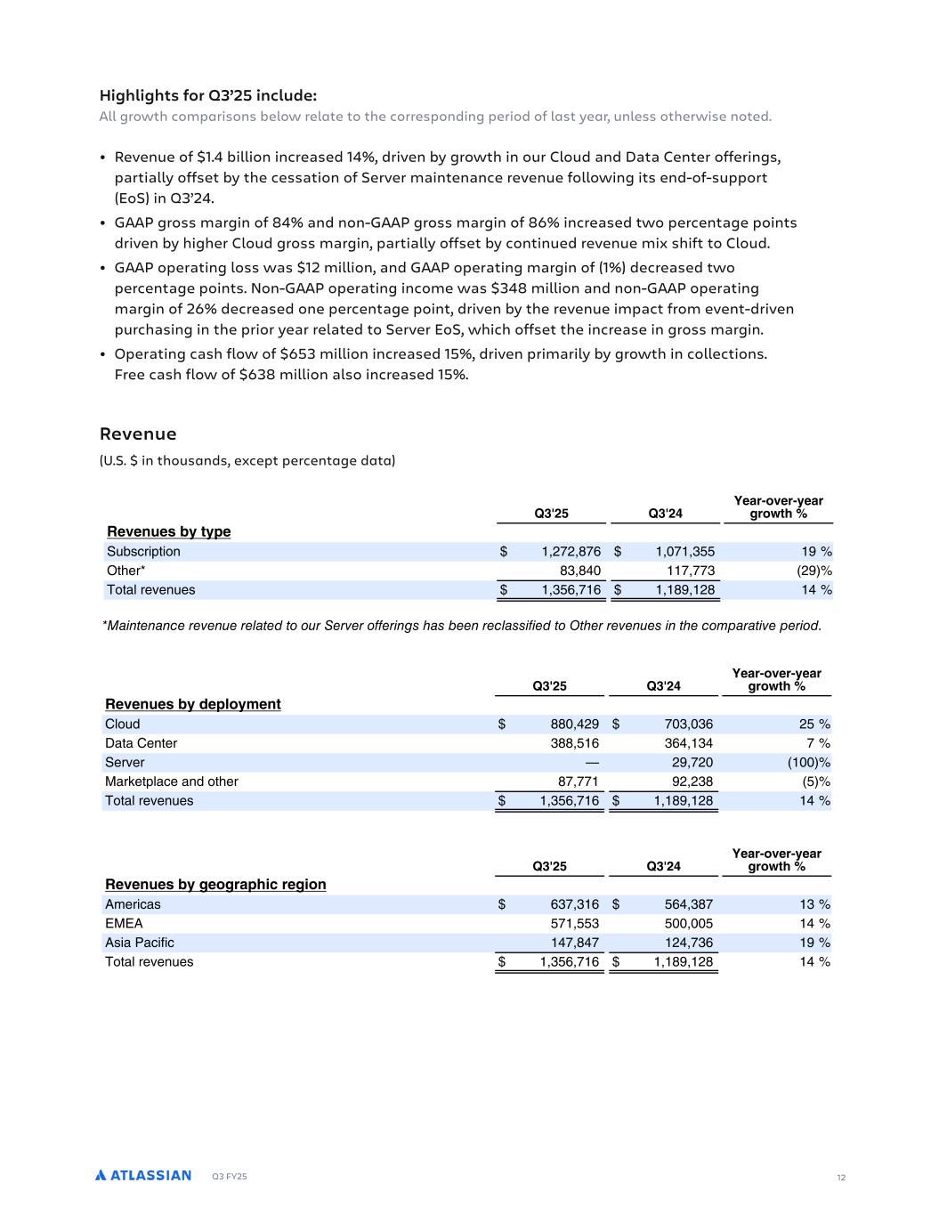Q3 FY25 Highlights for Q3’25 include: All growth comparisons below relate to the corresponding period of last year, unless otherwise noted. • Revenue of $1.4 billion increased 14%, driven by growth in our Cloud and Data Center offerings, partially offset by the cessation of Server maintenance revenue following its end-of-support (EoS) in Q3’24. • GAAP gross margin of 84% and non-GAAP gross margin of 86% increased two percentage points driven by higher Cloud gross margin, partially offset by continued revenue mix shift to Cloud. • GAAP operating loss was $12 million, and GAAP operating margin of (1%) decreased two percentage points. Non-GAAP operating income was $348 million and non-GAAP operating margin of 26% decreased one percentage point, driven by the revenue impact from event-driven purchasing in the prior year related to Server EoS, which offset the increase in gross margin. • Operating cash flow of $653 million increased 15%, driven primarily by growth in collections. Free cash flow of $638 million also increased 15%. Revenue (U.S. $ in thousands, except percentage data) ALMUH T EUWIU RJ JM GEO )'), UIYIQ I UI OW V aU b N Q % RePR a R PR aNTR > ), > ) DIEU%RYIU% IEU UR WL IYIQ I F W SI HbO P V aV *%+0+%10/ *%)0*%,.. *2 DaUR 1,%1-) **0%00, +2 I aNY RcR bR *%,./%0*/ *%*12%*+1 *- 5 CF F F M F G G M G CFA F C C G 7 M F CF G CM CG > ), > ) DIEU%RYIU% IEU UR WL IYIQ I F HISOR PIQW 8Y bQ 11)%-+2 0),%),/ +. 9NaN 8R aR ,11%.*/ ,/-%*,- 0 HR cR j +2%0+) *)) BN Ra YNPR N Q aUR 10%00* 2+%+,1 . I aNY RcR bR *%,./%0*/ *%*12%*+1 *- > ), > ) DIEU%RYIU% IEU UR WL IYIQ I F IR UESLMG UI MRQ 6 R VPN /,0%,*/ ./-%,10 *, :B:6 .0*%.., .))%)). *- 6 VN ENPVSVP *-0%1-0 *+-%0,/ *2 I aNY RcR bR *%,./%0*/ *%*12%*+1 *- ) 12