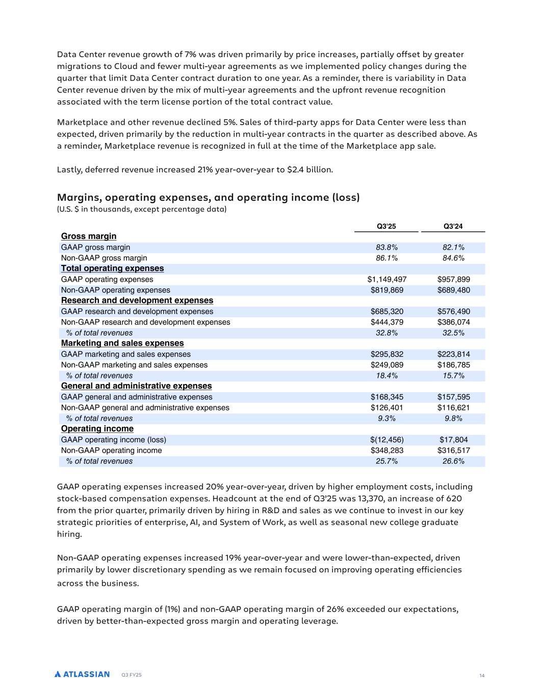 Q3 FY25 14 Data Center revenue growth of 7% was driven primarily by price increases, partially offset by greater migrations to Cloud and fewer multi-year agreements as we implemented policy changes during the quarter that limit Data Center contract duration to one year. As a reminder, there is variability in Data Center revenue driven by the mix of multi-year agreements and the upfront revenue recognition associated with the term license portion of the total contract value. Marketplace and other revenue declined 5%. Sales of third-party apps for Data Center were less than expected, driven primarily by the reduction in multi-year contracts in the quarter as described above. As a reminder, Marketplace revenue is recognized in full at the time of the Marketplace app sale. Lastly, deferred revenue increased 21% year-over-year to $2.4 billion. Margins, operating expenses, and operating income (loss) (U.S. $ in thousands, except percentage data) GAAP operating expenses increased 20% year-over-year, driven by higher employment costs, including stock-based compensation expenses. Headcount at the end of Q3’25 was 13,370, an increase of 620 from the prior quarter, primarily driven by hiring in R&D and sales as we continue to invest in our key strategic priorities of enterprise, AI, and System of Work, as well as seasonal new college graduate hiring. Non-GAAP operating expenses increased 19% year-over-year and were lower-than-expected, driven primarily by lower discretionary spending as we remain focused on improving operating efficiencies across the business. GAAP operating margin of (1%) and non-GAAP operating margin of 26% exceeded our expectations, driven by better-than-expected gross margin and operating leverage. G J E I % % C I EF J NF I I CC O L GMRP LCP$ D DN NDO PG OD C LC NDO DL FD P 4 % 4 %' - EII C 722 FOMPP OF L % :ML%722 FOMPP OF L * % ( * EJ EF J NF I I 722 MNDO LF D NDLPDP ($( 0$ 0. 0,.$ 00 :ML%722 MNDO LF D NDLPDP (0$ -0 - 0$ 5 I EFC J NF I I 722 ODPD O G LC CDSD MN DL D NDLPDP - ,$*) ,.-$ 0 :ML%722 ODPD O G LC CDSD MN DL D NDLPDP $*.0 * -$ . 6 1 5 5 5 ) 0 A J I I NF I I 722 O D LF LC P DP D NDLPDP )0,$ *) ))*$ ( :ML%722 O D LF LC P DP D NDLPDP ) 0$ 0 ( -$. , 6 1 5 5 5 % ( %) - C IJ J NF I I 722 FDLDO LC C L P O SD D NDLPDP (- $* , (,.$,0, :ML%722 FDLDO LC C L P O SD D NDLPDP ()-$ ( ((-$-)( 6 1 5 5 5 2F J EC 722 MNDO LF L M D MPP ()$ ,- (.$ :ML%722 MNDO LF L M D * $) * *(-$,(. 6 1 5 5 5 ) * *
