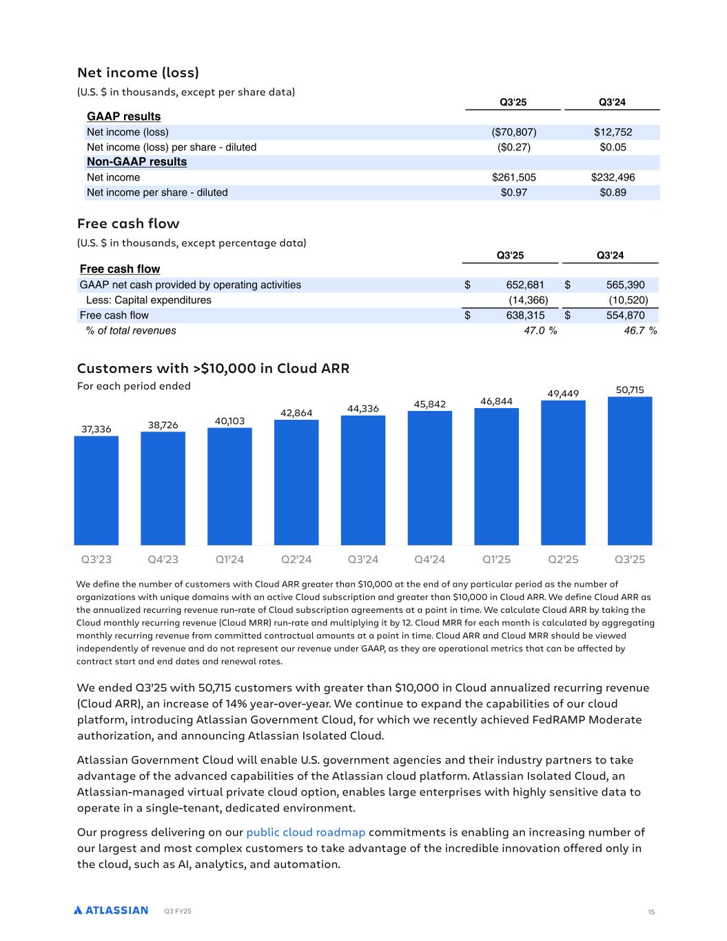 Q3 FY25 Net income (loss) (U.S. $ in thousands, except per share data) Free cash flow (U.S. $ in thousands, except percentage data) Customers with >$10,000 in Cloud ARR For each period ended We ended Q3’25 with 50,715 customers with greater than $10,000 in Cloud annualized recurring revenue (Cloud ARR), an increase of 14% year-over-year. We continue to expand the capabilities of our cloud platform, introducing Atlassian Government Cloud, for which we recently achieved FedRAMP Moderate authorization, and announcing Atlassian Isolated Cloud. Atlassian Government Cloud will enable U.S. government agencies and their industry partners to take advantage of the advanced capabilities of the Atlassian cloud platform. Atlassian Isolated Cloud, an Atlassian-managed virtual private cloud option, enables large enterprises with highly sensitive data to operate in a single-tenant, dedicated environment. Our progress delivering on our public cloud roadmap commitments is enabling an increasing number of our largest and most complex customers to take advantage of the incredible innovation offered only in the cloud, such as AI, analytics, and automation. ALMUH T EUWIU RJ JM GEO )'), IW QGRPI V aU b N Q % RePR a R UN R QNaN > ), > ) 5// UI OW CRa V P R Y 0)%1)0 *+%0.+ CRa V P R Y R UN R QVYbaRQ ) +0 ) ). RQ%5// UI OW CRa V P R +/*%.). +,+%-2/ CRa V P R R UN R QVYbaRQ ) 20 ) 12 ALMUH T EUWIU RJ JM GEO )'), 4UII 1E L 4OR V aU b N Q % RePR a R PR aNTR > ), > ) 4UII GE L JOR 66E Ra PN U cVQRQ Of R NaV T NPaVcVaVR /.+%/1* ./.%,2) AR 3 8N VaNY Re R QVab R *-%,// *)%.+) ; RR PN U SY d /,1%,*. ..-%10) G G M F . - .  ALMUH T EUWIU RJ JM GEO )'), IW QGRPI V aU b N Q % RePR a R UN R QNaN > ), > ) 5// UI OW CRa V P R Y 0)%1)0 *+%0 + CRa V P R Y R UN R QVYbaRQ ) +0 ) ). RQ%5// UI OW CRa V P R +/*%.). +,+%-2/ CRa V P R R UN R QVYbaRQ ) 20 ) 12 ALMUH T EUWIU RJ JM GEO )'), 4UII 1E L 4OR V aU b N Q % RePR a R PR aNTR > ), > ) 4UII GE L JOR 66E Ra PN U cVQRQ Of R NaV T NPaVcVaVR /.+%/1* ./.%,2) AR 3 8N VaNY Re R QVab R *-%,// *)%.+) ; RR PN U SY d /,1%,*. ..-%10) G G M F . - .  15 Q3’23 Q4’23 Q1’24 Q2’24 Q3’24 Q4’24 Q1’25 Q2’25 Q3’25 50,71549,449 46,84445,84244,33642,864 40,10338,72637,336 We define the number of customers with Cloud ARR greater than $10,000 at the end of any particular period as the number of organizations with unique domains with an active Cloud subscription and greater than $10,000 in Cloud ARR. We define Cloud ARR as the annualized recurring revenue run-rate of Cloud subscription agreements at a point in time. We calculate Cloud ARR by taking the Cloud monthly recurring revenue (Cloud MRR) run-rate and multiplying it by 12. Cloud MRR for each month is calculated by aggregating monthly recurring revenue from committed contractual amounts at a point in time. Cloud ARR and Cloud MRR should be viewed independently of revenue and do not represent our revenue under GAAP, as they are operational metrics that can be affected by contract start and end dates and renewal rates.