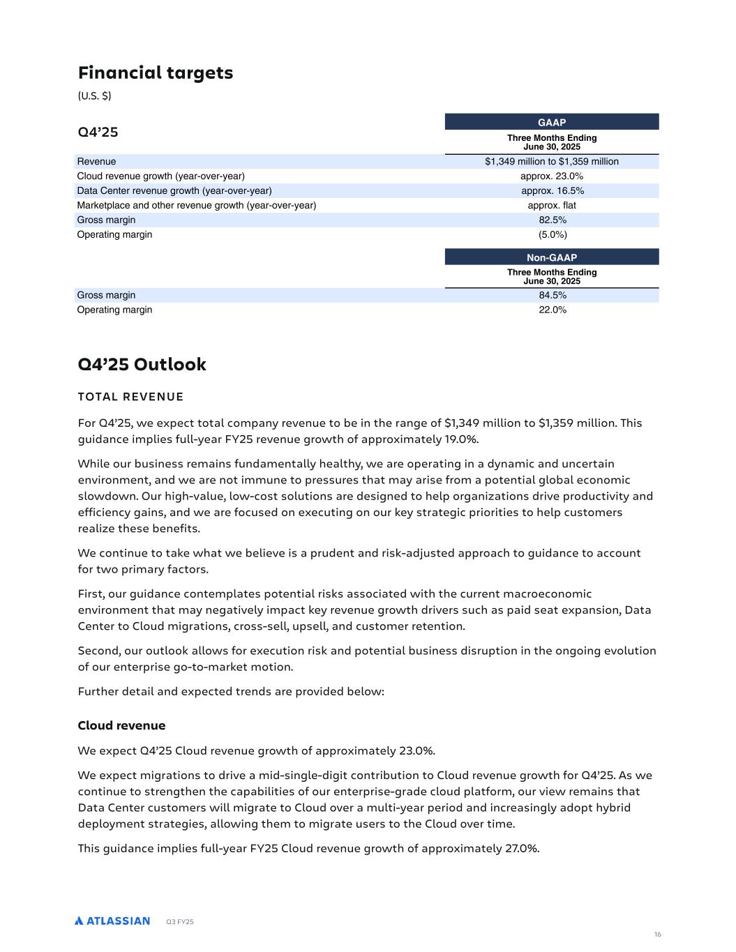 Q3 FY25 Financial targets (U.S. $) Q4’25 Q4’25 Outlook TOTAL REVENUE For Q4’25, we expect total company revenue to be in the range of $1,349 million to $1,359 million. This guidance implies full-year FY25 revenue growth of approximately 19.0%. While our business remains fundamentally healthy, we are operating in a dynamic and uncertain environment, and we are not immune to pressures that may arise from a potential global economic slowdown. Our high-value, low-cost solutions are designed to help organizations drive productivity and efficiency gains, and we are focused on executing on our key strategic priorities to help customers realize these benefits. We continue to take what we believe is a prudent and risk-adjusted approach to guidance to account for two primary factors. First, our guidance contemplates potential risks associated with the current macroeconomic environment that may negatively impact key revenue growth drivers such as paid seat expansion, Data Center to Cloud migrations, cross-sell, upsell, and customer retention. Second, our outlook allows for execution risk and potential business disruption in the ongoing evolution of our enterprise go-to-market motion. Further detail and expected trends are provided below: Cloud revenue We expect Q4’25 Cloud revenue growth of approximately 23.0%. We expect migrations to drive a mid-single-digit contribution to Cloud revenue growth for Q4’25. As we continue to strengthen the capabilities of our enterprise-grade cloud platform, our view remains that Data Center customers will migrate to Cloud over a multi-year period and increasingly adopt hybrid deployment strategies, allowing them to migrate users to the Cloud over time. This guidance implies full-year FY25 Cloud revenue growth of approximately 27.0%. , JI  - 3 P 0E J I % % DSDLRD ($* 0 ML M ($*,0 ML 3 MRC ODSDLRD FOMT G D O%MSDO% D O NNOM )* 4 3DL DO ODSDLRD FOMT G D O%MSDO% D O NNOM (- , 9 O D N D LC M GDO ODSDLRD FOMT G D O%MSDO% D O NNOM E 7OMPP OF L ) , NDO LF OF L , 1E - 3 P 0E J I % % 7OMPP OF L , NDO LF OF L ))  - 3 P . E8 -A A 0GA % % ) DSDLRD FOMT G D O%MSDO% D O ( , M (0 3 MRC ODSDLRD FOMT G D O%MSDO% D O -:: 4 3DL DO ODSDLRD FOMT G D O%MSDO% D O NNOM )( , 9 O D N D LC M GDO ODSDLRD FOMT G D O%MSDO% D O NNOM , 7OMPP OF L ( , M ) NDO LF OF L 1E - 3 . E8 -A A 0GA % % ) 7OMPP OF L M , NDO LF OF L )* , 16