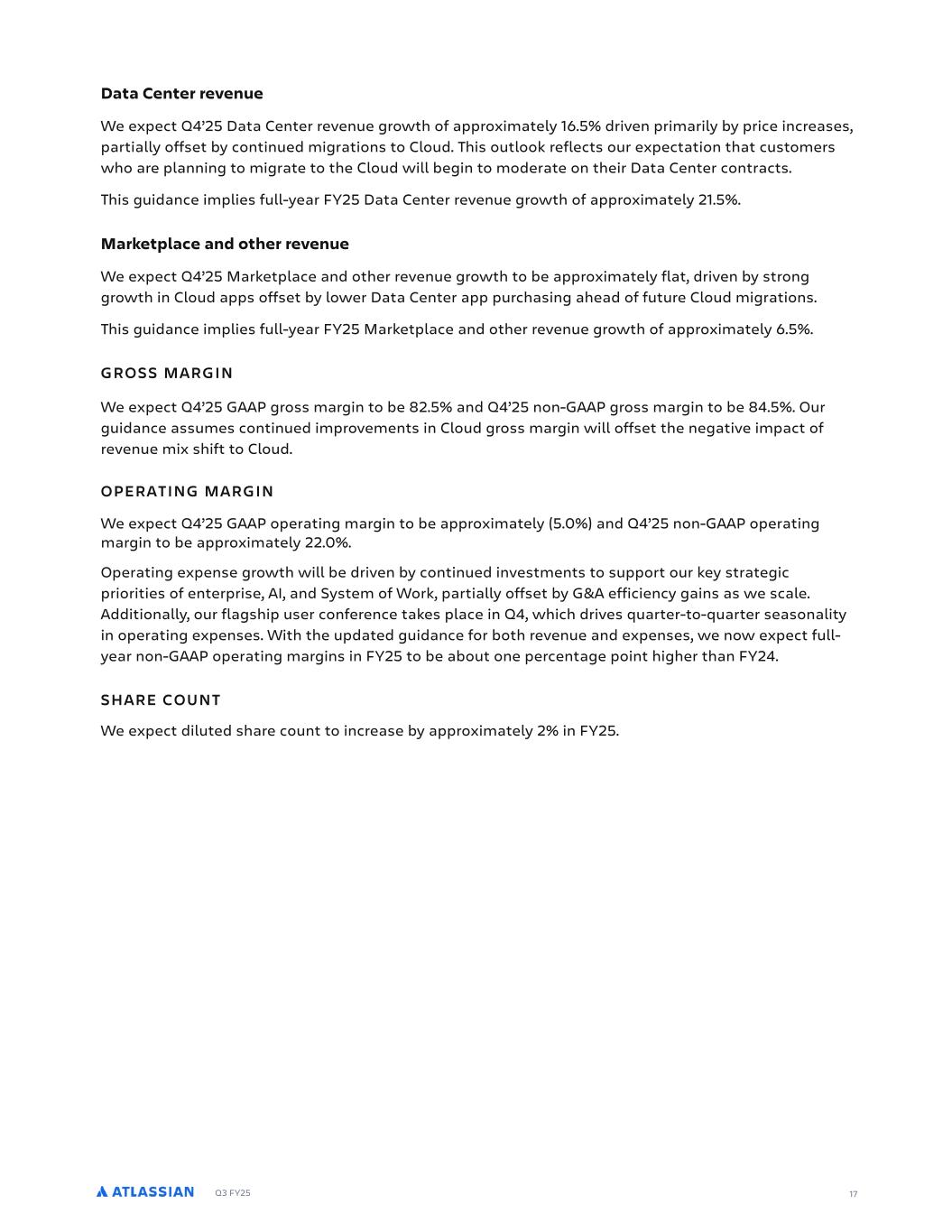 Q3 FY25 17 Data Center revenue We expect Q4’25 Data Center revenue growth of approximately 16.5% driven primarily by price increases, partially offset by continued migrations to Cloud. This outlook reflects our expectation that customers who are planning to migrate to the Cloud will begin to moderate on their Data Center contracts. This guidance implies full-year FY25 Data Center revenue growth of approximately 21.5%. Marketplace and other revenue We expect Q4’25 Marketplace and other revenue growth to be approximately flat, driven by strong growth in Cloud apps offset by lower Data Center app purchasing ahead of future Cloud migrations. This guidance implies full-year FY25 Marketplace and other revenue growth of approximately 6.5%. GROSS MARGIN We expect Q4’25 GAAP gross margin to be 82.5% and Q4’25 non-GAAP gross margin to be 84.5%. Our guidance assumes continued improvements in Cloud gross margin will offset the negative impact of revenue mix shift to Cloud. OPERATING MARGIN We expect Q4’25 GAAP operating margin to be approximately (5.0%) and Q4’25 non-GAAP operating margin to be approximately 22.0%. Operating expense growth will be driven by continued investments to support our key strategic priorities of enterprise, AI, and System of Work, partially offset by G&A efficiency gains as we scale. Additionally, our flagship user conference takes place in Q4, which drives quarter-to-quarter seasonality in operating expenses. With the updated guidance for both revenue and expenses, we now expect full- year non-GAAP operating margins in FY25 to be about one percentage point higher than FY24. SHARE COUNT We expect diluted share count to increase by approximately 2% in FY25.