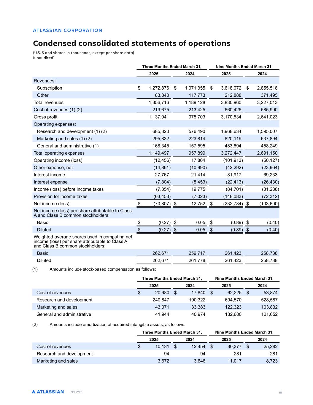 Q3 FY25 18 ATLASSIAN CORPORATION Condensed consolidated statements of operations (U.S. $ and shares in thousands, except per share data) (unaudited) -RJ L MPNMP R ML MLCDL DC ML MJ C RDC R RD DLR ME NDP R ML % % LC G PD L RGMS LC D BDNR NDP G PD C R SL SC RDC  GPDD MLRG 1LCDC PBG ) LD MLRG 1LCDC PBG ) ( ( ( ( ( ( ( ( FWFO FT0 CTDS PO (-( .-, - ) ) , . -( ( . . IFS .) . - --) ( ( ... )- P BM SFWFO FT ) , - , . (. ) .) , ) ((- ) 3PT PG SFWFO FT ( ( ,- ( ) ( ,, (, . 7SPTT SPG )- - - ) ) - ) ( , () FSB O F FOTFT0 FTFBSDI BOE EFWFMP NFO ( ,. )( -, ,. ,) - :BSLF O BOE TBMFT ( ( .)( (() . .( ,)- . 7FOFSBM BOE BEN O T SB WF ,. ) - .) , . ( P BM P FSB O F FOTFT - - . ) (-( - ( , FSB O ODPNF MPTT ( , - . ) (- IFS F FOTF OF ., ( ( ( () , 8O FSFT ODPNF (- -,- ( . - , ()) 8O FSFT F FOTF - . . ) (( ) (, ) 8ODPNF MPTT CFGPSF ODPNF B FT - ) -- . - ) (.. SPW T PO GPS ODPNF B FT ,) ) - () . .) -( ) ( F ODPNF MPTT - . - ( - ( ()( -. ) , F ODPNF MPTT FS TIBSF B S C BCMF P 3MBTT 1 BOE 3MBTT 2 DPNNPO T PDLIPMEFST0 2BT D %(- % %. % 4 M FE %(- % %. % AF I FE$BWFSB F TIBSFT TFE O DPN O OF ODPNF MPTT FS TIBSF B S C BCMF P 3MBTT 1 BOE 3MBTT 2 DPNNPO T PDLIPMEFST0 2BT D (,( ,- ( - - (, () ( . -). 4 M FE (,( ,- (, --. (, () ( . -). 1NP O T ODM EF T PDL$CBTFE DPN FOTB PO BT GPMMP T0 GPDD MLRG 1LCDC PBG ) LD MLRG 1LCDC PBG ) ( ( ( ( ( ( ( ( 3PT PG SFWFO FT ( . - . ,( (( ) .- FTFBSDI BOE EFWFMP NFO ( . - )(( , - (. .- :BSLF O BOE TBMFT ) - )) ).) (( )() ) .)( 7FOFSBM BOE BEN O T SB WF - )( , ( , ( ( 1NP O T ODM EF BNPS B PO PG BDR SFE O BO CMF BTTF T BT GPMMP T0 GPDD MLRG 1LCDC PBG ) LD MLRG 1LCDC PBG ) ( ( ( ( ( ( ( ( 3PT PG SFWFO FT ) ( ) )-- ( (.( FTFBSDI BOE EFWFMP NFO (. (. :BSLF O BOE TBMFT ) ,-( ) , , - . -()