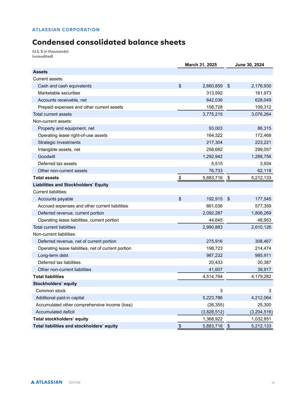 Q3 FY25 19 -RJ L MPNMP R ML MLCDL DC ML MJ C RDC . J LBD GDDR % % L RGMS LC SL SC RDC PBG ) ( ( 4SLD ) ( ( - DR 3 SSFO BTTF T0 3BTI BOE DBTI FR WBMFO T ( ,, . ( -, ) :BSLF BCMF TFD S FT ) ) ( , -) 1DDP O T SFDF WBCMF OF , ( ), ,(. SF B E F FOTFT BOE P IFS D SSFO BTTF T . -(. ) ( P BM D SSFO BTTF T ) -- ( ) -, (, PO$D SSFO BTTF T0 SP FS BOE FR NFO OF ) ) ., ) FSB O MFBTF S I $PG$ TF BTTF T , )(( -( ,. SB F D OWFT NFO T ( - ) (() (( 8O BO CMF BTTF T OF ( . ,.( ( - 7PPE MM ( ( ( (.. - , 4FGFSSFE B BTTF T ) ) IFS OPO$D SSFO BTTF T -, -)) ,( . MR J DR ..) - , ( ( )) 5 A J R D LC RMB GMJCDP 1OS RW 3 SSFO M BC M FT0 1DDP O T B BCMF ( -- 1DDS FE F FOTFT BOE P IFS D SSFO M BC M FT ,, ), -- ) 4FGFSSFE SFWFO F D SSFO PS PO ( ( (.- . , (, FSB O MFBTF M BC M FT D SSFO PS PO , . ) P BM D SSFO M BC M FT ( ..) ( , (, PO$D SSFO M BC M FT0 4FGFSSFE SFWFO F OF PG D SSFO PS PO (- , ) . ,- FSB O MFBTF M BC M FT OF PG D SSFO PS PO . -() ( - 9PO $ FSN EFC .- ()( . 4FGFSSFE B M BC M FT ( )) ( ).- IFS OPO$D SSFO M BC M FT , - ) - MR J J A J R D - - (.( RMB GMJCDP DOS RW 3PNNPO T PDL ) ) 1EE POBM B E$ O DB BM (() -., ( ( , 1DD N MB FE P IFS DPN SFIFOT WF ODPNF MPTT (, ) ( ) 1DD N MB FE EFG D ) .(. ( ) ( , MR J RMB GMJCDP DOS RW ),. (( )( . MR J J A J R D LC RMB GMJCDP DOS RW ..) - , ( ( )) , ATLASSIAN CORPORATION Condensed consolidated balance sheets (U.S. $ in thousands) (unaudited)