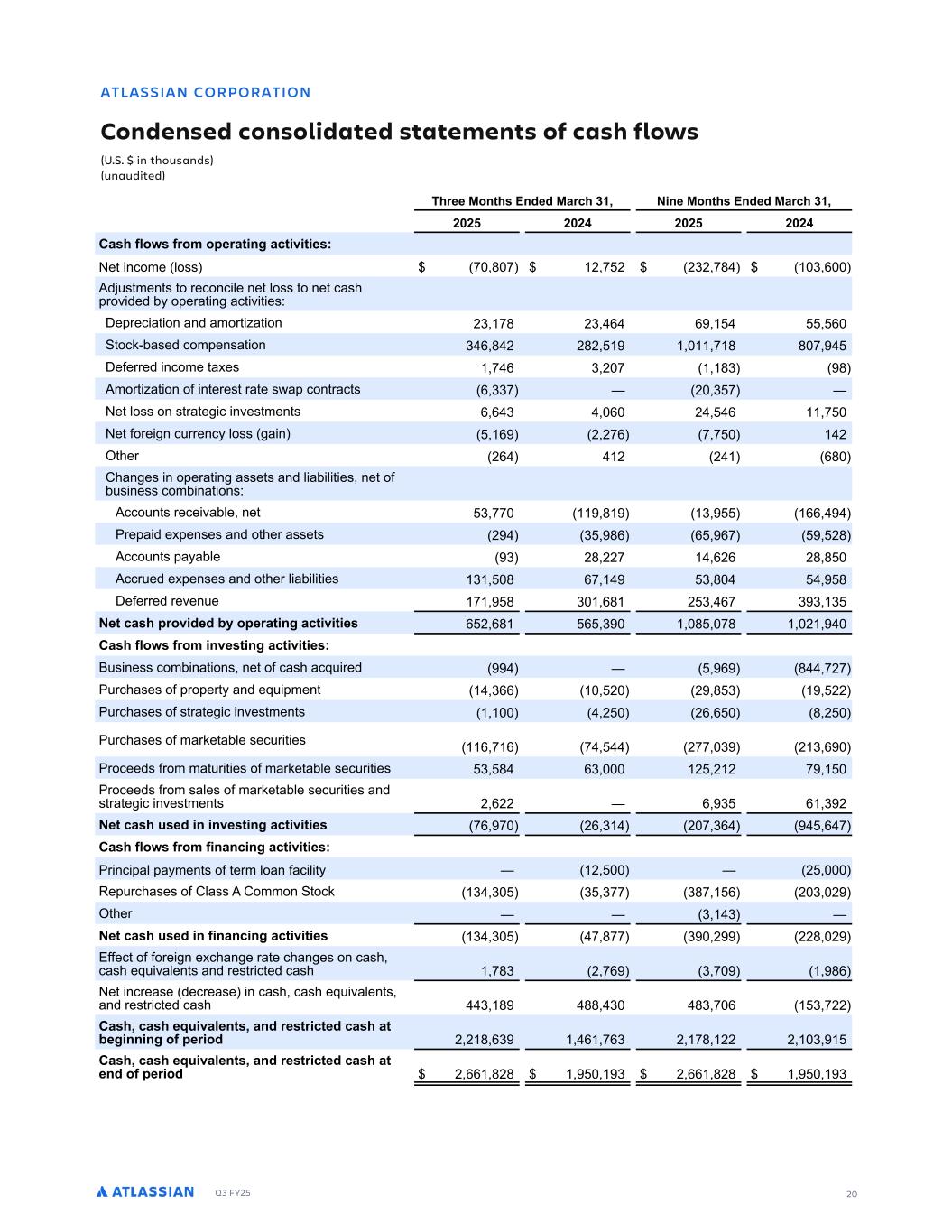 Q3 FY25 20 -RJ L MPNMP R ML MLCDL DC ML MJ C RDC R RD DLR ME G 2JMU % % L RGMS LC SL SC RDC          GPDD MLRG 1LCDC PBG ) LD MLRG 1LCDC PBG ) ( ( ( ( ( ( ( ( G EJMU EPM MNDP R LF BR T R D , F ODPNF MPTT - . - ( - ( ()( -. ) , 1E T NFO T P SFDPOD MF OF MPTT P OF DBTI SPW EFE C P FSB O BD W FT0 4F SFD B PO BOE BNPS B PO () -. () , , , PDL$CBTFE DPN FOTB PO ) , . ( (.( - . . - 4FGFSSFE ODPNF B FT - , ) ( - .) . 1NPS B PO PG O FSFT SB F T B DPO SBD T , ))- ( ) - F MPTT PO T SB F D OWFT NFO T , , ) , ( , - F GPSF O D SSFOD MPTT B O , ( (-, - - ( IFS (, ( ( ,. 3IBO FT O P FSB O BTTF T BOE M BC M FT OF PG C T OFTT DPNC OB POT0 1DDP O T SFDF WBCMF OF ) -- . ) ,, SF B E F FOTFT BOE P IFS BTTF T ( ) ., , ,- (. 1DDP O T B BCMF ) (. ((- ,(, (. . 1DDS FE F FOTFT BOE P IFS M BC M FT ) . ,- ) . . 4FGFSSFE SFWFO F - . ) ,. ( ) ,- ) ) ) DR B G NPMT CDC AW MNDP R LF BR T R D , ( ,. , ) . -. ( G EJMU EPM LTD R LF BR T R D , 2 T OFTT DPNC OB POT OF PG DBTI BDR SFE , . -(- SDIBTFT PG SP FS BOE FR NFO ),, ( ( . ) (( SDIBTFT PG T SB F D OWFT NFO T ( (, , . ( SDIBTFT PG NBSLF BCMF TFD S FT , - , - (-- ) ( ) , SPDFFET GSPN NB S FT PG NBSLF BCMF TFD S FT ) . ,) ( ( ( - SPDFFET GSPN TBMFT PG NBSLF BCMF TFD S FT BOE T SB F D OWFT NFO T ( ,(( , ) , ) ( DR B G S DC L LTD R LF BR T R D -, - (, ) ( - ), , - G EJMU EPM E L LB LF BR T R D , S OD BM B NFO T PG FSN MPBO GBD M ( ( F SDIBTFT PG 3MBTT 1 3PNNPO PDL ) ) ) )-- ).- , ( ) ( IFS ) ) DR B G S DC L E L LB LF BR T R D ) ) - .-- ) ( ((. ( 5GGFD PG GPSF O F DIBO F SB F DIBO FT PO DBTI DBTI FR WBMFO T BOE SFT S D FE DBTI -.) ( -, ) - ., F ODSFBTF EFDSFBTF O DBTI DBTI FR WBMFO T BOE SFT S D FE DBTI ) . .. ) .) - , ) -(( G B G DOS T JDLR LC PD RP BRDC B G R ADF LL LF ME NDP MC ( ( . ,) , -,) ( -. (( ( ) G B G DOS T JDLR LC PD RP BRDC B G R DLC ME NDP MC ( ,, .(. ) ( ,, .(. ) - ATLASSIAN CORPORATION Condensed consolidated statements of cash flows (U.S. $ in thousands) (unaudited)