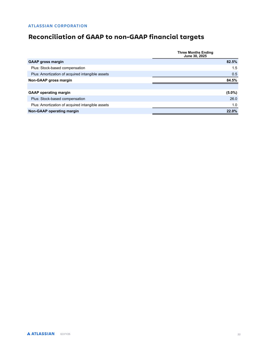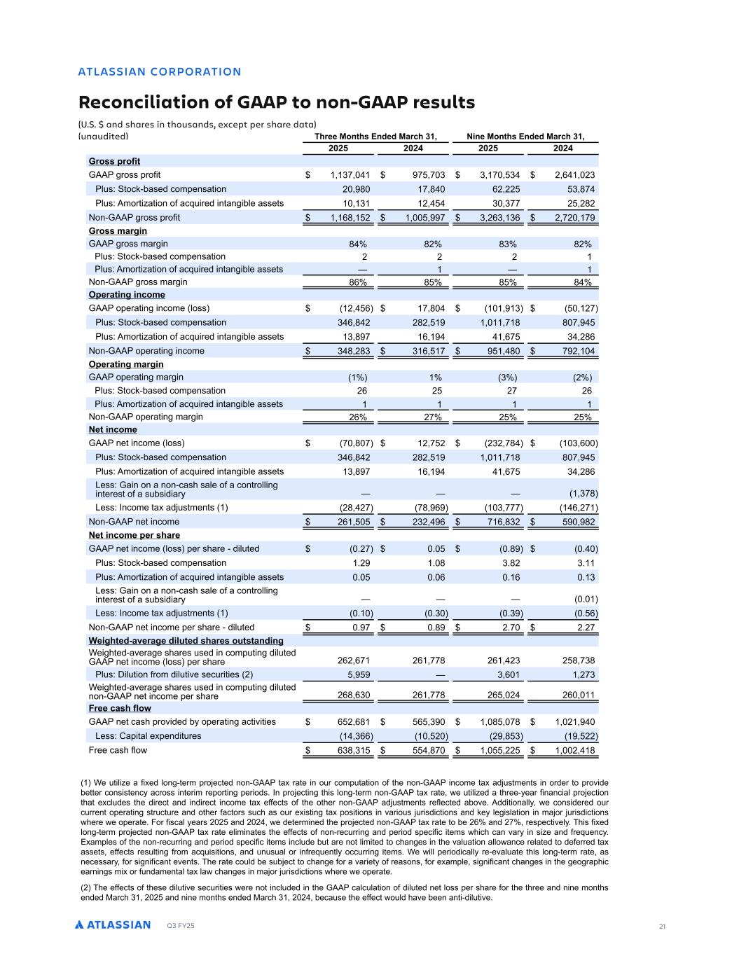 Q3 FY25 21 -RJ L MPNMP R ML :DBMLB J R ML ME 3-- RM ML$3-- :D SJR % % LC G PD L RGMS LC D BDNR NDPBDLR FD LC NDP G PD C R SL SC RDC GPDD MLRG 1LCDC PBG ) LD MLRG 1LCDC PBG ) ( ( ( ( ( ( ( ( 3PM NPME R 711 SPTT SPG )- - - ) ) - ) ( , () M T0 PDL$CBTFE DPN FOTB PO ( . - . ,( (( ) .- M T0 1NPS B PO PG BDR SFE O BO CMF BTTF T ) ( ) )-- ( (.( PO$711 SPTT SPG ,. ( - ) (,) ), ( -( - 3PM PF L 711 SPTT NBS O . .( .) .( M T0 PDL$CBTFE DPN FOTB PO ( ( ( M T0 1NPS B PO PG BDR SFE O BO CMF BTTF T PO$711 SPTT NBS O ., . . . NDP R LF LBM D 711 P FSB O ODPNF MPTT ( , - . ) (- M T0 PDL$CBTFE DPN FOTB PO ) , . ( (.( - . . - M T0 1NPS B PO PG BDR SFE O BO CMF BTTF T ) . - , ,- ) (., PO$711 P FSB O ODPNF ) . (.) ) , - . - ( NDP R LF PF L 711 P FSB O NBS O ) ( M T0 PDL$CBTFE DPN FOTB PO (, ( (- (, M T0 1NPS B PO PG BDR SFE O BO CMF BTTF T PO$711 P FSB O NBS O (, (- ( ( DR LBM D 711 OF ODPNF MPTT - . - ( - ( ()( -. ) , M T0 PDL$CBTFE DPN FOTB PO ) , . ( (.( - . . - M T0 1NPS B PO PG BDR SFE O BO CMF BTTF T ) . - , ,- ) (., 9FTT0 7B O PO B OPO$DBTI TBMF PG B DPO SPMM O O FSFT PG B T CT E BS )-. 9FTT0 8ODPNF B BE T NFO T (. (- -. , ) --- , (- PO$711 OF ODPNF (, ()( , - , .)( .( DR LBM D NDP G PD 711 OF ODPNF MPTT FS TIBSF $ E M FE %(- % %. % M T0 PDL$CBTFE DPN FOTB PO %( % . )%.( )% M T0 1NPS B PO PG BDR SFE O BO CMF BTTF T % % , % , % ) 9FTT0 7B O PO B OPO$DBTI TBMF PG B DPO SPMM O O FSFT PG B T CT E BS % 9FTT0 8ODPNF B BE T NFO T % %) %) % , PO$711 OF ODPNF FS TIBSF $ E M FE % - %. (%- (%(- D FGRDC$ TDP FD C JSRDC G PD MSR R LC LF AF I FE$BWFSB F TIBSFT TFE O DPN O E M FE 711 OF ODPNF MPTT FS TIBSF (,( ,- (, --. (, () ( . -). M T0 4 M PO GSPN E M WF TFD S FT ( ) , (-) AF I FE$BWFSB F TIBSFT TFE O DPN O E M FE OPO$711 OF ODPNF FS TIBSF (,. ,) (, --. (, ( (, 2PDD B G EJMU 711 OF DBTI SPW EFE C P FSB O BD W FT , ( ,. , ) . -. ( 9FTT0 3B BM F FOE SFT ),, ( ( . ) (( 6SFF DBTI GMP ,). ) .- (( ( . AF M F B G FE MPO $ FSN SP FD FE OPO$711 B SB F O P S DPN B PO PG IF OPO$711 ODPNF B BE T NFO T O PSEFS P SPW EF CF FS DPOT T FOD BDSPTT O FS N SF PS O FS PET% 8O SP FD O I T MPO $ FSN OPO$711 B SB F F M FE B ISFF$ FBS G OBOD BM SP FD PO IB F DM EFT IF E SFD BOE OE SFD ODPNF B FGGFD T PG IF P IFS OPO$711 BE T NFO T SFGMFD FE BCPWF% 1EE POBMM F DPOT EFSFE P S D SSFO P FSB O T S D SF BOE P IFS GBD PST T DI BT P S F T O B PT POT O WBS P T S TE D POT BOE LF MF TMB PO O NB PS S TE D POT IFSF F P FSB F% 6PS G TDBM FBST ( ( BOE ( ( F EF FSN OFE IF SP FD FE OPO$711 B SB F P CF (, BOE (- SFT FD WFM % I T G FE MPO $ FSN SP FD FE OPO$711 B SB F FM N OB FT IF FGGFD T PG OPO$SFD SS O BOE FS PE T FD G D FNT I DI DBO WBS O T F BOE GSFR FOD % 5 BN MFT PG IF OPO$SFD SS O BOE FS PE T FD G D FNT ODM EF C BSF OP M N FE P DIBO FT O IF WBM B PO BMMP BODF SFMB FE P EFGFSSFE B BTTF T FGGFD T SFT M O GSPN BDR T POT BOE O T BM PS OGSFR FO M PDD SS O FNT% AF MM FS PE DBMM SF$FWBM B F I T MPO $ FSN SB F BT OFDFTTBS GPS T O G DBO FWFO T% IF SB F DP ME CF T C FD P DIBO F GPS B WBS F PG SFBTPOT GPS F BN MF T O G DBO DIBO FT O IF FP SB I D FBSO O T N PS G OEBNFO BM B MB DIBO FT O NB PS S TE D POT IFSF F P FSB F% ( IF FGGFD T PG IFTF E M WF TFD S FT FSF OP ODM EFE O IF 711 DBMD MB PO PG E M FE OF MPTT FS TIBSF GPS IF ISFF BOE O OF NPO IT FOEFE :BSDI ) ( ( BOE O OF NPO IT FOEFE :BSDI ) ( ( CFDB TF IF FGGFD P ME IBWF CFFO BO $E M WF% ATLASSIAN CORPORATION Reconciliation of GAAP to non-GAAP results (U.S. $ and shares in thousands, except per share data) (unaudited) -RJ L MPNMP R ML :DBMLB J R ML ME 3-- RM ML$3-- :D SJR % % LC G PD L RGMS LC D BDNR NDPBDLR FD LC NDP G PD C R SL SC RDC GPDD MLRG 1LCDC PBG ) LD MLRG 1LCDC PBG ) ( ( ( ( ( ( ( ( 3PM NPME R 711 SPTT SPG )- - - ) ) - ) ( , () M T0 PDL$CBTFE DPN FOTB PO ( . - . ,( (( ) .- M T0 1NPS B PO PG BDR SFE O BO CMF BTTF T ) ( ) )-- ( (.( PO$711 SPTT SPG ,. ( - ) (,) ), ( -( - 3PM PF L 71 SPTT NBS O . .( .) .( M T0 PDL$CBTFE DPN FOTB ( ( ( M T0 1NPS B PO PG BDR SFE M PO$71 SPT NBS O ., . . . NDP R LF LBM D 71 P FSB O ODPNF MPTT ( , - . ) (- M T0 PDL$CBTFE DPN FOTB ) , . ( (.( - . . - M T0 1NPS B PO PG BDR SFE M ) . - , ,- ) (., PO$71 P FSB O ODP F ) . (.) ) , - . - ( NDP R LF PF L 711 P FSB O NBS O ) ( M T0 PDL$CBTFE DPN FOTB PO (, ( (- (, M T0 1NPS B PO PG BDR SFE O BO CMF BTTF T PO$711 P FSB O NBS O (, (- ( ( DR LBM D 711 OF ODPNF MPTT - . - ( - ( ()( -. ) , M T0 PDL$CBTFE DPN FOTB PO ) , . ( (.( - . . - M T0 1NPS B PO PG BDR SFE O BO CMF BTTF T ) . - , ,- ) (., 9FTT0 7B O PO B OPO$DBTI TBMF PG B DPO SPMM O O FSFT PG B T CT E BS )-. 9FTT0 8ODPNF B BE T NFO T (. (- -. , ) --- , (- PO$711 OF ODPNF (, ()( , - , .)( .( DR LBM D NDP G PD 711 OF ODPNF MPTT FS TIBSF $ E M FE %(- % %. % M T0 PDL$CBTFE DPN FOTB PO %( % . )%.( )% M T0 1NPS B PO PG BDR SFE O BO CMF BTTF T % % , % , % ) 9FTT0 7B O PO B OPO$DBTI TBMF PG B DPO SPMM O O FSFT PG B T CT E BS % 9FTT0 8ODPNF B BE T NFO T % %) %) % , PO$711 OF ODPNF FS TIBSF $ E M FE % - %. (%- (%(- D FGRDC$ TDP FD C JSRDC G PD MSR R LC LF AF I FE$BWFSB TIBSFT TFE O DPN O E M FE 711 OF ODPNF MPTT FS TIBSF (,( ,- (, --. (, () ( . -). M T0 4 M PO GSPN E M WF T D S FT ( ) , (-) AF I FE$BWFSB F TIBSFT TFE O DPN O E M FE OPO$711 OF ODPNF FS TIBSF (,. ,) (, --. (, ( (, 2PDD B G EJMU 711 OF DBTI SPW EFE C P FSB O BD W FT , ( ,. , ) . -. ( 9 TT0 3B BM F FOE SFT ),, ( ( . ) (( 6SFF DBTI GMP ,). ) .- (( ( . AF M F B G FE MPO $ FSN SP FD FE OPO$711 B SB F O P S DPN B PO PG IF OPO$711 ODPNF B BE T NFO T O PSEFS P SPW EF CF FS DPOT T FOD BDSPTT O FS N SF PS O FS PET% 8O SP FD O I T MPO $ FSN OPO$711 B SB F F M FE B ISFF$ FBS G OBOD BM SP FD PO IB F DM EFT IF E SFD BOE OE SFD ODPNF B FGGFD T PG IF P IFS OPO$711 BE T NFO T SFGMFD FE BCPWF% 1EE POBMM F DPOT EFSFE P S D SSFO P FSB O T S D SF BOE P IFS GBD PST T DI BT P S F T O B PT POT O WBS P T S TE D POT BOE LF MF TMB PO O NB PS S TE D POT IFSF F P FSB F% 6PS G TDBM FBST ( ( BOE ( ( F EF FSN OFE IF SP FD FE OPO$711 B SB F P CF (, BOE (- SFT FD WFM % I T G FE MPO $ FSN SP FD FE OPO$711 B SB F FM N OB FT IF FGGFD T PG OPO$SFD SS O BOE FS PE T 