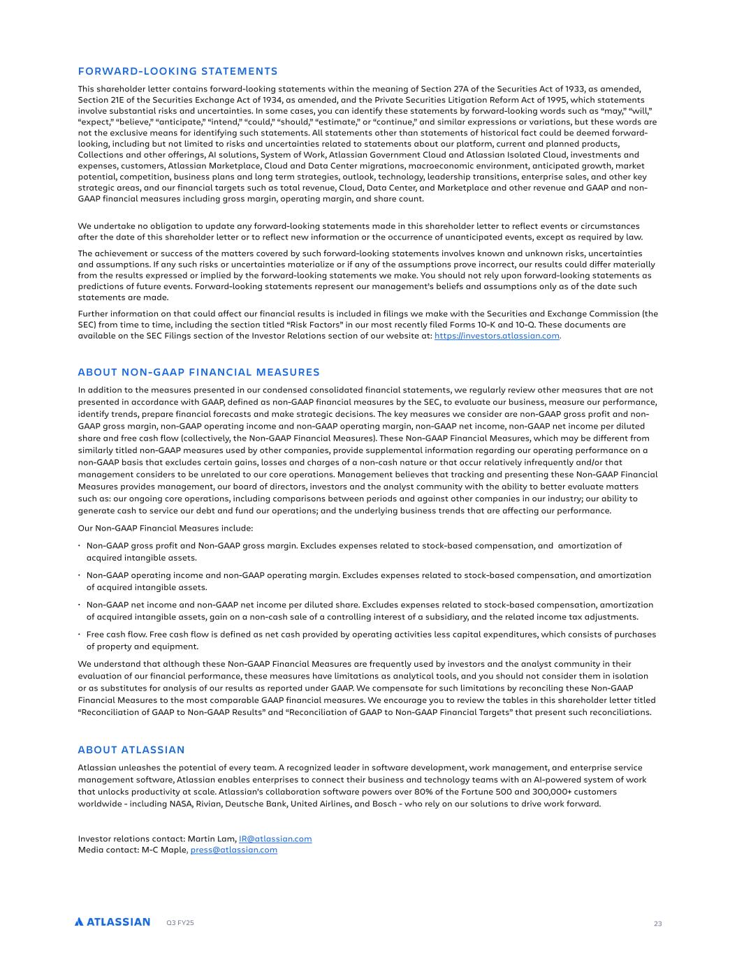 Q3 FY25 23 FORWARD-LOOKING STATEMENTS This shareholder letter contains forward-looking statements within the meaning of Section 27A of the Securities Act of 1933, as amended, Section 21E of the Securities Exchange Act of 1934, as amended, and the Private Securities Litigation Reform Act of 1995, which statements involve substantial risks and uncertainties. In some cases, you can identify these statements by forward-looking words such as “may,” “will,” “expect,” “believe,” “anticipate,” “intend,” “could,” “should,” “estimate,” or “continue,” and similar expressions or variations, but these words are not the exclusive means for identifying such statements. All statements other than statements of historical fact could be deemed forward- looking, including but not limited to risks and uncertainties related to statements about our platform, current and planned products, Collections and other offerings, AI solutions, System of Work, Atlassian Government Cloud and Atlassian Isolated Cloud, investments and expenses, customers, Atlassian Marketplace, Cloud and Data Center migrations, macroeconomic environment, anticipated growth, market potential, competition, business plans and long term strategies, outlook, technology, leadership transitions, enterprise sales, and other key strategic areas, and our financial targets such as total revenue, Cloud, Data Center, and Marketplace and other revenue and GAAP and non- GAAP financial measures including gross margin, operating margin, and share count. We undertake no obligation to update any forward-looking statements made in this shareholder letter to reflect events or circumstances after the date of this shareholder letter or to reflect new information or the occurrence of unanticipated events, except as required by law. The achievement or success of the matters covered by such forward-looking statements involves known and unknown risks, uncertainties and assumptions. If any such risks or uncertainties materialize or if any of the assumptions prove incorrect, our results could differ materially from the results expressed or implied by the forward-looking statements we make. You should not rely upon forward-looking statements as predictions of future events. Forward-looking statements represent our management’s beliefs and assumptions only as of the date such statements are made. Further information on that could affect our financial results is included in filings we make with the Securities and Exchange Commission (the SEC) from time to time, including the section titled “Risk Factors” in our most recently filed Forms 10-K and 10-Q. These documents are available on the SEC Filings section of the Investor Relations section of our website at: https://investors.atlassian.com. ABOUT NON-GAAP FINANCIAL MEASURES In addition to the measures presented in our condensed consolidated financial statements, we regularly review other measures that are not presented in accordance with GAAP, defined as non-GAAP financial measures by the SEC, to evaluate our business, measure our performance, identify trends, prepare financial forecasts and make strategic decisions. The key measures we consider are non-GAAP gross profit and non- GAAP gross margin, non-GAAP operating income and non-GAAP operating margin, non-GAAP net income, non-GAAP net income per diluted share and free cash flow (collectively, the Non-GAAP Financial Measures). These Non-GAAP Financial Measures, which may be different from similarly titled non-GAAP measures used by other companies, provide supplemental information regarding our operating performance on a non-GAAP basis that excludes certain gains, losses and charges of a non-cash nature or that occur relatively infrequently and/or that management considers to be unrelated to our core operations. Management believes that tracking and presenting these Non-GAAP Financial Measures provides management, our board of directors, investors and the analyst community with the ability to better evaluate matters such as: our ongoing core operations, including comparisons between periods and against other companies in our industry; our ability to generate cash to service our debt and fund our operations; and the underlying business trends that are affecting our performance. Our Non-GAAP Financial Measures include: • Non-GAAP gross profit and Non-GAAP gross margin. Excludes expenses related to stock-based compensation, and amortization of acquired intangible assets. • Non-GAAP operating income and non-GAAP operating margin. Excludes expenses related to stock-based compensation, and amortization of acquired intangible assets. • Non-GAAP net income and non-GAAP net income per diluted share. Excludes expenses related to stock-based compensation, amortization of acquired intangible assets, gain on a non-cash sale of a controlling interest of a subsidiary, and the related income tax adjustments. • Free cash flow. Free cash flow is defined as net cash provided by operating activities less capital expenditures, which consists of purchases of property and equipment. We understand that although these Non-GAAP Financial Measures are frequently used by investors and the analyst community in their evaluation of our financial performance, these measures have limitations as analytical tools, and you should not consider them in isolation or as substitutes for analysis of our results as reported under GAAP. We compensate for such limitations by reconciling these Non-GAAP Financial Measures to the most comparable GAAP financial measures. We encourage you to review the tables in this shareholder letter titled “Reconciliation of GAAP to Non-GAAP Results” and “Reconciliation of GAAP to Non-GAAP Financial Targets” that present such reconciliations. ABOUT ATLASSIAN Atlassian unleashes the potential of every team. A recognized leader in software development, work management, and enterprise service management software, Atlassian e