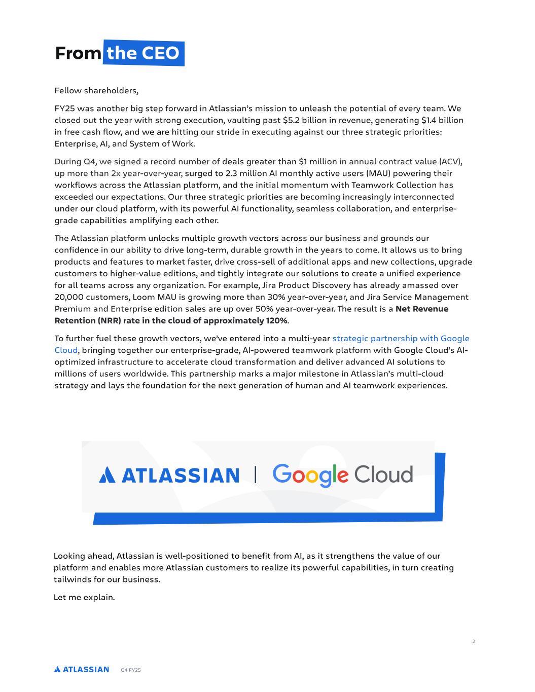 Q4 FY25 2 From the CEO Fellow shareholders, FY25 was another big step forward in Atlassian’s mission to unleash the potential of every team. We closed out the year with strong execution, vaulting past $5.2 billion in revenue, generating $1.4 billion in free cash flow, and we are hitting our stride in executing against our three strategic priorities: Enterprise, AI, and System of Work. During Q4, we signed a record number of deals greater than $1 million in annual contract value (ACV), up more than 2x year-over-year, surged to 2.3 million AI monthly active users (MAU) powering their workflows across the Atlassian platform, and the initial momentum with Teamwork Collection has exceeded our expectations. Our three strategic priorities are becoming increasingly interconnected under our cloud platform, with its powerful AI functionality, seamless collaboration, and enterprise- grade capabilities amplifying each other. The Atlassian platform unlocks multiple growth vectors across our business and grounds our confidence in our ability to drive long-term, durable growth in the years to come. It allows us to bring products and features to market faster, drive cross-sell of additional apps and new collections, upgrade customers to higher-value editions, and tightly integrate our solutions to create a unified experience for all teams across any organization. For example, Jira Product Discovery has already amassed over 20,000 customers, Loom MAU is growing more than 30% year-over-year, and Jira Service Management Premium and Enterprise edition sales are up over 50% year-over-year. The result is a Net Revenue Retention (NRR) rate in the cloud of approximately 120%. To further fuel these growth vectors, we’ve entered into a multi-year strategic partnership with Google Cloud, bringing together our enterprise-grade, AI-powered teamwork platform with Google Cloud’s AI- optimized infrastructure to accelerate cloud transformation and deliver advanced AI solutions to millions of users worldwide. This partnership marks a major milestone in Atlassian’s multi-cloud strategy and lays the foundation for the next generation of human and AI teamwork experiences. Looking ahead, Atlassian is well-positioned to benefit from AI, as it strengthens the value of our platform and enables more Atlassian customers to realize its powerful capabilities, in turn creating tailwinds for our business. Let me explain.