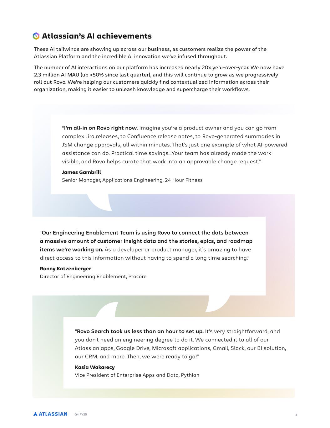 Q4 FY25 4 Atlassian’s AI achievements These AI tailwinds are showing up across our business, as customers realize the power of the Atlassian Platform and the incredible AI innovation we’ve infused throughout. The number of AI interactions on our platform has increased nearly 20x year-over-year. We now have 2.3 million AI MAU (up >50% since last quarter), and this will continue to grow as we progressively roll out Rovo. We’re helping our customers quickly find contextualized information across their organization, making it easier to unleash knowledge and supercharge their workflows. “I’m all-in on Rovo right now. Imagine you’re a product owner and you can go from complex Jira releases, to Confluence release notes, to Rovo-generated summaries in JSM change approvals, all within minutes. That’s just one example of what AI-powered assistance can do. Practical time savings…Your team has already made the work visible, and Rovo helps curate that work into an approvable change request.” James Gambrill Senior Manager, Applications Engineering, 24 Hour Fitness “Our Engineering Enablement Team is using Rovo to connect the dots between a massive amount of customer insight data and the stories, epics, and roadmap items we’re working on. As a developer or product manager, it’s amazing to have direct access to this information without having to spend a long time searching.” Ronny Katzenberger Director of Engineering Enablement, Procore “Rovo Search took us less than an hour to set up. It’s very straightforward, and you don't need an engineering degree to do it. We connected it to all of our Atlassian apps, Google Drive, Microsoft applications, Gmail, Slack, our BI solution, our CRM, and more. Then, we were ready to go!” Kasia Wakarecy Vice President of Enterprise Apps and Data, Pythian