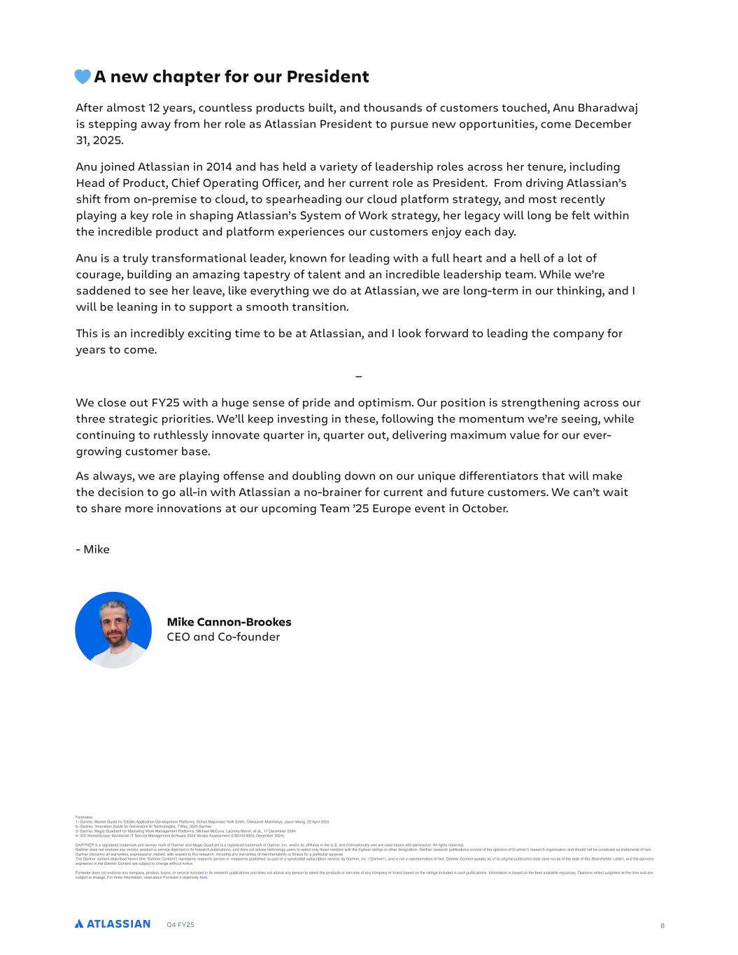 Q4 FY25 A new chapter for our President After almost 12 years, countless products built, and thousands of customers touched, Anu Bharadwaj is stepping away from her role as Atlassian President to pursue new opportunities, come December 31, 2025. Anu joined Atlassian in 2014 and has held a variety of leadership roles across her tenure, including Head of Product, Chief Operating Officer, and her current role as President. From driving Atlassian’s shift from on-premise to cloud, to spearheading our cloud platform strategy, and most recently playing a key role in shaping Atlassian’s System of Work strategy, her legacy will long be felt within the incredible product and platform experiences our customers enjoy each day. Anu is a truly transformational leader, known for leading with a full heart and a hell of a lot of courage, building an amazing tapestry of talent and an incredible leadership team. While we’re saddened to see her leave, like everything we do at Atlassian, we are long-term in our thinking, and I will be leaning in to support a smooth transition. This is an incredibly exciting time to be at Atlassian, and I look forward to leading the company for years to come. — We close out FY25 with a huge sense of pride and optimism. Our position is strengthening across our three strategic priorities. We’ll keep investing in these, following the momentum we’re seeing, while continuing to ruthlessly innovate quarter in, quarter out, delivering maximum value for our ever- growing customer base. As always, we are playing offense and doubling down on our unique differentiators that will make the decision to go all-in with Atlassian a no-brainer for current and future customers. We can’t wait to share more innovations at our upcoming Team ’25 Europe event in October. - Mike 8 Mike Cannon-Brookes CEO and Co-founder Footnotes: 1- Gartner, Market Guide for Citizen Application Development Platforms, Sohail Majumdar, Kelli Smith, Oleksandr Matvitskyy, Jason Wong, 22 April 2025 2- Gartner, Innovation Guide for Generative AI Technologies, 7 May, 2025 Gartner 3- Gartner, Magic Quadrant for Marketing Work Management Platforms, Michael McCune, Lacretia Marsh, et al., 17 December 2024 4- IDC MarketScape: Worldwide IT Service Management Software 2024 Vendor Assessment (US51813224, December 2024) GARTNER is a registered trademark and service mark of Gartner and Magic Quadrant is a registered trademark of Gartner, Inc. and/or its affiliates in the U.S. and internationally and are used herein with permission. All rights reserved. Gartner does not endorse any vendor, product or service depicted in its research publications, and does not advise technology users to select only those vendors with the highest ratings or other designation. Gartner research publications consist of the opinions of G›artner’s research organization and should not be construed as statements of fact. Gartner disclaims all warranties, expressed or implied, with respect to this research, including any warranties of merchantability or fitness for a particular purpose. The Gartner content described herein (the “Gartner Content”) represents research opinion or viewpoints published, as part of a syndicated subscription service, by Gartner, Inc. ("Gartner"), and is not a representation of fact. Gartner Content speaks as of its original publication date (and not as of the date of this Shareholder Letter), and the opinions expressed in the Gartner Content are subject to change without notice. Forrester does not endorse any company, product, brand, or service included in its research publications and does not advise any person to select the products or services of any company or brand based on the ratings included in such publications. Information is based on the best available resources. Opinions reflect judgment at the time and are subject to change. For more information, read about Forrester’s objectivity here.