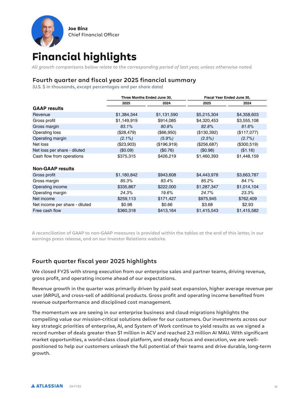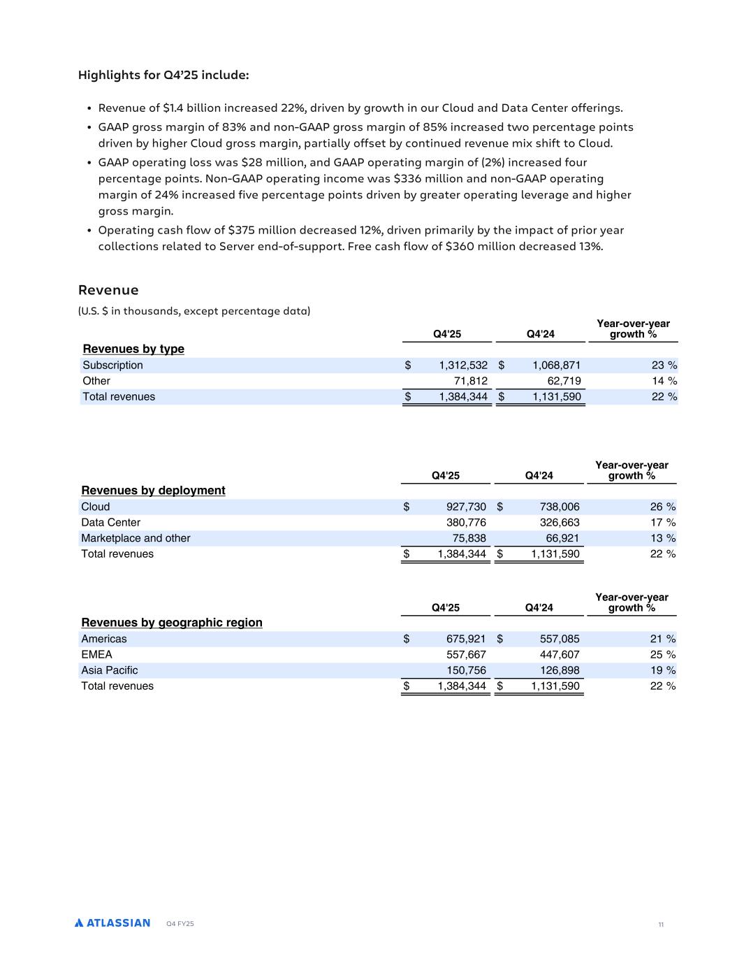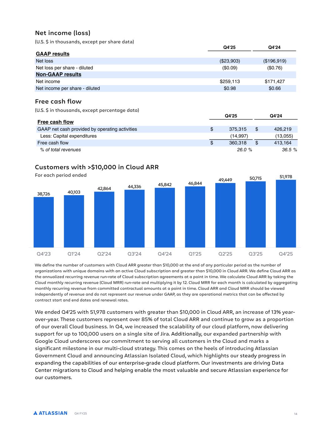 Q4 FY25 Net income (loss) (U.S. $ in thousands, except per share data) Free cash flow (U.S. $ in thousands, except percentage data) Customers with >$10,000 in Cloud ARR For each period ended We ended Q4’25 with 51,978 customers with greater than $10,000 in Cloud ARR, an increase of 13% year- over-year. These customers represent over 85% of total Cloud ARR and continue to grow as a proportion of our overall Cloud business. In Q4, we increased the scalability of our cloud platform, now delivering support for up to 100,000 users on a single site of Jira. Additionally, our expanded partnership with Google Cloud underscores our commitment to serving all customers in the Cloud and marks a significant milestone in our multi-cloud strategy. This comes on the heels of introducing Atlassian Government Cloud and announcing Atlassian Isolated Cloud, which highlights our steady progress in expanding the capabilities of our enterprise-grade cloud platform. Our investments are driving Data Center migrations to Cloud and helping enable the most valuable and secure Atlassian experience for our customers. 7V Y P IY MY VN NQ IS ( - >M :U VTM U T a M P % QdOQ Q TM Q PM M A, - A, , 22 YM S BQ +,%2), 2/%2 2 BQ Q TM Q PU a QP )')2 )'0/ >VU% 22 YM S BQ U O YQ +.2% , 0 %-+0 BQ U O YQ Q TM Q PU a QP )'21 )'// 7V Y P IY MY VN NQ IS ( - 7YMM 4I P 7SV U T a M P % QdOQ Q OQ MSQ A, - A, , 7YMM I P NSV 66D Q OM T bUPQP Ne Q M U S MO UbU UQ ,0.%, . -+/%+ 2 @Q 3 8M U M Qd Q PU a Q -%220 ,%).. ; QQ OM T R c ,/)%, 1 - ,% /- F F6 AG (,% ),%   7V Y P IY MY VN NQ IS ( - >M :U VTM U T a M P % QdOQ Q TM Q P M A, - A, , 22 YM S BQ +,%2), 2/%2 2 BQ Q TM Q PU a QP )')2 )'0/ >VU% 22 Y S BQ U O YQ +.2% , 0 %-+0 BQ U O YQ Q TM Q PU a QP )'21 )'// 7V Y P IY MY VN NQ IS ( - 7YMM 4I P 7SV U T a M P % QdOQ Q OQ SQ A, - A, , 7YMM I P NSV 66D Q OM T bUPQP Ne Q M U S MO UbU UQ ,0.%, . -+/%+ 2 @Q 3 8M U M Qd Q PU a Q -%220 ,%).. ; Q OM T R c ,/)%, 1 - ,% /- F F6 AG (,% ),%   14 We define the number of customers with Cloud ARR greater than $10,000 at the end of any particular period as the number of organizations with unique domains with an active Cloud subscription and greater than $10,000 in Cloud ARR. We define Cloud ARR as the annualized recurring revenue run-rate of Cloud subscription agreements at a point in time. We calculate Cloud ARR by taking the Cloud monthly recurring revenue (Cloud MRR) run-rate and multiplying it by 12. Cloud MRR for each month is calculated by aggregating monthly recurring revenue from committed contractual amounts at a point in time. Cloud ARR and Cloud MRR should be viewed independently of revenue and do not represent our revenue under GAAP, as they are operational metrics that can be affected by contract start and end dates and renewal rates.