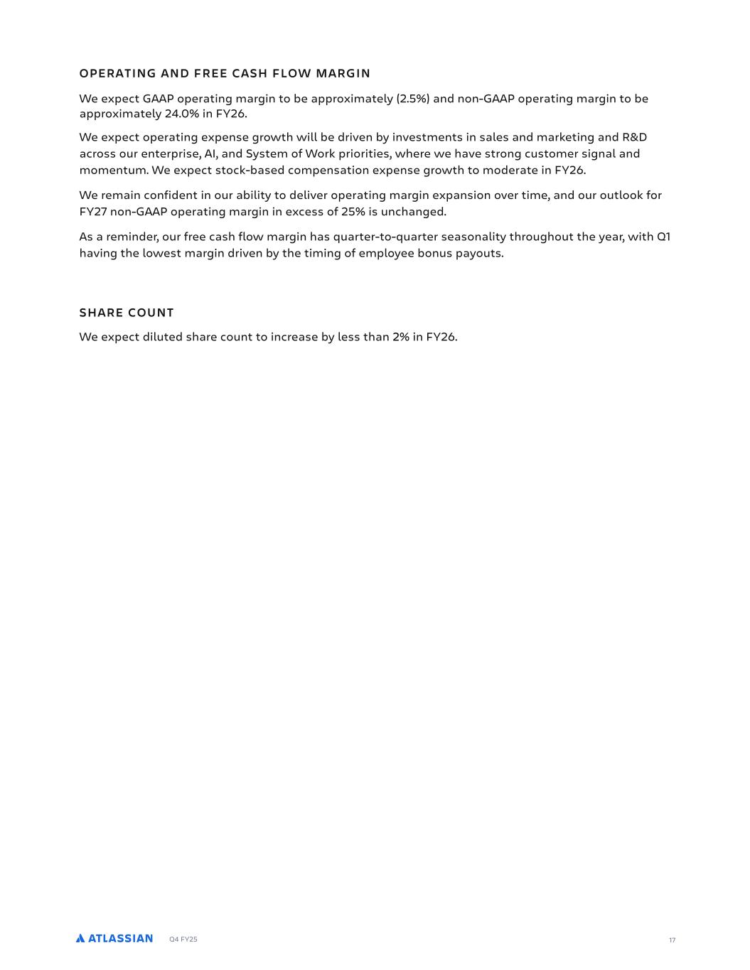 Q4 FY25 Further detail and expected trends are provided below: Cloud revenue We expect Cloud revenue growth of approximately 21.0% in FY26, with migrations driving a mid-single- digit contribution. As we continue to build on the enterprise-grade capabilities of our Cloud platform, we expect Data Center customers to migrate to Cloud over a multi-year period and adopt hybrid deployment strategies, allowing them to migrate teams over time. Overall, we expect Cloud revenue growth to be primarily driven by paid seat expansion in existing customers as we drive increasing wall-to-wall adoption within enterprise customers. Additionally, we expect a greater proportion of our Cloud revenue growth to come from increased focus on cross-selling solutions like Jira Service Management and the introduction of additional collections. Lastly, we expect to drive greater ARPU through uptake of higher-value editions of our products as customers look to take advantage of the advanced capabilities of the Atlassian Cloud Platform. Data Center revenue We expect Data Center revenue growth of approximately 12.5% in FY26 driven primarily by price increases, partially offset by continued migrations to Cloud. This outlook reflects the impact of the policy change to one year deal terms and our expectation that Data Center customers planning to migrate to the Cloud will moderate their seat expansion prior to migration. In terms of seasonality, we expect growth rates to improve in the second half of the year as we fully lap the headwinds related to Server end-of-support driven purchasing. And as a reminder, Data Center revenue growth rates will vary quarter to quarter based on the pace of Cloud migrations, the number of large deals in the quarter, and customer purchasing dynamics related to price changes. Marketplace and other revenue We expect Marketplace and other revenue growth of approximately 10.0% in FY26 driven by healthy sales of third-party marketplace apps for our Cloud and Data Center offerings. GROSS MARGIN We expect GAAP gross margin to be 83.5% and non-GAAP gross margin to be 85.5% in FY26. Our guidance assumes continued optimization of cloud infrastructure and support costs will offset the negative impact of continued revenue mix shift to Cloud and increased AI processing costs as customers deploy and use Rovo across their workflows. 16