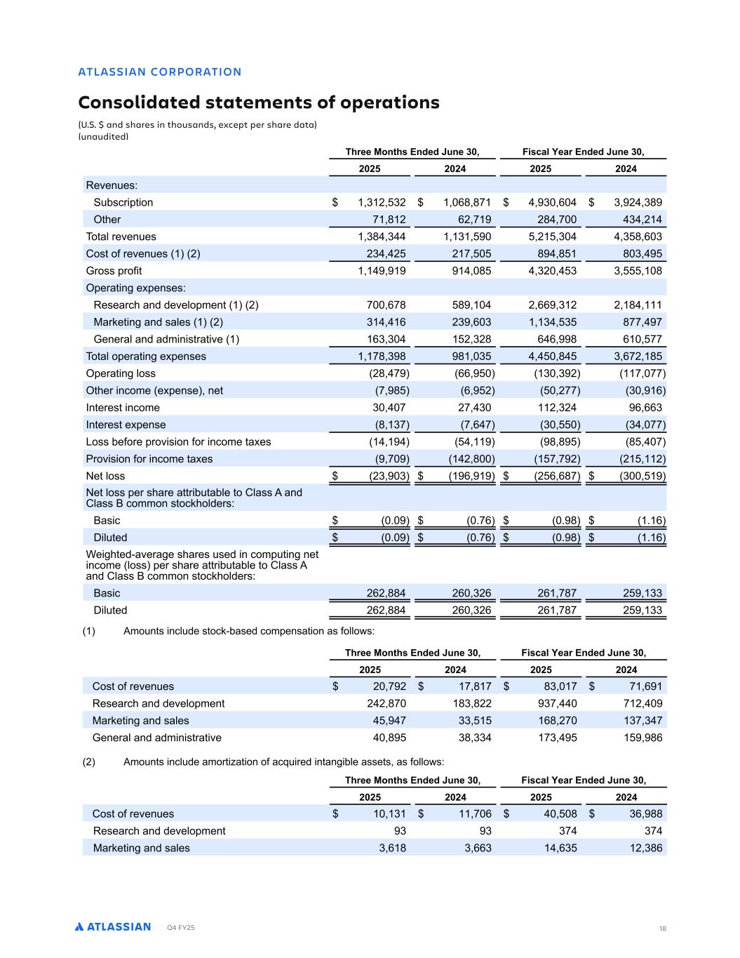 Q4 FY25 18 ATLASSIAN CORPORATION Consolidated statements of operations (U.S. $ and shares in thousands, except per share data) (unaudited) .S ARR AM 0N ON AS NM 0NMRN DASED SASELEMSR NF OE AS NMR % % AMD R A ER M S NTRAMDR EWCEOS OE R A E DASA TMATD SED  EE NMS R 2MDED 5TME ( 3 RCA EA 2MDED 5TME ( ) ) G GPWG 0 WD ET R P ) ( )( ,. .- ) , ) ( ). JGT - . ( ,( - (. - ) ( A CN TG GPWG ). ) ) ( ) ) . , ) 3 TG GPWG ( () ( ( - . . . ) 7T RT . )( ) ) . RGTC PI G RGP G 0 G GCTEJ CPF FG GN ROGP ( - ,-. . ( ,, ) ( ( . CTMG PI CPF CNG ( ) , () , ) ) ) .-- - 7GPGTCN CPF CFO P TC G ,) ) ( )(. , , . , -- A CN RGTC PI G RGP G -. ) . . ) . ) ,-( . RGTC PI N (. - ,, ) ) ( - -- JGT PE OG G RGP G PG - . , ( (-- ) , 8P GTG PE OG ) - (- ) ( )( , ,,) 8P GTG G RGP G . )- - , - ) ) -- : DG TG RT P T PE OG C G . . . - T P T PE OG C G - ( . - - ( ( ( G N () ) , ( , ,.- ) G N RGT JCTG C T DW CDNG 3NC 1 CPF 3NC 2 E OO P EMJ NFGT 0 2C E % %-, % . % , 4 NW GF % %-, % . % , BG IJ GF$C GTCIG JCTG W GF P E ORW PI PG PE OG N RGT JCTG C T DW CDNG 3NC 1 CPF 3NC 2 E OO P EMJ NFGT 0 2C E (,( .. (, )(, (, -.- ( )) 4 NW GF (,( .. (, )(, (, -.- ( )) 1O WP PENWFG EM$DC GF E ORGP C P C NN 0 EE NMS R 2MDED 5TME ( 3 RCA EA 2MDED 5TME ( ) ) 3 TG GPWG ( - ( - . - .) - - , G GCTEJ CPF FG GN ROGP ( ( .- .) .(( )- - ( CTMG PI CPF CNG - )) ,. (- )- ) - 7GPGTCN CPF CFO P TC G . ). )) -) ., ( 1O WP PENWFG CO T C P CESW TGF P CPI DNG C G C NN 0 EE NMS R 2MDED 5TME ( 3 RCA EA 2MDED 5TME ( ) ) 3 TG GPWG ) - , . ), .. G GCTEJ CPF FG GN ROGP ) ) )- )- CTMG PI CPF CNG ) , . ) ,,) ,) ( )., ,