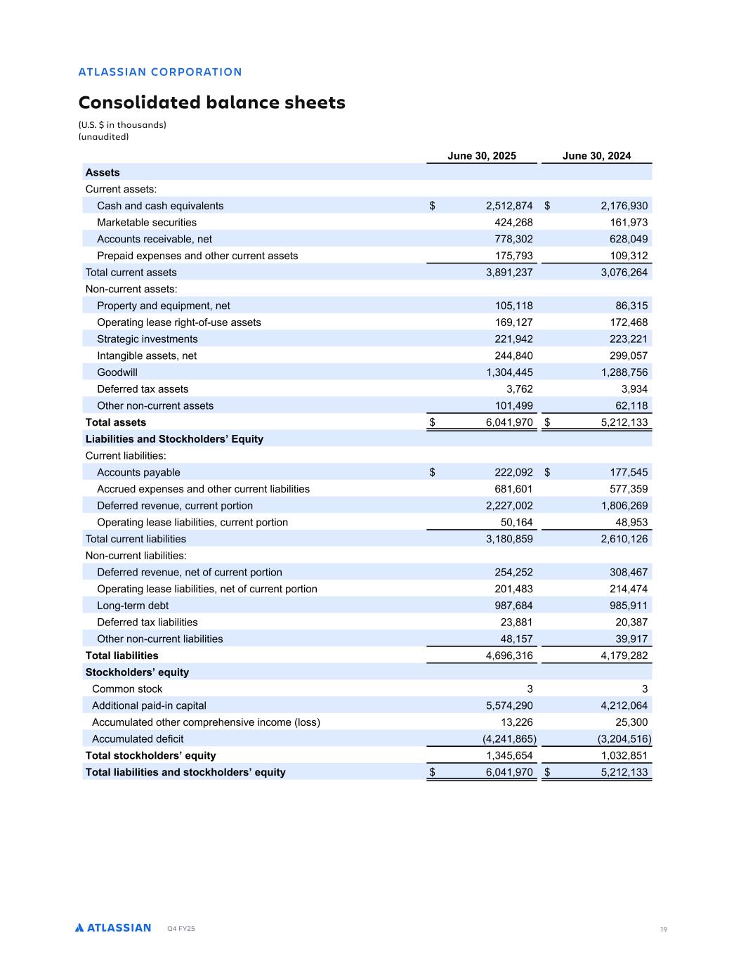 Q4 FY25 19 .S ARR AM 0N ON AS NM 0NMRN DASED A AMCE EESR % % M S NTRAMDR TMATD SED 5TME ( 5TME ( ) .RRESR 3WTTGP C G 0 3C J CPF EC J GSW CNGP ( ( .- ( -, ) CTMG CDNG GEWT G ( (,. , -) 1EE WP TGEG CDNG PG --. ) ( ,(. TGRC F G RGP G CPF JGT EWTTGP C G - - ) ) ( A CN EWTTGP C G ) . ()- ) -, (, P$EWTTGP C G 0 T RGT CPF GSW ROGP PG . ., ) RGTC PI NGC G T IJ $ $W G C G , (- -( ,. TC GI E P G OGP (( ( (() (( 8P CPI DNG C G PG ( . ( - 7 F NN ) (.. - , 4G GTTGF C C G ) -,( ) ) JGT P P$EWTTGP C G ,( . NSA ARRESR , - ( ( )) 6 AB S ER AMD SNCJ N DE RY 2PT S 3WTTGP N CD N G 0 1EE WP RC CDNG ((( ( -- 1EETWGF G RGP G CPF JGT EWTTGP N CD N G ,. , -- ) 4G GTTGF TG GPWG EWTTGP R T P ( ((- ( . , (, RGTC PI NGC G N CD N G EWTTGP R T P , . ) A CN EWTTGP N CD N G ) . . ( , (, P$EWTTGP N CD N G 0 4G GTTGF TG GPWG PG EWTTGP R T P ( ( ( ) . ,- RGTC PI NGC G N CD N G PG EWTTGP R T P ( .) ( - : PI$ GTO FGD .- ,. . 4G GTTGF C N CD N G () .. ( ).- JGT P P$EWTTGP N CD N G . - ) - NSA AB S ER , , ) , - (.( SNCJ N DE RY EPT S 3 OO P EM ) ) 1FF PCN RC F$ P ECR CN - ( ( ( , 1EEWOWNC GF JGT E ORTGJGP G PE OG N ) ((, ( ) 1EEWOWNC GF FG E ( ., ) ( , NSA RSNCJ N DE RY EPT S ) , )( . NSA AB S ER AMD RSNCJ N DE RY EPT S , - ( ( )) - ATLASSIAN CORPORATION Consolidated balance sheets (U.S. $ in thousands) (unaudited)