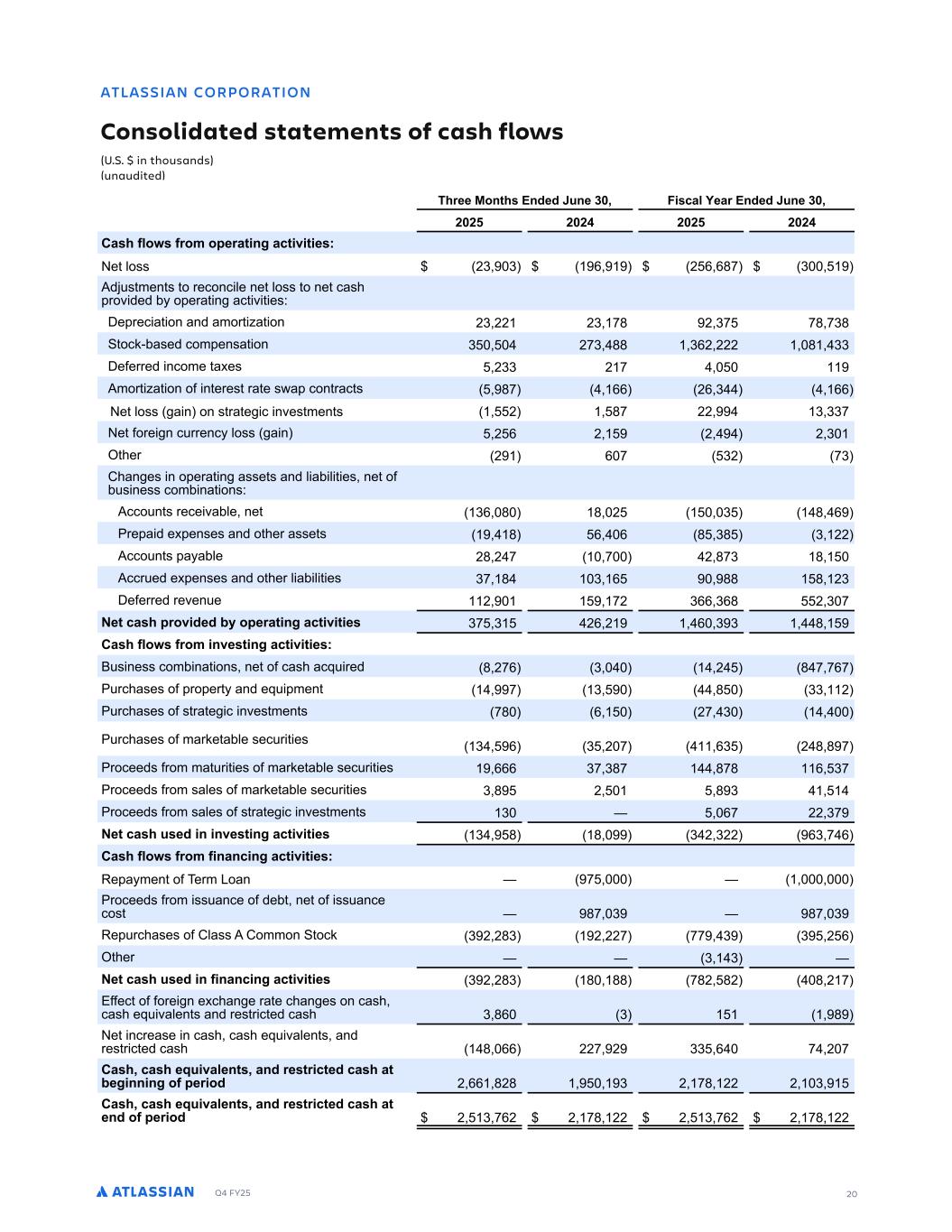Q4 FY25 20 .S ARR AM 0N ON AS NM 0NMRN DASED SASELEMSR NF 0AR 3 N R % % M S NTRAMDR TMATD SED          EE NMS R 2MDED 5TME ( 3 RCA EA 2MDED 5TME ( ) ) 0AR F N R F NL NOE AS MG ACS U S ER- G N () ) , ( , ,.- ) 1FLW OGP TGE PE NG PG N PG EC J RT FGF D RGTC PI CE G 0 4GRTGE C P CPF CO T C P () (( () -. ( )- -. -). EM$DC GF E ORGP C P ) (-) .. ),( ((( . )) 4G GTTGF PE OG C G ()) ( - 1O T C P P GTG TC G CR E P TCE .- ,, (, ) ,, G N IC P P TC GI E P G OGP ( .- (( ) ))- G TG IP EWTTGPE N IC P ( , ( ( ( ) JGT ( , - )( -) 3JCPIG P RGTC PI C G CPF N CD N G PG DW PG E OD PC P 0 1EE WP TGEG CDNG PG ), . . ( ) . , TGRC F G RGP G CPF JGT C G . , , . ). ) (( 1EE WP RC CDNG (. ( - - ( .-) . 1EETWGF G RGP G CPF JGT N CD N G )- . ) , .. . () 4G GTTGF TG GPWG ( -( ),, ),. ( ) - 8ES CAR O NU DED B NOE AS MG ACS U S ER )- ) (, ( , ) ) . 0AR F N R F NL MUERS MG ACS U S ER- 2W PG E OD PC P PG EC J CESW TGF . (-, ) ( . - -,- WTEJC G RT RGT CPF GSW ROGP - ) . )) ( WTEJC G TC GI E P G OGP -. , (- ) WTEJC G OCTMG CDNG GEWT G ) , ) ( - ,) ( . . - T EGGF T O OC WT G OCTMG CDNG GEWT G ,,, )- ).- .-. , )- T EGGF T O CNG OCTMG CDNG GEWT G ) . ( . ) T EGGF T O CNG TC GI E P G OGP ) ,- (( )- 8ES CAR TRED M MUERS MG ACS U S ER ) . . ) ( )(( ,) - , 0AR F N R F NL F MAMC MG ACS U S ER- GRC OGP AGTO : CP - T EGGF T O WCPEG FGD PG WCPEG E .- ) .- ) GRWTEJC G 3NC 1 3 OO P EM ) ( (.) ( ((- -- ) ) ( , JGT ) ) 8ES CAR TRED M F MAMC MG ACS U S ER ) ( (.) . .. -.( .( . ( - 5 GE TG IP G EJCPIG TC G EJCPIG P EC J EC J GSW CNGP CPF TG T E GF EC J ) ., ) . G PETGC G P EC J EC J GSW CNGP CPF TG T E GF EC J . ,, ((- ( )) , - ( - 0AR CAR EPT UA EMSR AMD ERS CSED CAR AS BEG MM MG NF OE ND ( ,, .(. ) ( -. (( ( ) 0AR CAR EPT UA EMSR AMD ERS CSED CAR AS EMD NF OE ND ( ) -,( ( -. (( ( ) -,( ( -. (( . ATLASSIAN CORPORATION Consolidated statements of cash flows (U.S. $ in thousands) (unaudited)