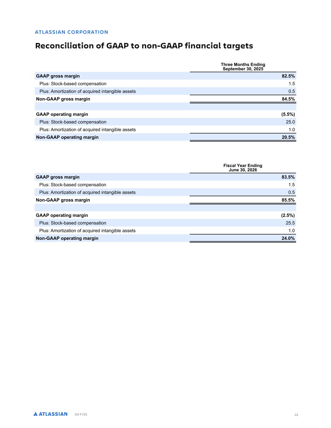 Q4 FY25 22 ATLASSIAN CORPORATION Reconciliation of GAAP to non-GAAP financial targets .S ARR AM 0N ON AS NM ECNMC AS NM NF 4..: SN 8NM$4..: 3 MAMC A A GESR EE NMS R 2MD MG EOSELBE ( 4..: G NRR LA G M , % NW 0 EM$DC GF E ORGP C P % NW 0 1O T C P CESW TGF P CPI DNG C G % 8NM$4..: G NRR LA G M ,)% 4..: NOE AS MG LA G M % NW 0 EM$DC GF E ORGP C P ( % NW 0 1O T C P CESW TGF P CPI DNG C G % 8NM$4..: NOE AS MG LA G M %  3 RCA EA 2MD MG 5TME ( 4..: G NRR LA G M ,(% NW 0 EM$DC GF E ORGP C P % NW 0 1O T C P CESW TGF P CPI DNG C G % 8NM$4..: G NRR LA G M , % 4..: NOE AS MG LA G M % NW 0 EM$DC GF E ORGP C P ( % NW 0 1O T C P CESW TGF P CPI DNG C G % 8NM$4..: NOE AS MG LA G M )%