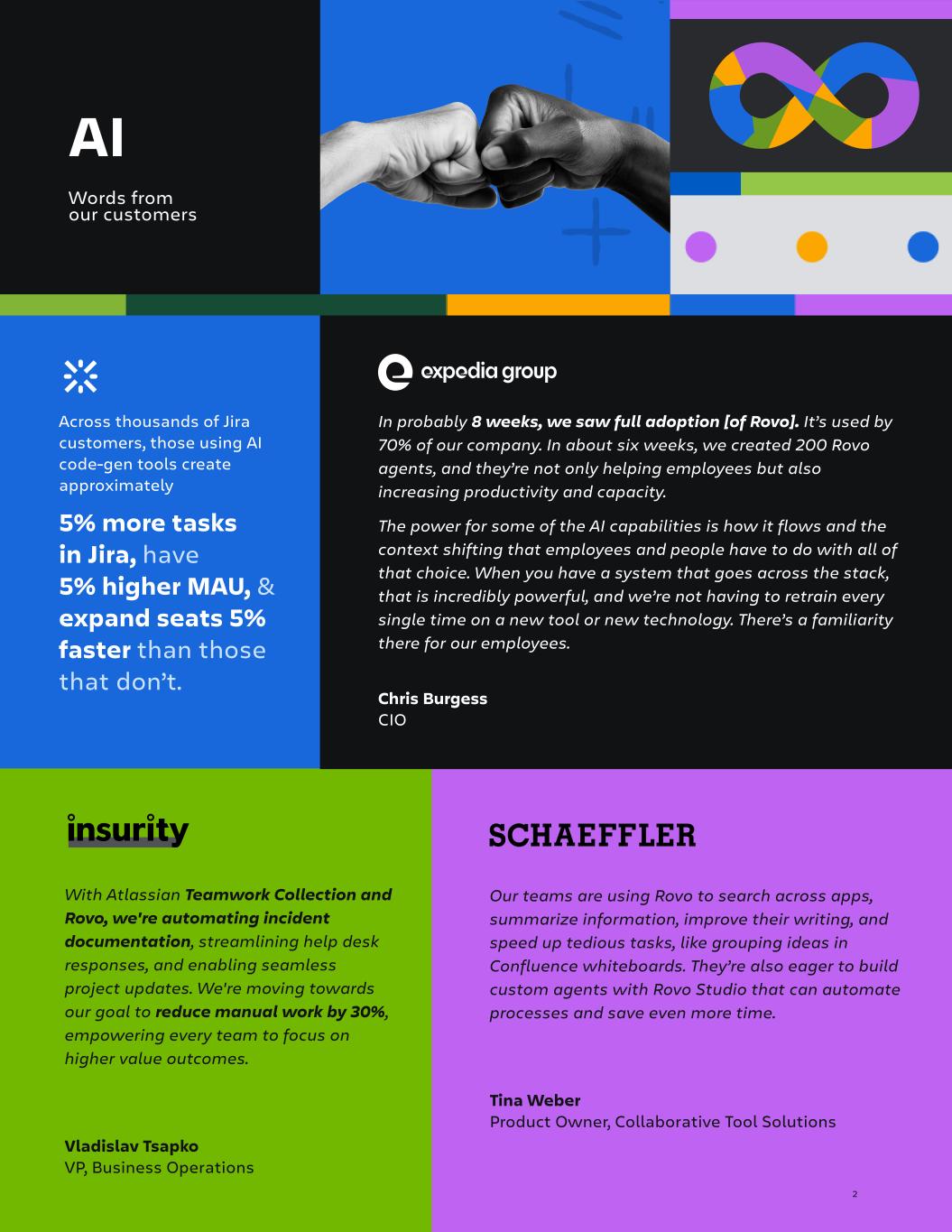 Q2 FY26 2 In probably 8 weeks, we saw full adoption [of Rovo]. It’s used by 70% of our company. In about six weeks, we created 200 Rovo agents, and they’re not only helping employees but also increasing productivity and capacity. The power for some of the AI capabilities is how it flows and the context shifting that employees and people have to do with all of that choice. When you have a system that goes across the stack, that is incredibly powerful, and we’re not having to retrain every single time on a new tool or new technology. There’s a familiarity there for our employees. Chris Burgess CIO With Atlassian Teamwork Collection and Rovo, we're automating incident documentation, streamlining help desk responses, and enabling seamless project updates. We're moving towards our goal to reduce manual work by 30%, empowering every team to focus on higher value outcomes. Vladislav Tsapko VP, Business Operations Our teams are using Rovo to search across apps, summarize information, improve their writing, and speed up tedious tasks, like grouping ideas in Confluence whiteboards. They’re also eager to build custom agents with Rovo Studio that can automate processes and save even more time. Tina Weber Product Owner, Collaborative Tool Solutions Across thousands of Jira customers, those using AI code-gen tools create approximately 5% more tasks in Jira, have 5% higher MAU, & expand seats 5% faster than those that don’t. AI Words from our customers