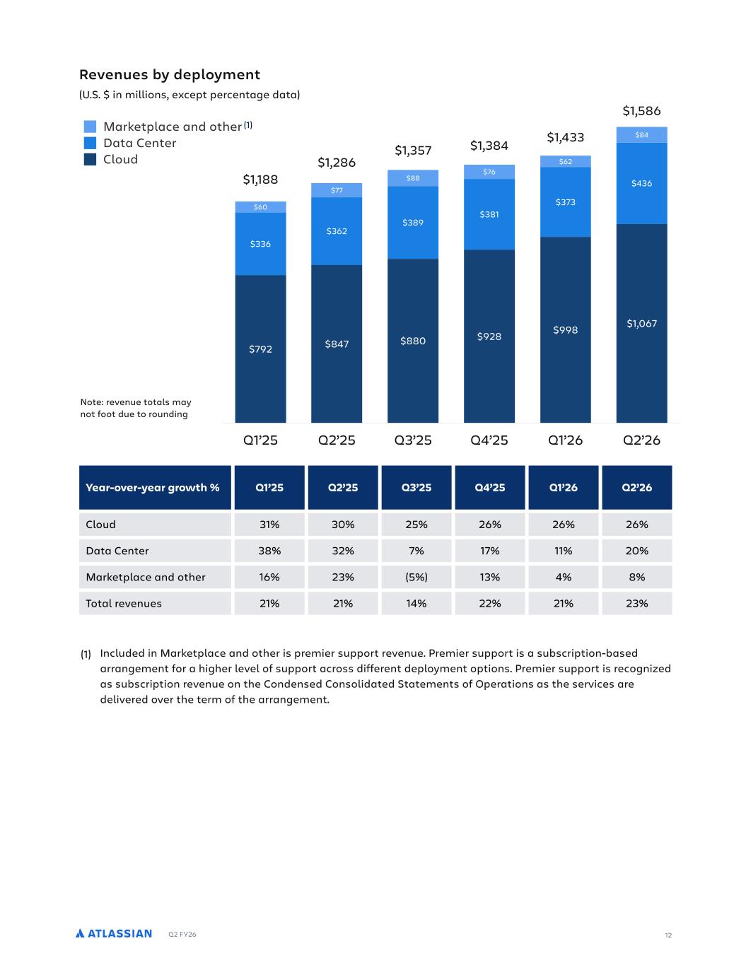 Q2 FY26 12 Revenues by deployment (U.S. $ in millions, except percentage data) Included in Marketplace and other is premier support revenue. Premier support is a subscription-based arrangement for a higher level of support across different deployment options. Premier support is recognized as subscription revenue on the Condensed Consolidated Statements of Operations as the services are delivered over the term of the arrangement. (1) 3 Note: revenue totals may not foot due to rounding Q1’25 Q2’25 Q3’25 Q4’25 Q1’26 Q2’26 $84 $62 $76 $88 $77 $60 $436 $373 $381 $389 $362 $336 $1,067$998$928$880$847$792 Cloud Data Center Marketplace and other $1,586 $1,433$1,384$1,357 $1,286 $1,188 (1) Year-over-year growth % Q1’25 Q2’25 Q3’25 Q4’25 Q1’26 Q2’26 Cloud 31% 30% 25% 26% 26% 26% Data Center 38% 32% 7% 17% 11% 20% Marketplace and other 16% 23% (5%) 13% 4% 8% Total revenues 21% 21% 14% 22% 21% 23%