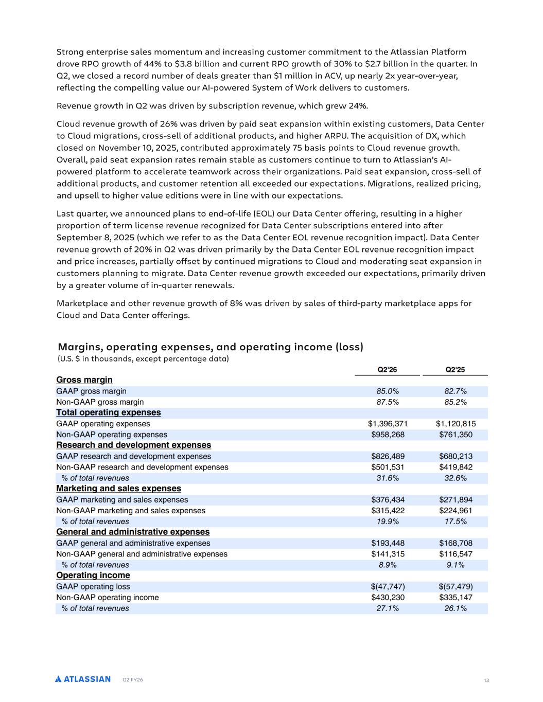 Q2 FY26 13 Strong enterprise sales momentum and increasing customer commitment to the Atlassian Platform drove RPO growth of 44% to $3.8 billion and current RPO growth of 30% to $2.7 billion in the quarter. In Q2, we closed a record number of deals greater than $1 million in ACV, up nearly 2x year-over-year, reflecting the compelling value our AI-powered System of Work delivers to customers. Revenue growth in Q2 was driven by subscription revenue, which grew 24%. Cloud revenue growth of 26% was driven by paid seat expansion within existing customers, Data Center to Cloud migrations, cross-sell of additional products, and higher ARPU. The acquisition of DX, which closed on November 10, 2025, contributed approximately 75 basis points to Cloud revenue growth. Overall, paid seat expansion rates remain stable as customers continue to turn to Atlassian’s AI- powered platform to accelerate teamwork across their organizations. Paid seat expansion, cross-sell of additional products, and customer retention all exceeded our expectations. Migrations, realized pricing, and upsell to higher value editions were in line with our expectations. Last quarter, we announced plans to end-of-life (EOL) our Data Center offering, resulting in a higher proportion of term license revenue recognized for Data Center subscriptions entered into after September 8, 2025 (which we refer to as the Data Center EOL revenue recognition impact). Data Center revenue growth of 20% in Q2 was driven primarily by the Data Center EOL revenue recognition impact and price increases, partially offset by continued migrations to Cloud and moderating seat expansion in customers planning to migrate. Data Center revenue growth exceeded our expectations, primarily driven by a greater volume of in-quarter renewals. Marketplace and other revenue growth of 8% was driven by sales of third-party marketplace apps for Cloud and Data Center offerings. Margins, operating expenses, and operating income (loss) (U.S. $ in thousands, except percentage data)