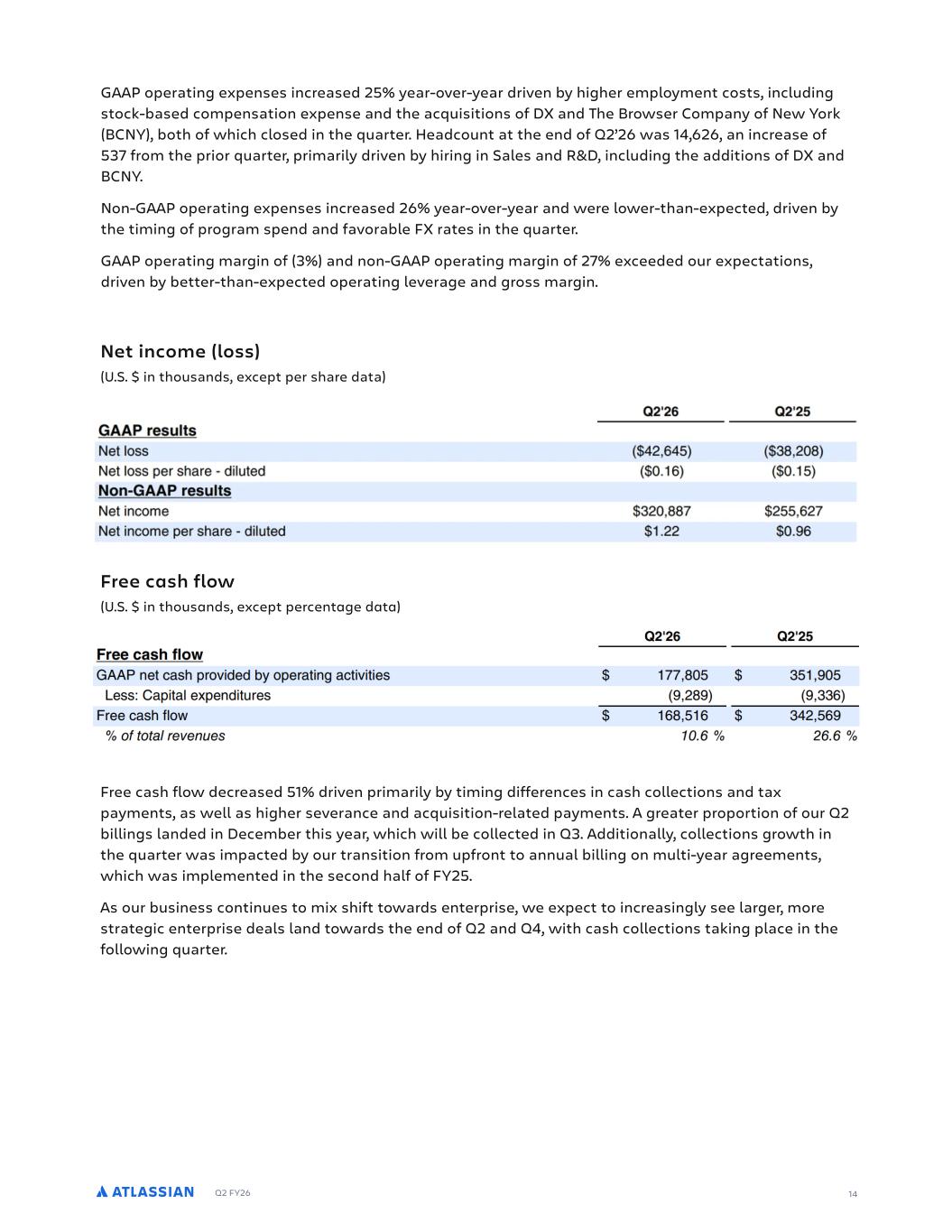 Q2 FY26 14 GAAP operating expenses increased 25% year-over-year driven by higher employment costs, including stock-based compensation expense and the acquisitions of DX and The Browser Company of New York (BCNY), both of which closed in the quarter. Headcount at the end of Q2’26 was 14,626, an increase of 537 from the prior quarter, primarily driven by hiring in Sales and R&D, including the additions of DX and BCNY. Non-GAAP operating expenses increased 26% year-over-year and were lower-than-expected, driven by the timing of program spend and favorable FX rates in the quarter. GAAP operating margin of (3%) and non-GAAP operating margin of 27% exceeded our expectations, driven by better-than-expected operating leverage and gross margin. Net income (loss) (U.S. $ in thousands, except per share data) Free cash flow (U.S. $ in thousands, except percentage data) Free cash flow decreased 51% driven primarily by timing differences in cash collections and tax payments, as well as higher severance and acquisition-related payments. A greater proportion of our Q2 billings landed in December this year, which will be collected in Q3. Additionally, collections growth in the quarter was impacted by our transition from upfront to annual billing on multi-year agreements, which was implemented in the second half of FY25. As our business continues to mix shift towards enterprise, we expect to increasingly see larger, more strategic enterprise deals land towards the end of Q2 and Q4, with cash collections taking place in the following quarter.