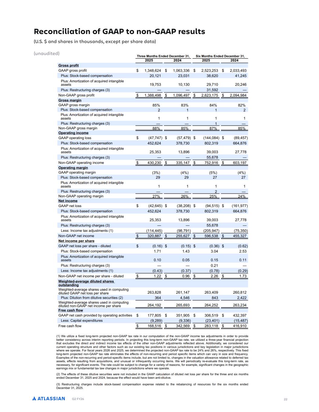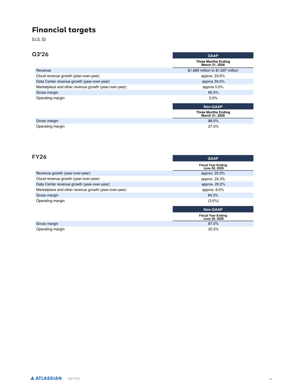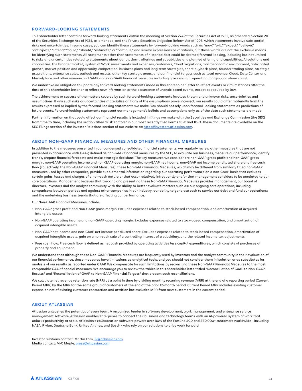 Q2 FY26 24 FORWARD-LOOKING STATEMENTS This shareholder letter contains forward-looking statements within the meaning of Section 27A of the Securities Act of 1933, as amended, Section 21E of the Securities Exchange Act of 1934, as amended, and the Private Securities Litigation Reform Act of 1995, which statements involve substantial risks and uncertainties. In some cases, you can identify these statements by forward-looking words such as “may,” “will,” “expect,” “believe,” “anticipate,” “intend,” “could,” “should,” “estimate,” or “continue,” and similar expressions or variations, but these words are not the exclusive means for identifying such statements. All statements other than statements of historical fact could be deemed forward-looking, including but not limited to risks and uncertainties related to statements about our platform, offerings and capabilities and planned offering and capabilities, AI solutions and capabilities, the broader market, System of Work, investments and expenses, customers, Cloud migrations, macroeconomic environment, anticipated growth, market position and opportunity, competition, business plans and long term strategies, share buyback plans, founder trading plans, strategic acquisitions, enterprise sales, outlook and results, other key strategic areas, and our financial targets such as total revenue, Cloud, Data Center, and Marketplace and other revenue and GAAP and non-GAAP financial measures including gross margin, operating margin, and share count. We undertake no obligation to update any forward-looking statements made in this shareholder letter to reflect events or circumstances after the date of this shareholder letter or to reflect new information or the occurrence of unanticipated events, except as required by law. The achievement or success of the matters covered by such forward-looking statements involves known and unknown risks, uncertainties and assumptions. If any such risks or uncertainties materialize or if any of the assumptions prove incorrect, our results could differ materially from the results expressed or implied by the forward-looking statements we make. You should not rely upon forward-looking statements as predictions of future events. Forward-looking statements represent our management’s beliefs and assumptions only as of the date such statements are made. Further information on that could affect our financial results is included in filings we make with the Securities and Exchange Commission (the SEC) from time to time, including the section titled “Risk Factors” in our most recently filed Forms 10-K and 10-Q. These documents are available on the SEC Filings section of the Investor Relations section of our website at: https://investors.atlassian.com. ABOUT NON-GAAP FINANCIAL MEASURES AND OTHER FINANCIAL MEASURES In addition to the measures presented in our condensed consolidated financial statements, we regularly review other measures that are not presented in accordance with GAAP, defined as non-GAAP financial measures by the SEC, to evaluate our business, measure our performance, identify trends, prepare financial forecasts and make strategic decisions. The key measures we consider are non-GAAP gross profit and non-GAAP gross margin, non-GAAP operating income and non-GAAP operating margin, non-GAAP net income, non-GAAP net income per diluted share and free cash flow (collectively, the Non-GAAP Financial Measures). These Non-GAAP Financial Measures, which may be different from similarly titled non-GAAP measures used by other companies, provide supplemental information regarding our operating performance on a non-GAAP basis that excludes certain gains, losses and charges of a non-cash nature or that occur relatively infrequently and/or that management considers to be unrelated to our core operations. Management believes that tracking and presenting these Non-GAAP Financial Measures provides management, our board of directors, investors and the analyst community with the ability to better evaluate matters such as: our ongoing core operations, including comparisons between periods and against other companies in our industry; our ability to generate cash to service our debt and fund our operations; and the underlying business trends that are affecting our performance. Our Non-GAAP Financial Measures include: • Non-GAAP gross profit and Non-GAAP gross margin. Excludes expenses related to stock-based compensation, and amortization of acquired intangible assets. • Non-GAAP operating income and non-GAAP operating margin. Excludes expenses related to stock-based compensation, and amortization of acquired intangible assets. • Non-GAAP net income and non-GAAP net income per diluted share. Excludes expenses related to stock-based compensation, amortization of acquired intangible assets, gain on a non-cash sale of a controlling interest of a subsidiary, and the related income tax adjustments. • Free cash flow. Free cash flow is defined as net cash provided by operating activities less capital expenditures, which consists of purchases of property and equipment. We understand that although these Non-GAAP Financial Measures are frequently used by investors and the analyst community in their evaluation of our financial performance, these measures have limitations as analytical tools, and you should not consider them in isolation or as substitutes for analysis of our results as reported under GAAP. We compensate for such limitations by reconciling these Non-GAAP Financial Measures to the most comparable GAAP financial measures. We encourage you to review the tables in this shareholder letter titled “Reconciliation of GAAP to Non-GAAP Results” and “Reconciliation of GAAP to Non-GAAP Financial Targets” that present such reconciliations. We calculate net revenue retention rate (NRR) at a point in time by dividing monthly recurring revenue (MRR) at the end of a reporting period (Current Perio