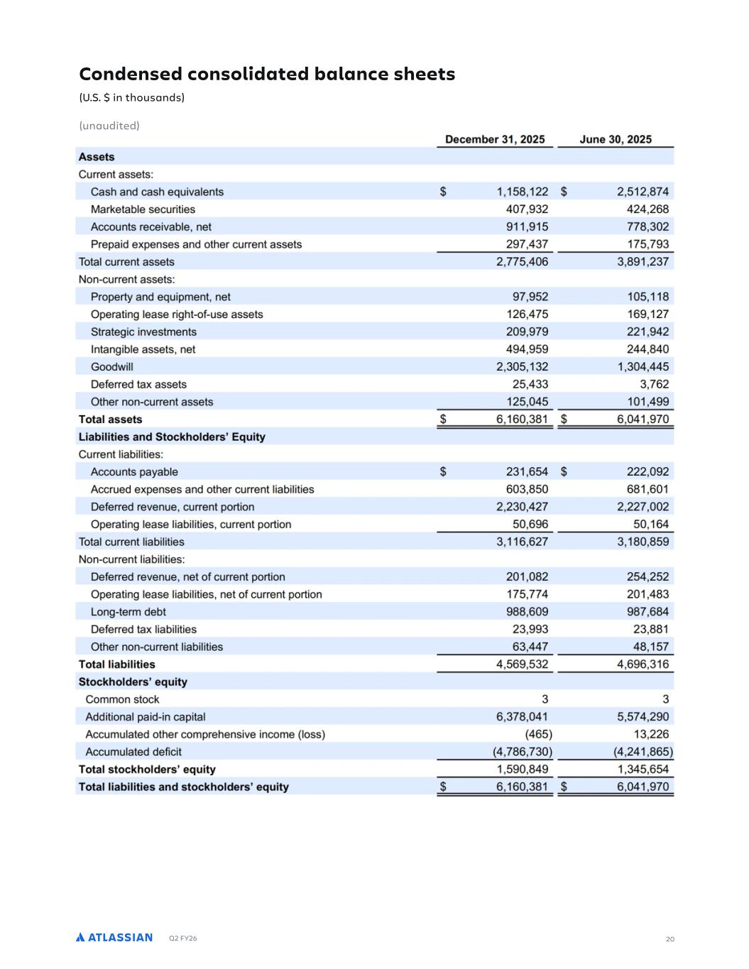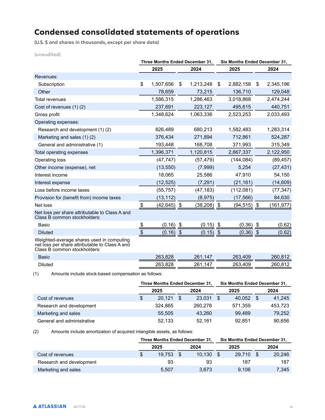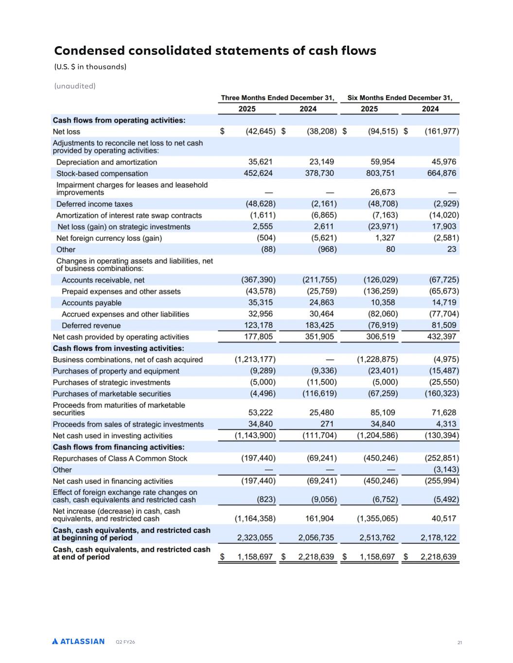 Q2 FY26 24 FORWARD-LOOKING STATEMENTS This shareholder letter contains forward-looking statements within the meaning of Section 27A of the Securities Act of 1933, as amended, Section 21E of the Securities Exchange Act of 1934, as amended, and the Private Securities Litigation Reform Act of 1995, which statements involve substantial risks and uncertainties. In some cases, you can identify these statements by forward-looking words such as “may,” “will,” “expect,” “believe,” “anticipate,” “intend,” “could,” “should,” “estimate,” or “continue,” and similar expressions or variations, but these words are not the exclusive means for identifying such statements. All statements other than statements of historical fact could be deemed forward-looking, including but not limited to risks and uncertainties related to statements about our platform, offerings and capabilities and planned offering and capabilities, AI solutions and capabilities, the broader market, System of Work, investments and expenses, customers, Cloud migrations, macroeconomic environment, anticipated growth, market position and opportunity, competition, business plans and long term strategies, share buyback plans, founder trading plans, strategic acquisitions, enterprise sales, outlook and results, other key strategic areas, and our financial targets such as total revenue, Cloud, Data Center, and Marketplace and other revenue and GAAP and non-GAAP financial measures including gross margin, operating margin, and share count. We undertake no obligation to update any forward-looking statements made in this shareholder letter to reflect events or circumstances after the date of this shareholder letter or to reflect new information or the occurrence of unanticipated events, except as required by law. The achievement or success of the matters covered by such forward-looking statements involves known and unknown risks, uncertainties and assumptions. If any such risks or uncertainties materialize or if any of the assumptions prove incorrect, our results could differ materially from the results expressed or implied by the forward-looking statements we make. You should not rely upon forward-looking statements as predictions of future events. Forward-looking statements represent our management’s beliefs and assumptions only as of the date such statements are made. Further information on that could affect our financial results is included in filings we make with the Securities and Exchange Commission (the SEC) from time to time, including the section titled “Risk Factors” in our most recently filed Forms 10-K and 10-Q. These documents are available on the SEC Filings section of the Investor Relations section of our website at: https://investors.atlassian.com. ABOUT NON-GAAP FINANCIAL MEASURES AND OTHER FINANCIAL MEASURES In addition to the measures presented in our condensed consolidated financial statements, we regularly review other measures that are not presented in accordance with GAAP, defined as non-GAAP financial measures by the SEC, to evaluate our business, measure our performance, identify trends, prepare financial forecasts and make strategic decisions. The key measures we consider are non-GAAP gross profit and non-GAAP gross margin, non-GAAP operating income and non-GAAP operating margin, non-GAAP net income, non-GAAP net income per diluted share and free cash flow (collectively, the Non-GAAP Financial Measures). These Non-GAAP Financial Measures, which may be different from similarly titled non-GAAP measures used by other companies, provide supplemental information regarding our operating performance on a non-GAAP basis that excludes certain gains, losses and charges of a non-cash nature or that occur relatively infrequently and/or that management considers to be unrelated to our core operations. Management believes that tracking and presenting these Non-GAAP Financial Measures provides management, our board of directors, investors and the analyst community with the ability to better evaluate matters such as: our ongoing core operations, including comparisons between periods and against other companies in our industry; our ability to generate cash to service our debt and fund our operations; and the underlying business trends that are affecting our performance. Our Non-GAAP Financial Measures include: • Non-GAAP gross profit and Non-GAAP gross margin. Excludes expenses related to stock-based compensation, and amortization of acquired intangible assets. • Non-GAAP operating income and non-GAAP operating margin. Excludes expenses related to stock-based compensation, and amortization of acquired intangible assets. • Non-GAAP net income and non-GAAP net income per diluted share. Excludes expenses related to stock-based compensation, amortization of acquired intangible assets, gain on a non-cash sale of a controlling interest of a subsidiary, and the related income tax adjustments. • Free cash flow. Free cash flow is defined as net cash provided by operating activities less capital expenditures, which consists of purchases of property and equipment. We understand that although these Non-GAAP Financial Measures are frequently used by investors and the analyst community in their evaluation of our financial performance, these measures have limitations as analytical tools, and you should not consider them in isolation or as substitutes for analysis of our results as reported under GAAP. We compensate for such limitations by reconciling these Non-GAAP Financial Measures to the most comparable GAAP financial measures. We encourage you to review the tables in this shareholder letter titled “Reconciliation of GAAP to Non-GAAP Results” and “Reconciliation of GAAP to Non-GAAP Financial Targets” that present such reconciliations. We calculate net revenue retention rate (NRR) at a point in time by dividing monthly recurring revenue (MRR) at the end of a reporting period (Current Perio