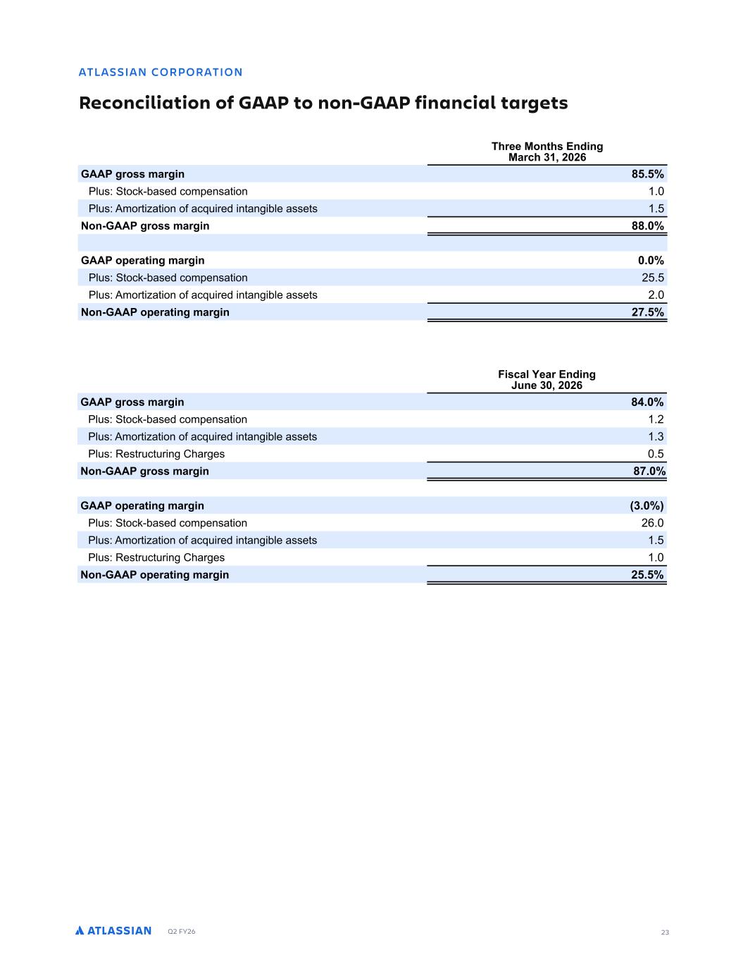 Q2 FY26 23 ATLASSIAN CORPORATION Reconciliation of GAAP to non-GAAP financial targets 0UMCTT CO 2PS PSCU PO GEPOE M CU PO P 600 UP :PO$600 5 OCOE CM CS GUT JSGG POUJT 4OF O CSEJ ) ( (, 600 SPTT NCS O . % M T0 PDL$CBTFE DPN FOTB PO % M T0 1NPS B PO PG BDR SFE O BO CMF BTTF T % :PO$600 SPTT NCS O ..% 600 P GSCU O NCS O % M T0 PDL$CBTFE DPN FOTB PO ( % M T0 1NPS B PO PG BDR SFE O BO CMF BTTF T (% :PO$600 P GSCU O NCS O (-% 5 TECM BGCS 4OF O 7 OG ) ( (, 600 SPTT NCS O . % M T0 PDL$CBTFE DPN FOTB PO %( M T0 1NPS B PO PG BDR SFE O BO CMF BTTF T %) M T0 FT S D S O 3IBS FT % :PO$600 SPTT NCS O .-% 600 P GSCU O NCS O )% M T0 PDL$CBTFE DPN FOTB PO (,% M T0 1NPS B PO PG BDR SFE O BO CMF BTTF T % M T0 FT S D S O 3IBS FT % :PO$600 P GSCU O NCS O ( % (